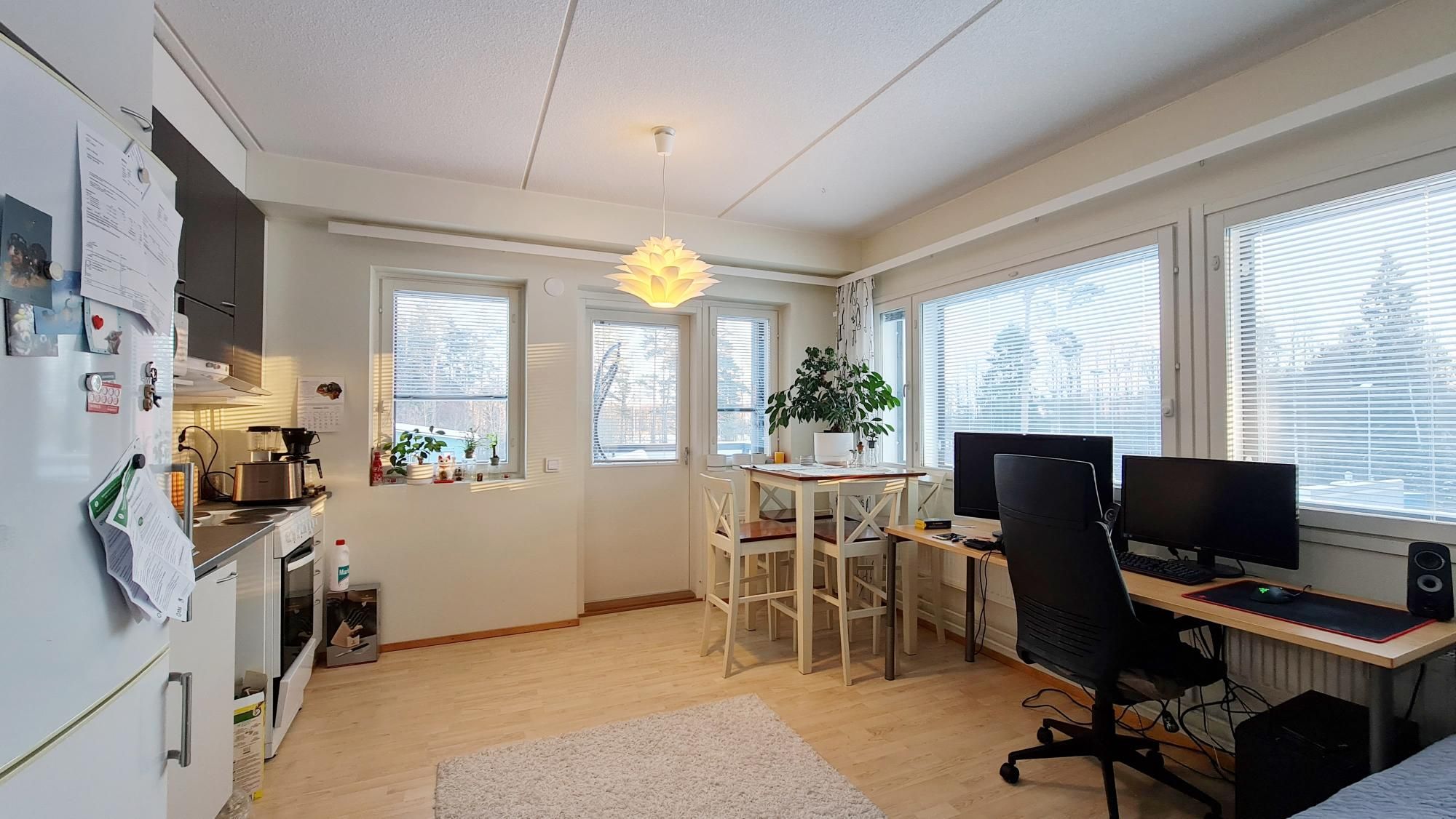 Taloyhtiössä hissi. Kyseessä kulmahuoneisto itä länsi suuntaisesti.