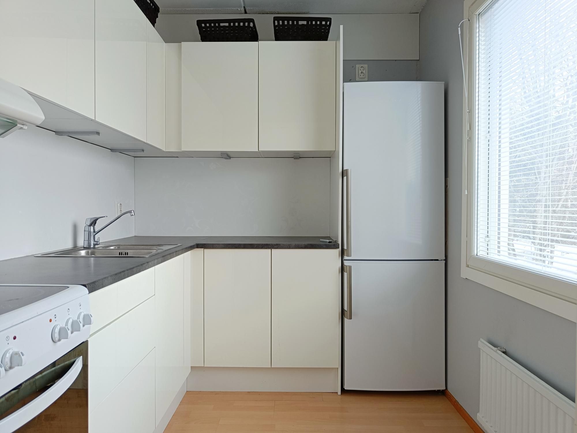 Asunnossa tehty pintaremontti, jonka yhteydessä vaihdettu keittiönkaapistot sekä jääkaappi/pakastin ja liesi.