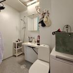 Lattiat laminaattia ja seinät maalattu/tapettia. Tilava kylpyhuone, johon kylpyhuonekalusteet uusittu, juuri uusittu muovimatto lattiassa, tila ja liitäntä pyykinpesukoneelle.
