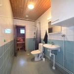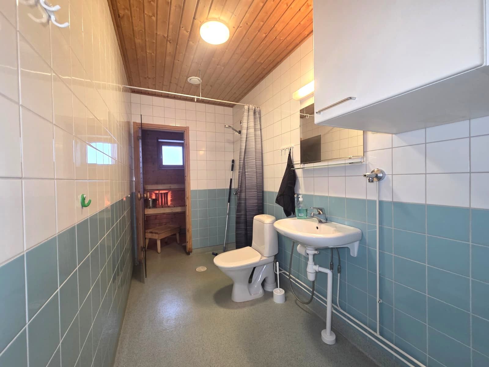 Kylpyhuone kaakeloitu ja siellä pesukoneliitäntä ja suihku. Kuvissa näkyvä astianpesukone ei kuulu asunnon varustukseen.