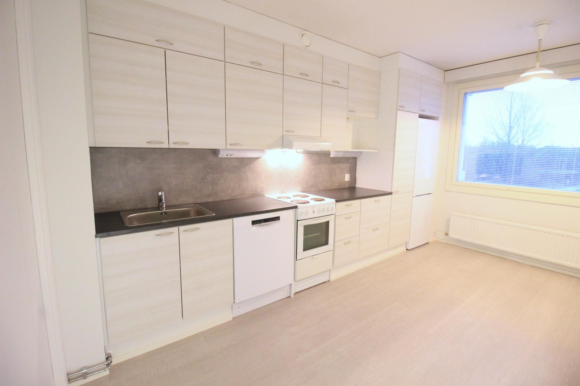 Keittiössä jää/pakastinkaappi, liesi, liesituuletin ja astianpesukone.