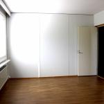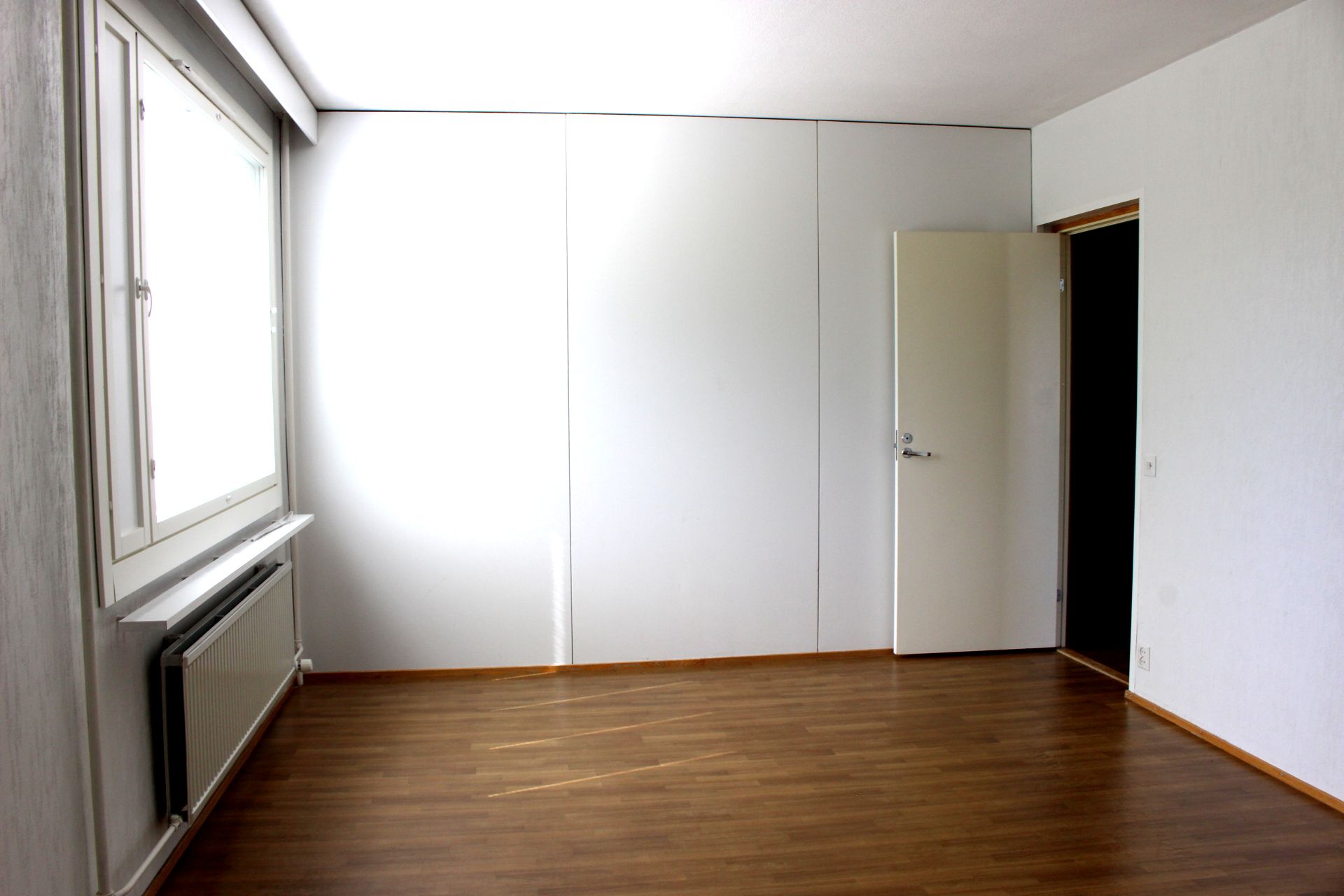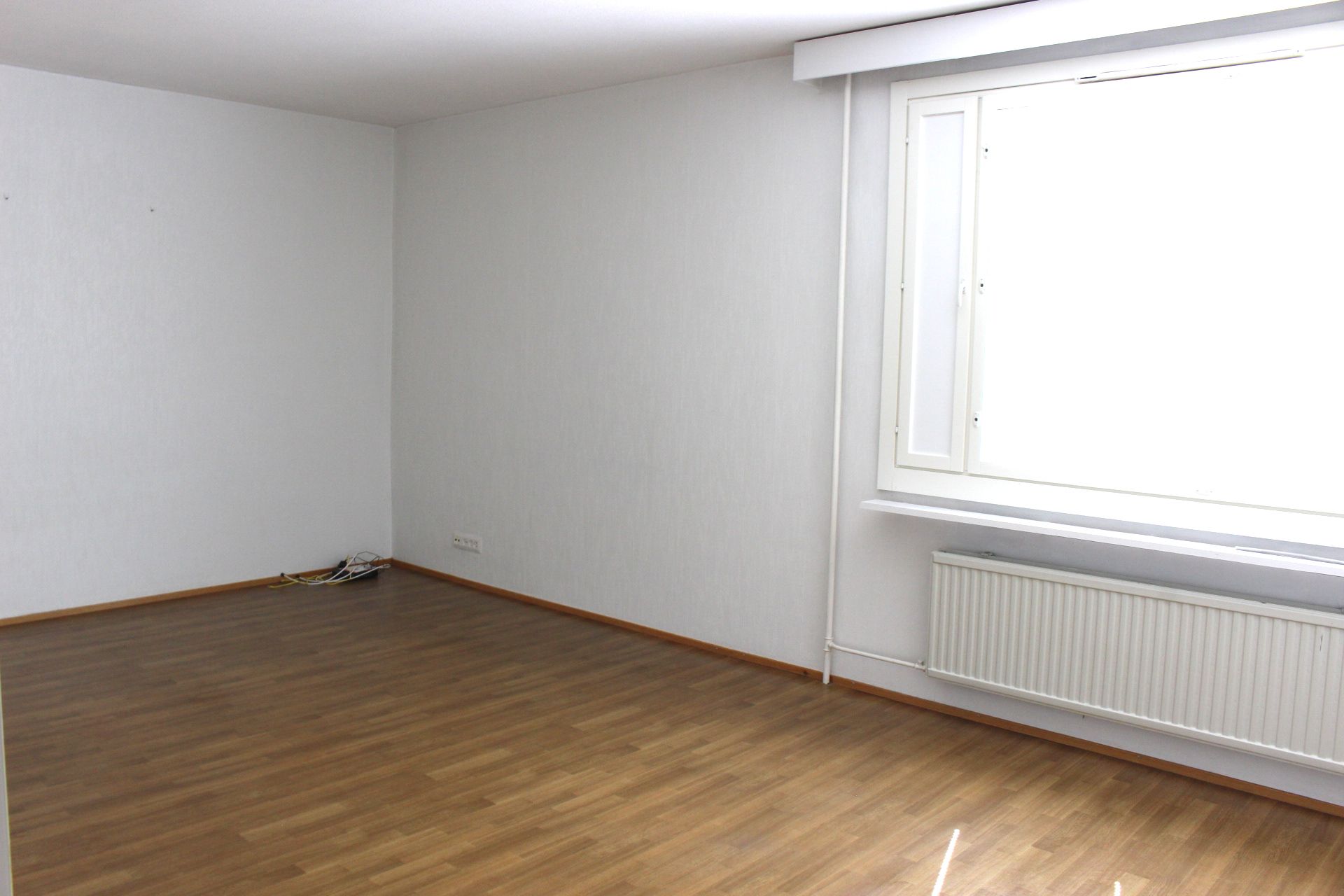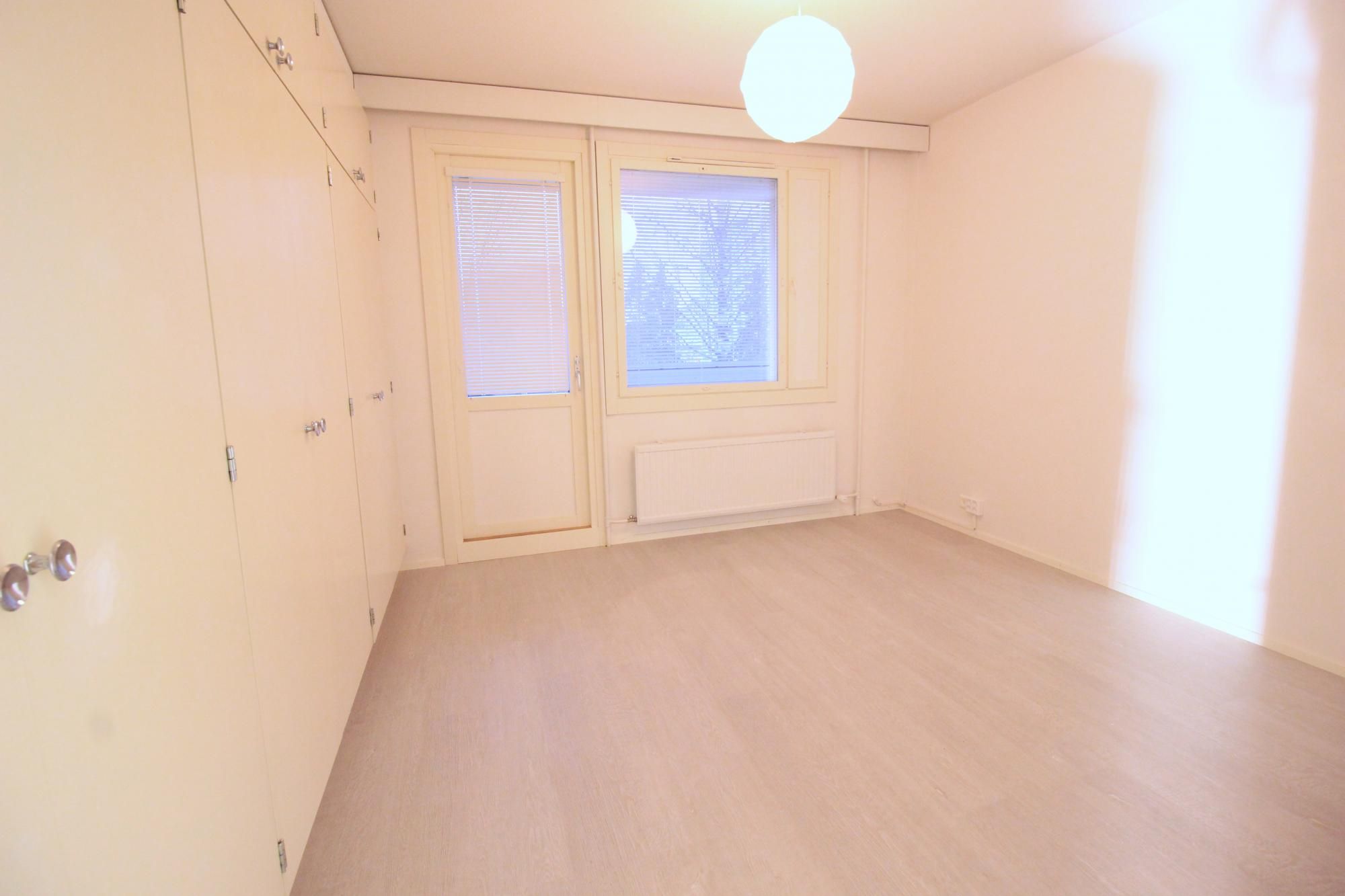 Laminaattilattiat, seinät maalipinnoin, ikkunoissa sälekaihtimet.