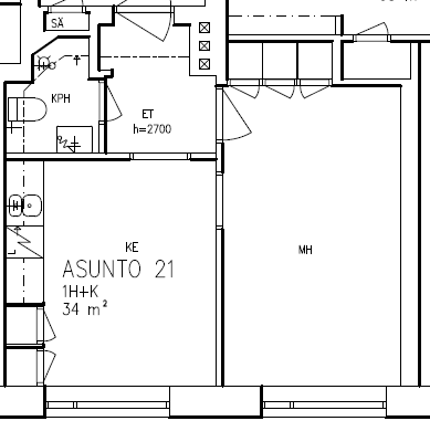Kerrostalo, 34 m², 1h + k + kh