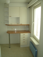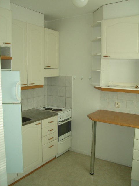Keittiökaapit vaihdettu 2000-luvun alussa. Keittokomerossa jääkaappi ja liesi.