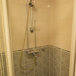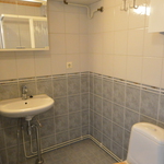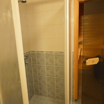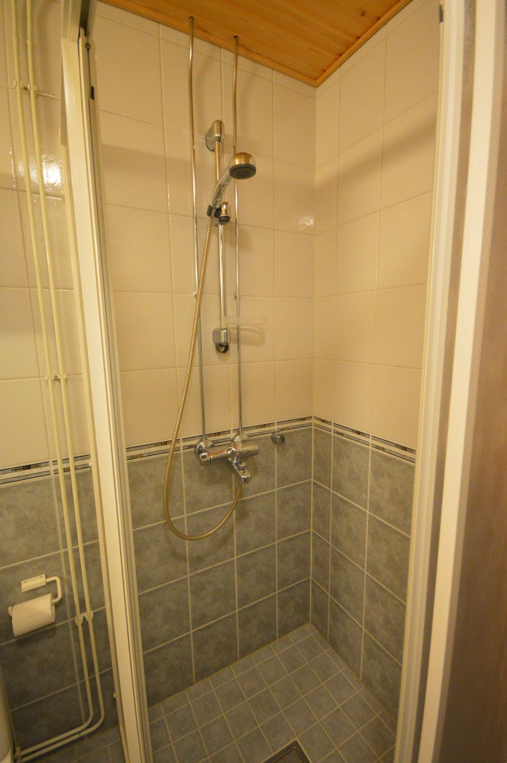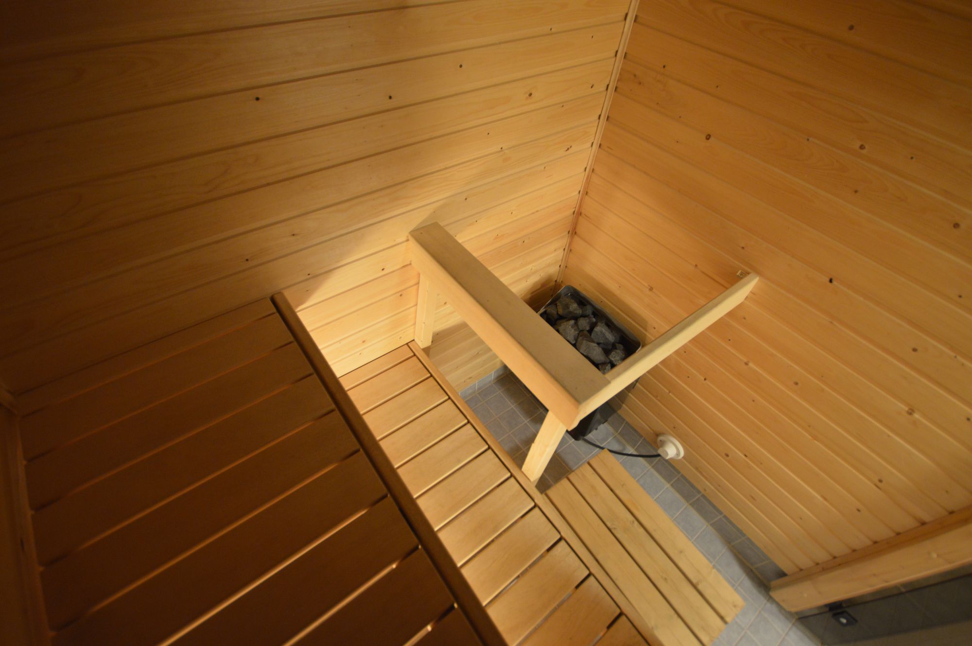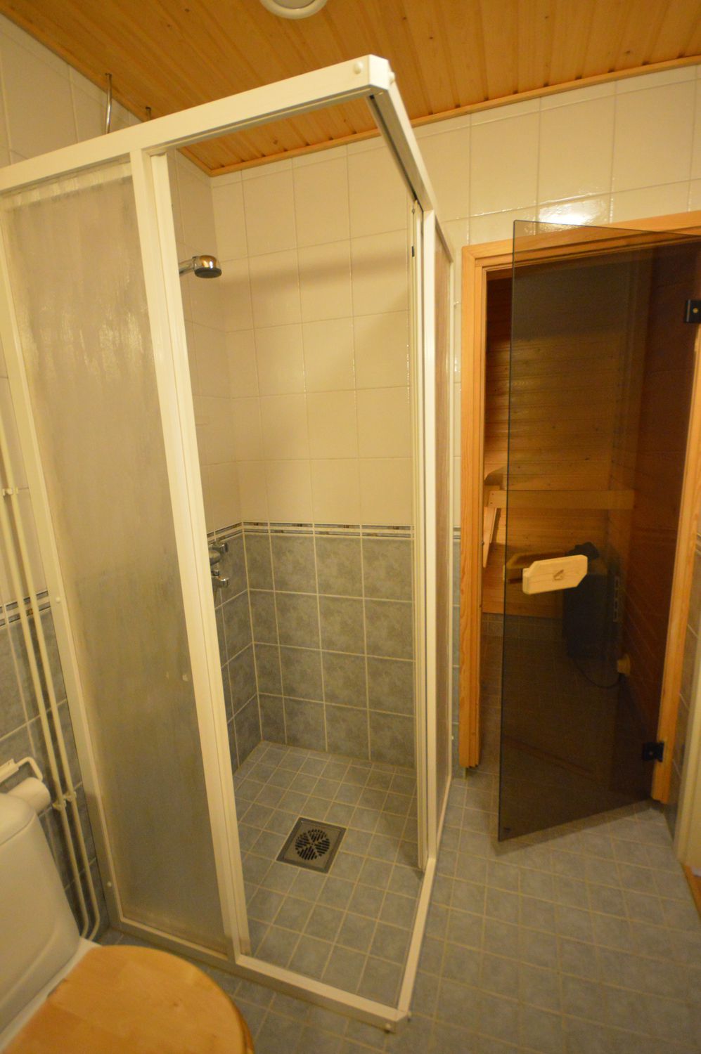 Tilava kaakeloitu kylpyhuone, jossa paikka pesukoneelle ja oma sauna.