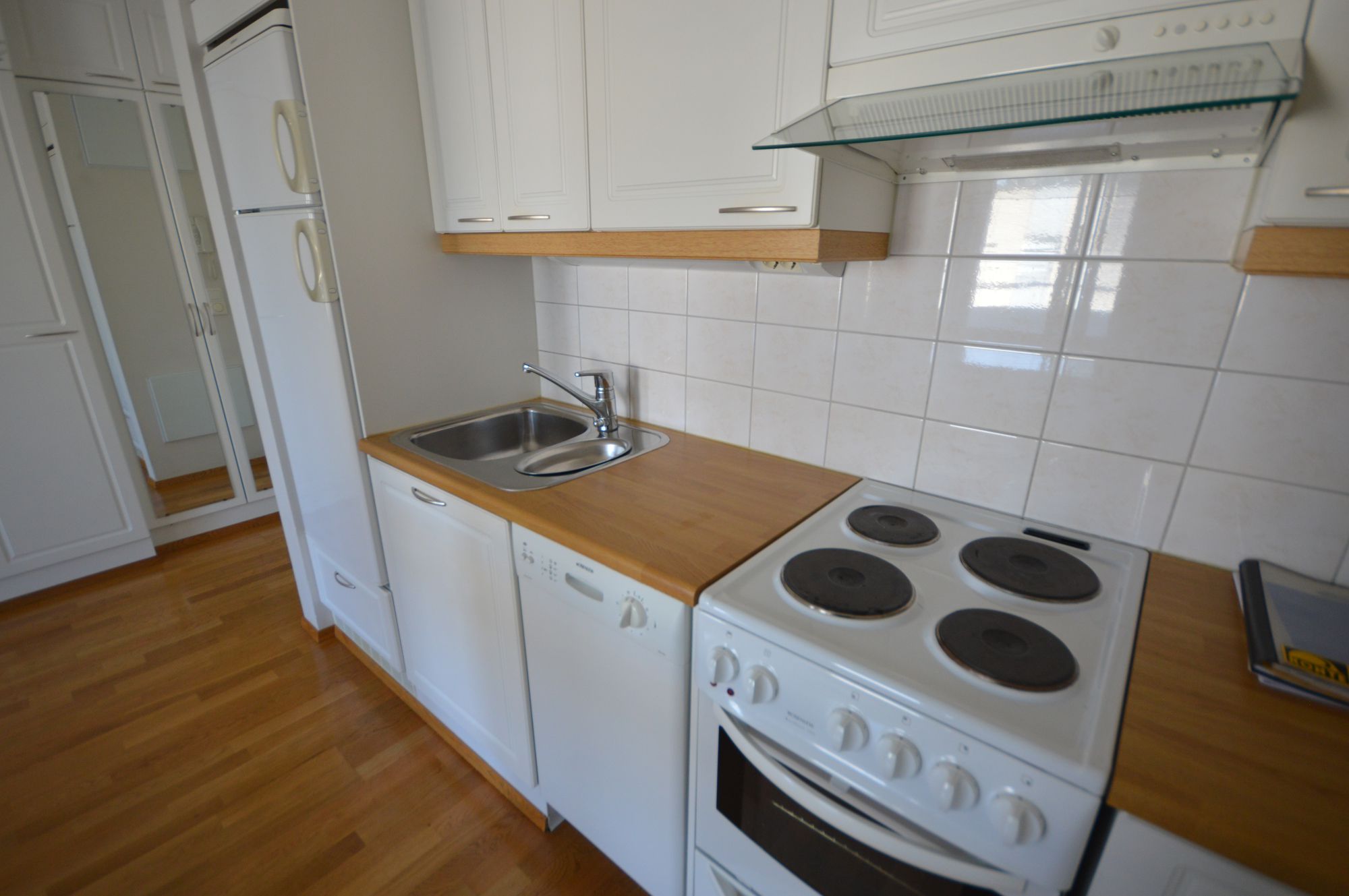 Hissi maan tasalta. Huoneistossa parkettilattia, keittiössä siistit kaapistot ja astianpesukone.