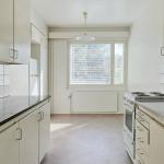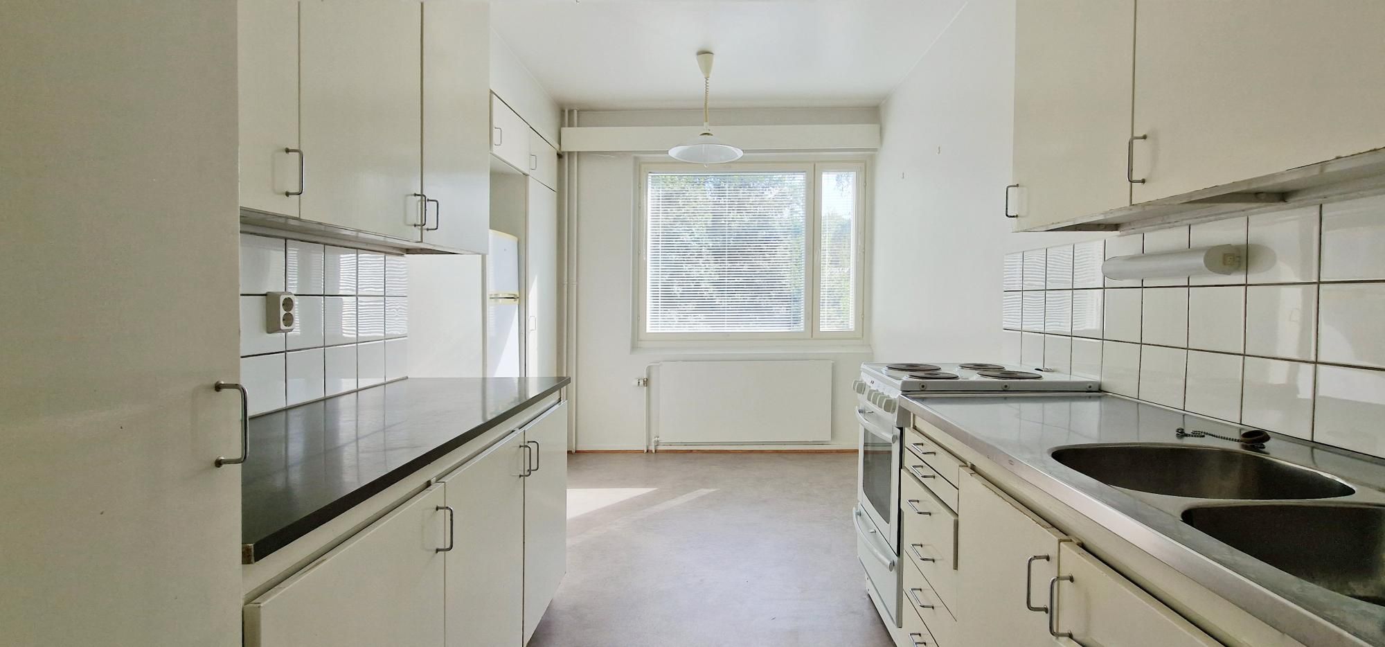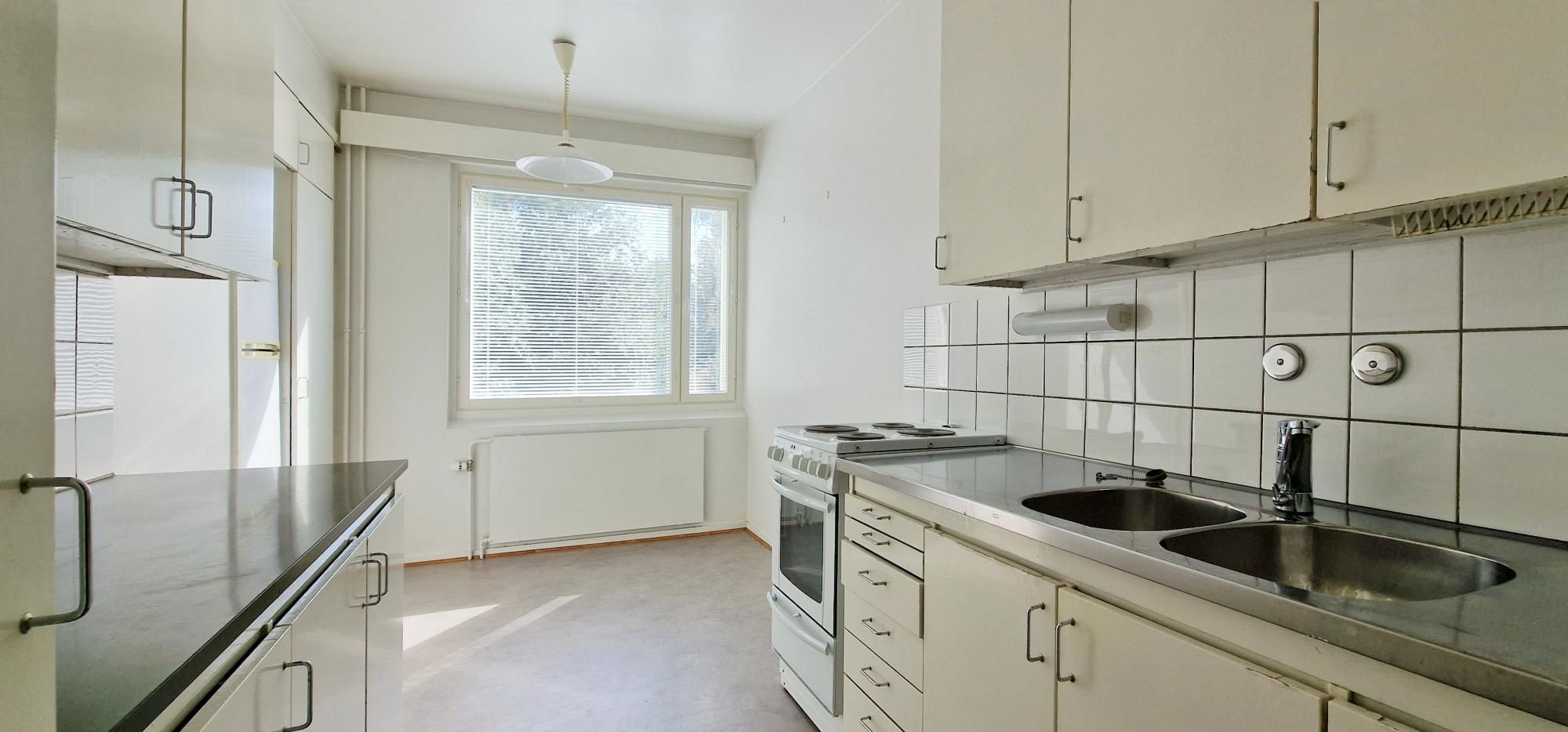 Iso erillinen keittiö, johon mahtuu ruokapöytä. Keittiöön uusittu vesikalusteita ja asunnon seinäpintoja maalattu uudelleen.