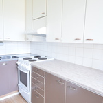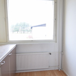 Ikkunallisessa keittiössä hyvin kaappi- ja laskutilaa. Jääkaappipakastin, liesi ja liesituuletin.