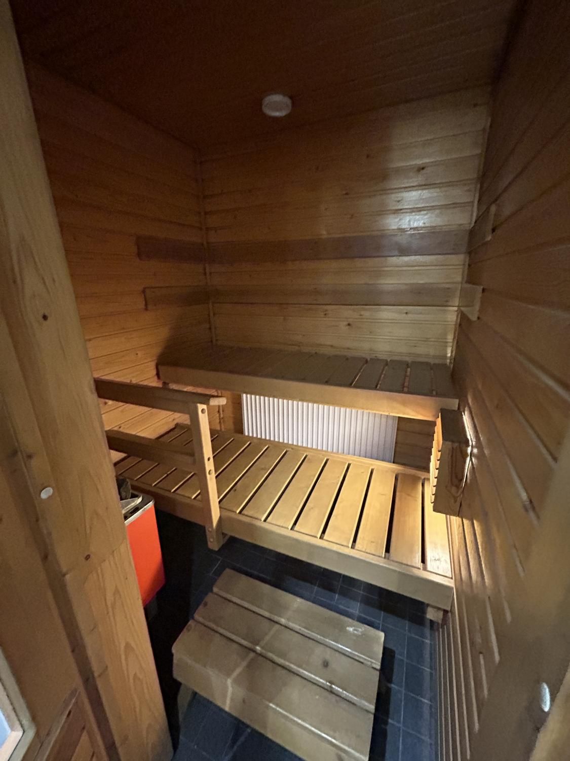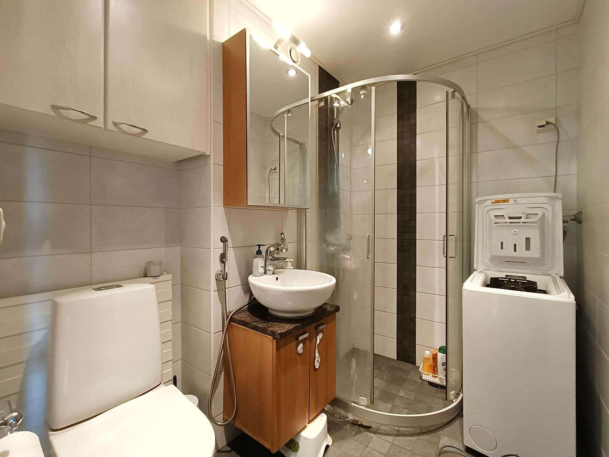 Hyväkuntoinen kylpyhuone laatoitettu putkiremontin yhteydessä, tila ja liitäntä pienelle pyykinpesukoneelle!