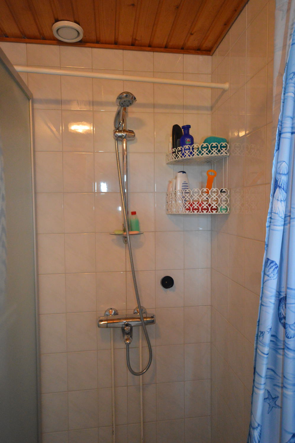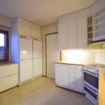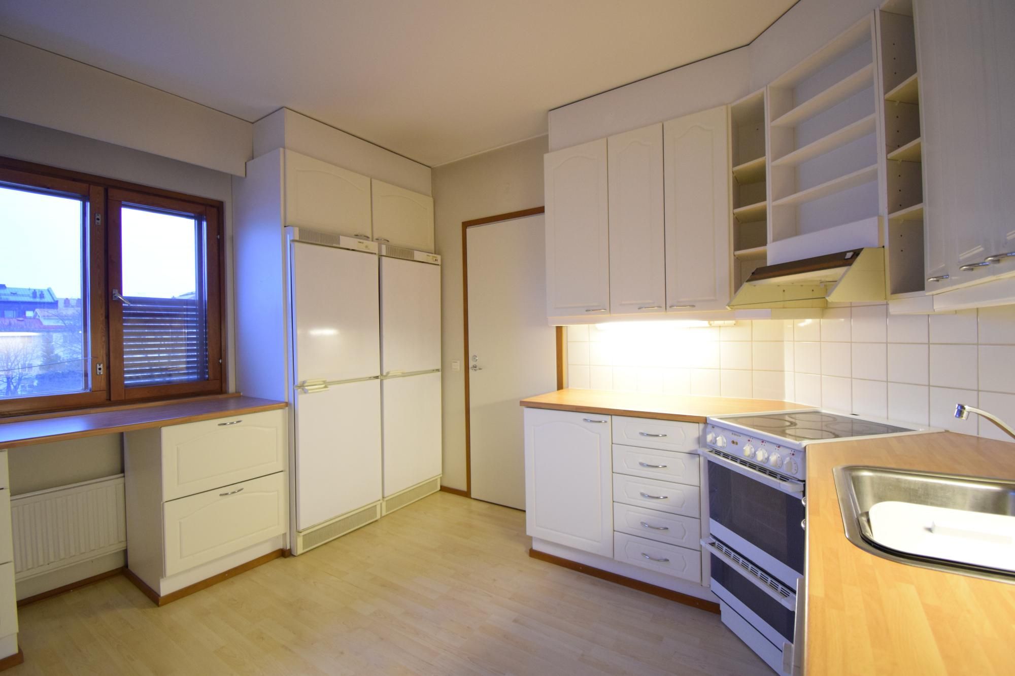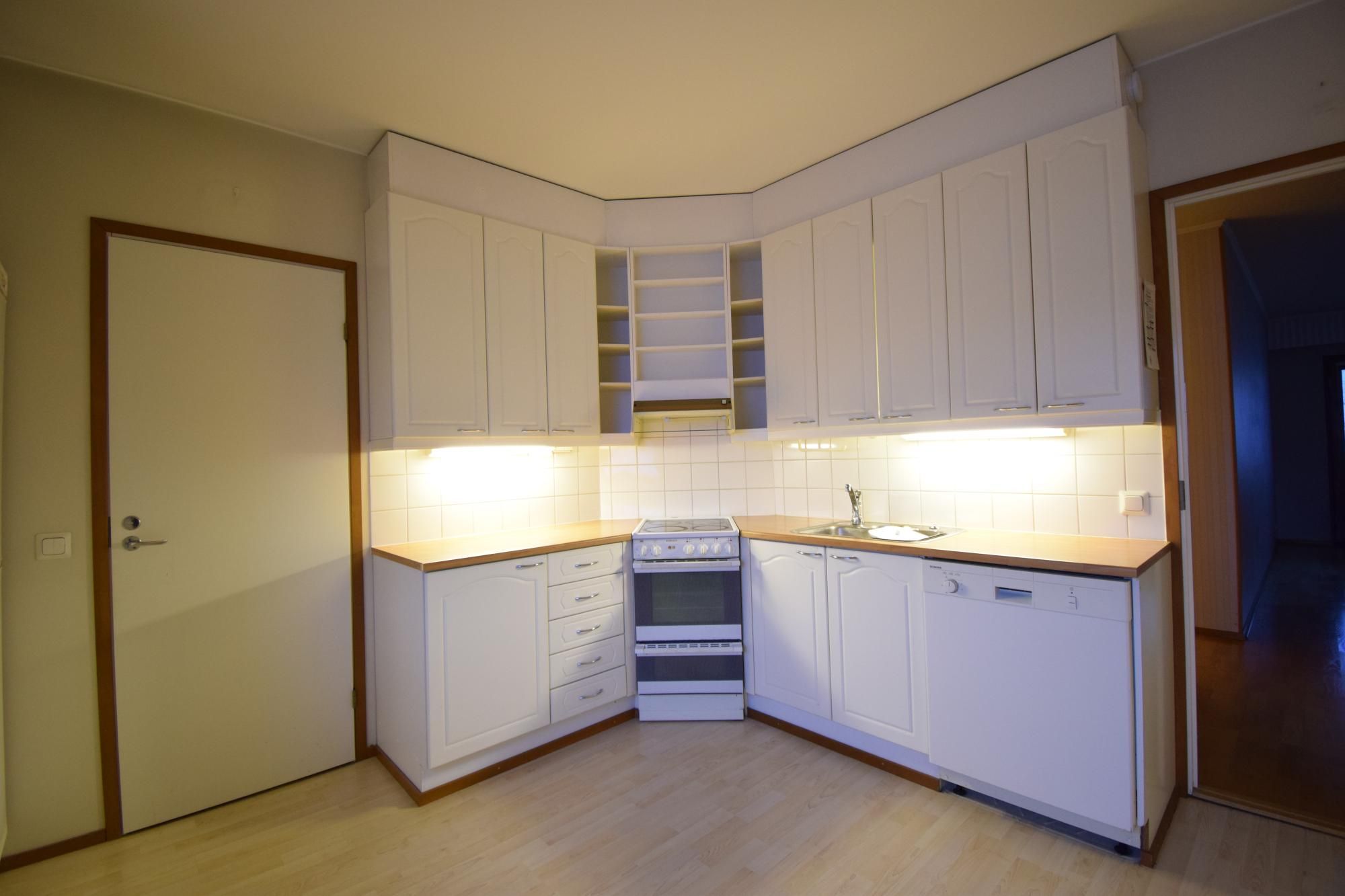 Keittiössä on vaaleat, ajattomat kaapistot sekä kattavat varusteet: liesi, liesituuletin, jääkaappi, pakastin ja astianpesukone.