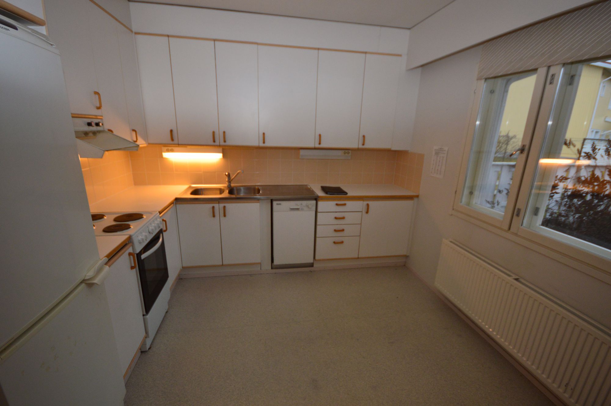 Alakerrassa sijaitsevat keittiö, valoisa olohuone, yksi makuuhuone sekä pesutilat, sauna ja käytännöllinen kodinhoitohuone. Kodinhoitohuoneesta on käynti aidatulle takapihalle, joka sopii mainiosti lapsille tai lemmikeille. Yläkerrassa on kaksi makuuhuonetta sekä oma kylpyhuone. Molemmissa kerroksissa on wc. Asunnon lattiat ovat laminaattia ja keittiö on varustettu astianpesukoneella.