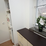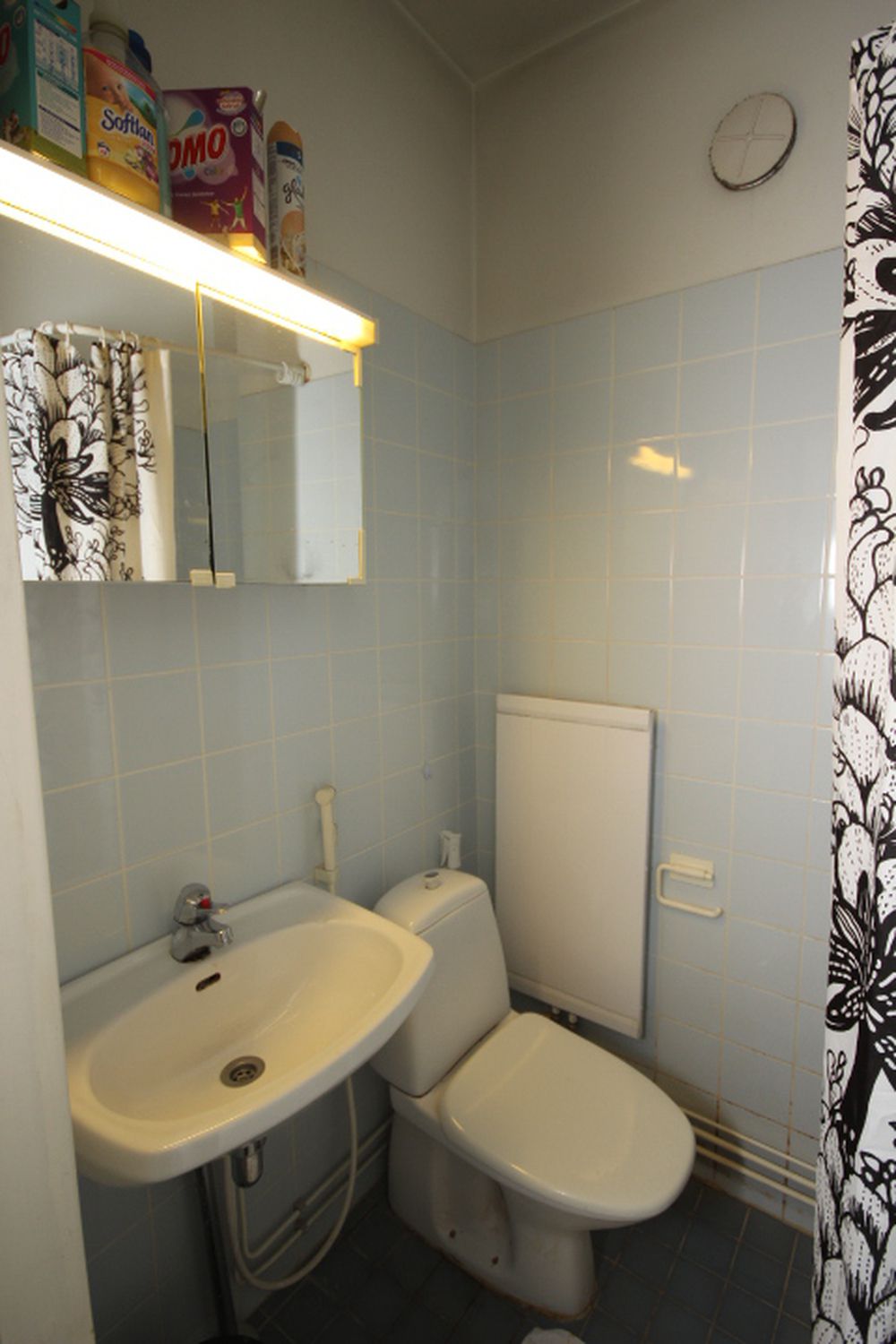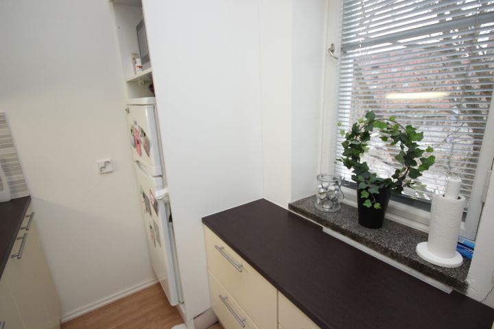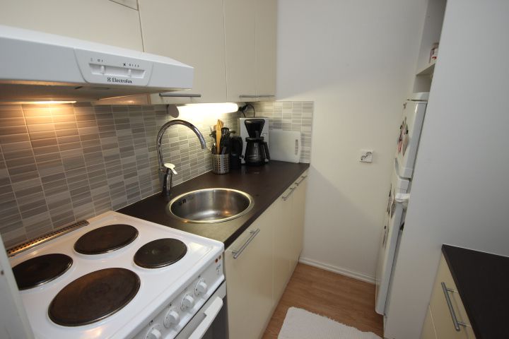 Huoneiston lattiamateriaalina on käytetty laminaattia ja seinät ovat vaalean sävyiset. Keittokomeron varusteluun kuuluu siistiit kaapistot, uuni, liesi, liesituuletin sekä jääkaappi pakastinlokerolla. Laatoitetussa kylpyhuoneessa tila ja liitäntä pienelle pyykinpesukoneelle, taloyhtiössä on myös pesutupa.