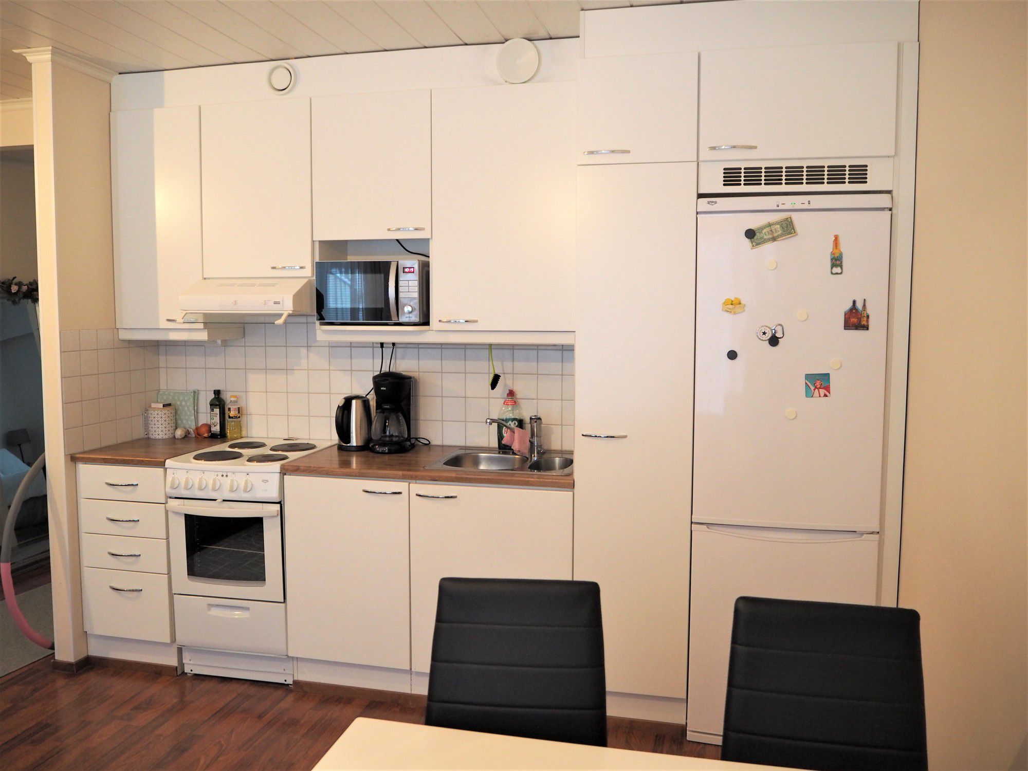 Keittiön kaapistot kauniin valkoiset ja lattia laminaattia. Keittiöön asennetaan astianpesukone kevään 2026 aikana. Huoneisto sijaitsee ensimmäisessä asuinkerroksessa, oma kiva piha rauhallisin näkymin. Huoneistoon kuuluu oma ulkovarasto. Autopaikka sisältyy vuokraan!
