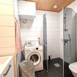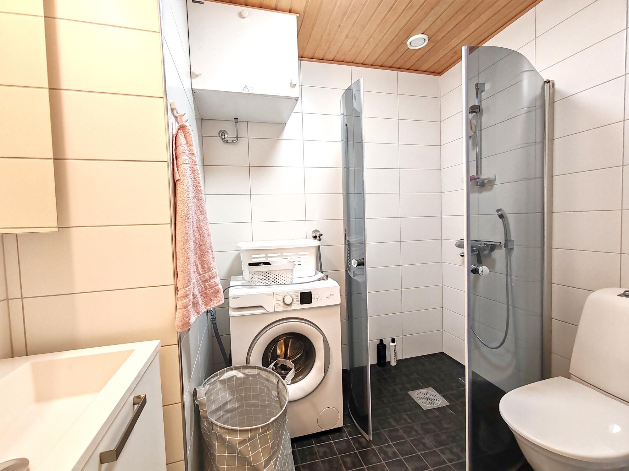Asunnossa tyylikäs valkoharmaa keittiö. Kylpyhuoneessa valkoiset kaakelit seinissä, tummat kaakelit lattiassa ja liitäntä pyykinpesukoneelle. Asunnon seinät maalattu valkoiseksi. Hyvin kaappitilaa.