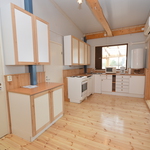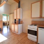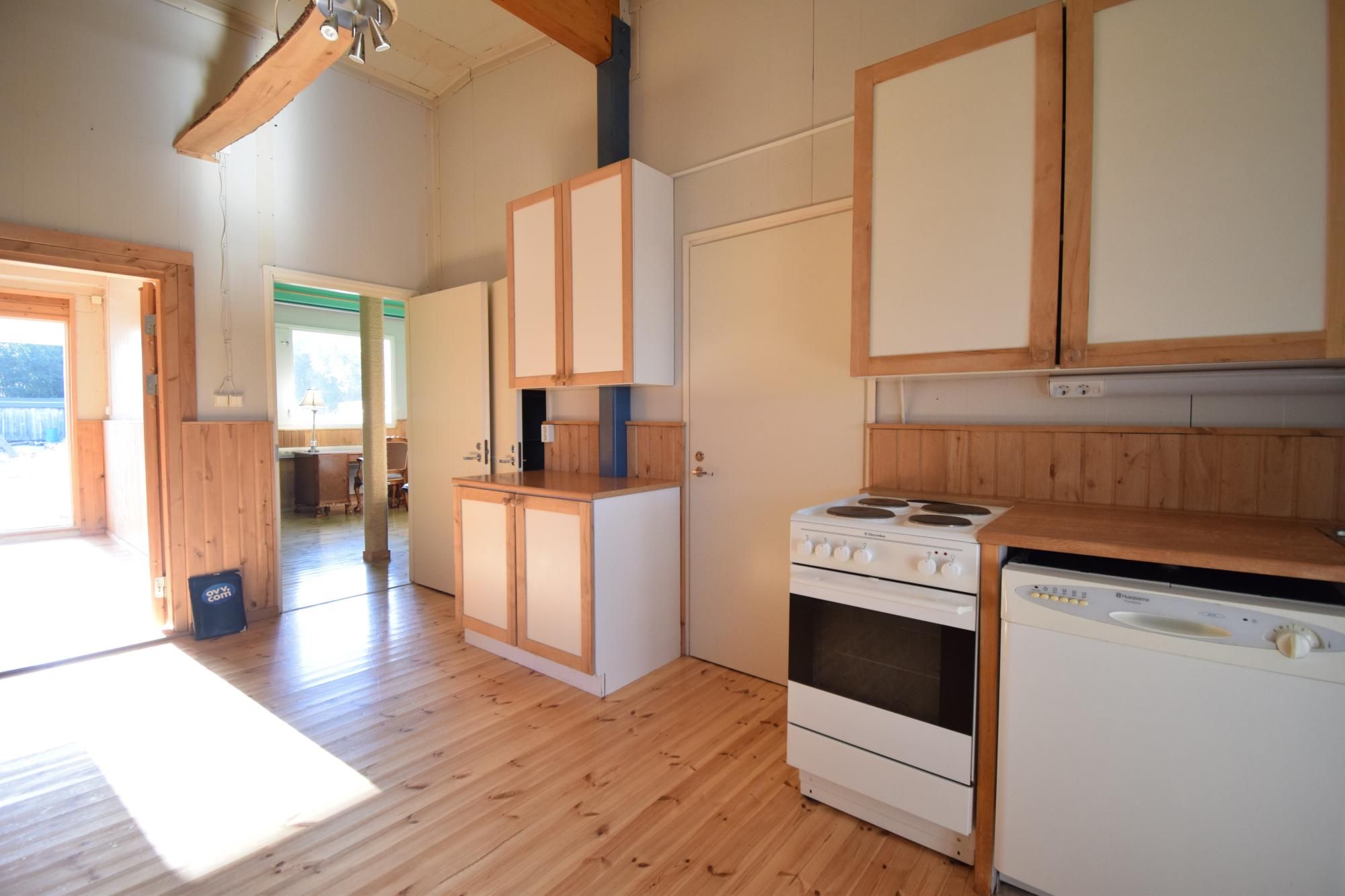 Tilan tuntua luo yli 3 m huonekorkeus keittiössä. Keittiössä vaaleat kaapistot ja siistikuntoiset liesi, liesituuletin, astianpesukone ja jääkaappipakastin.
