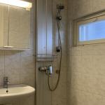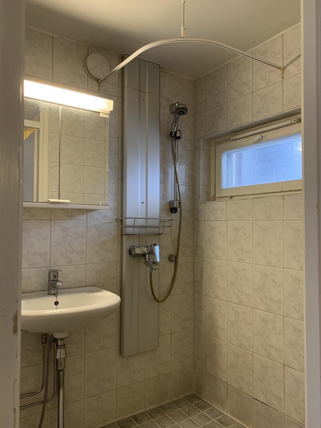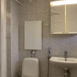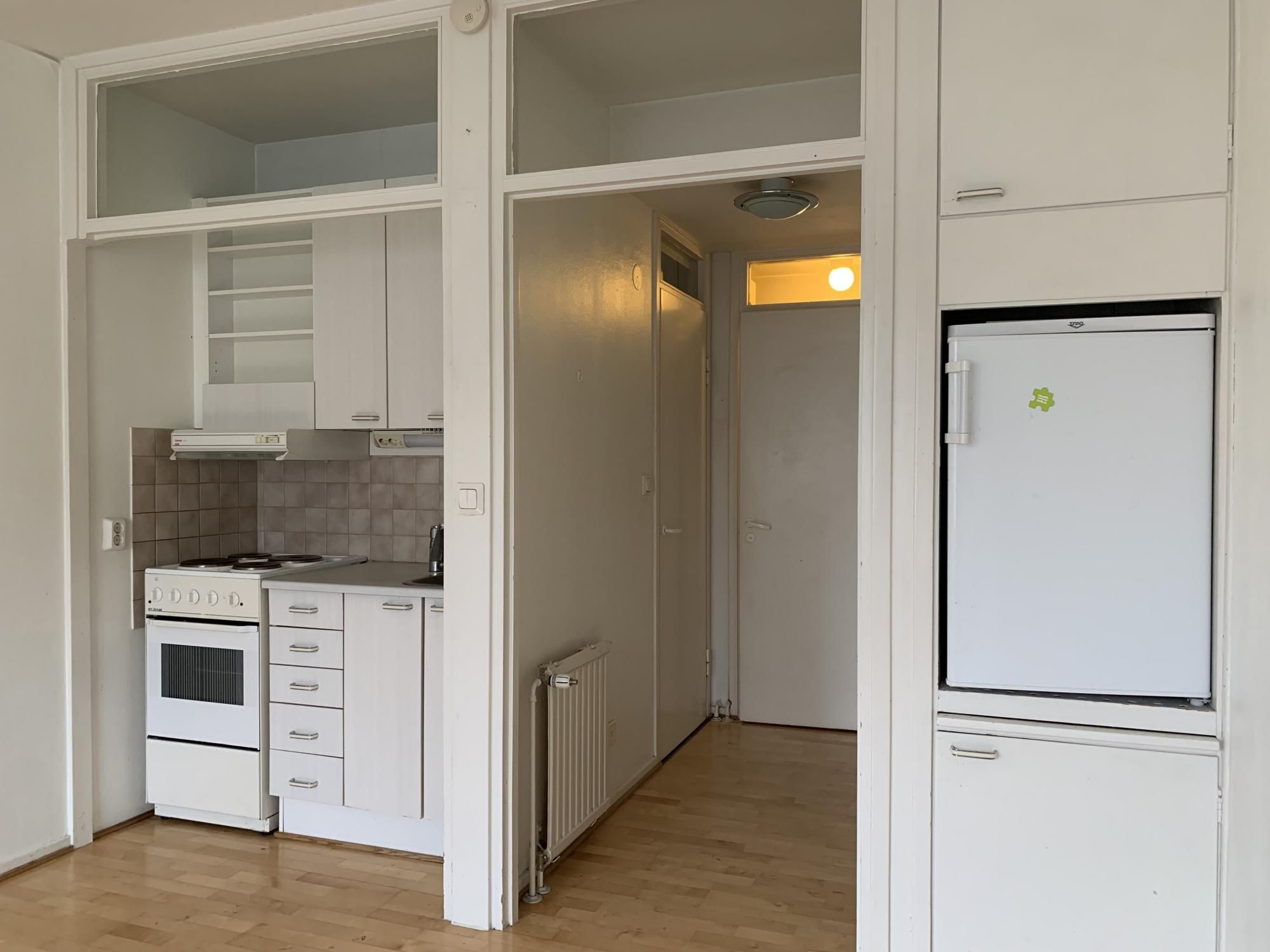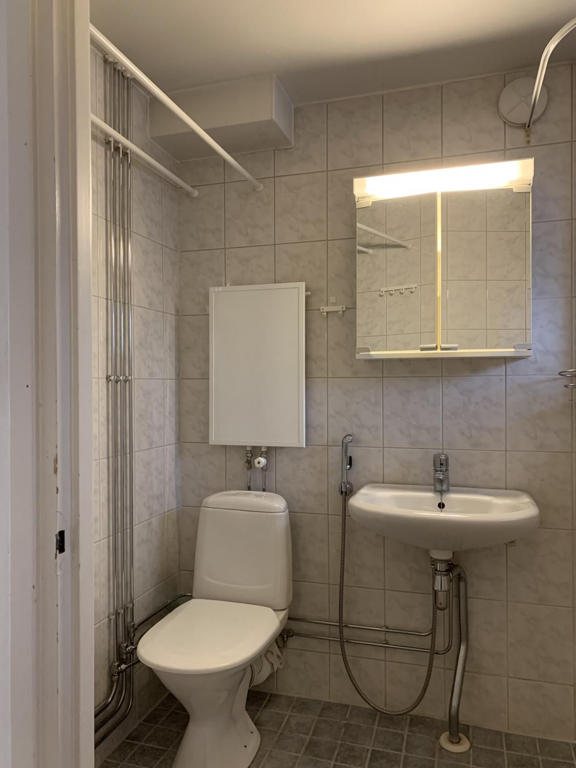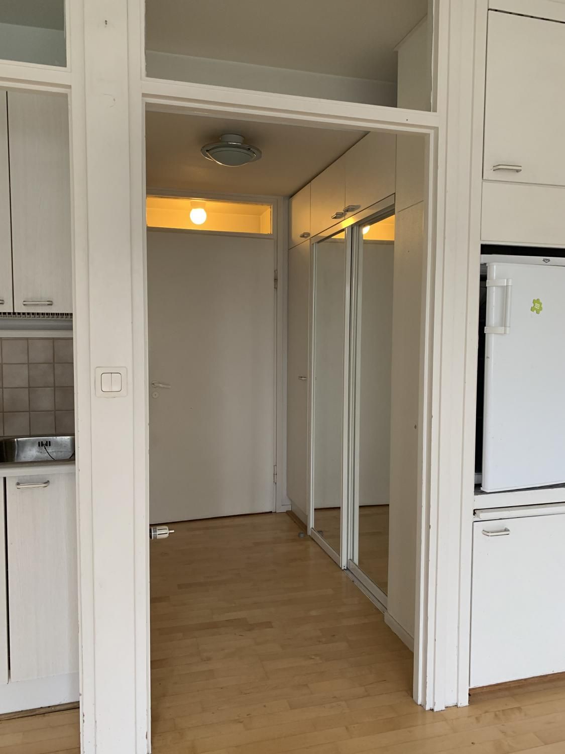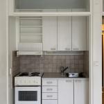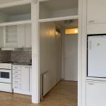 Avokeittiö, jossa mm. jääkaappi, pakastinlokero. Kylpyhuone laatoitettu ja pienelle pyykinpesukoneelle tila ja liitäntä.