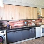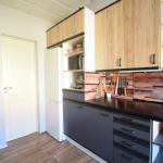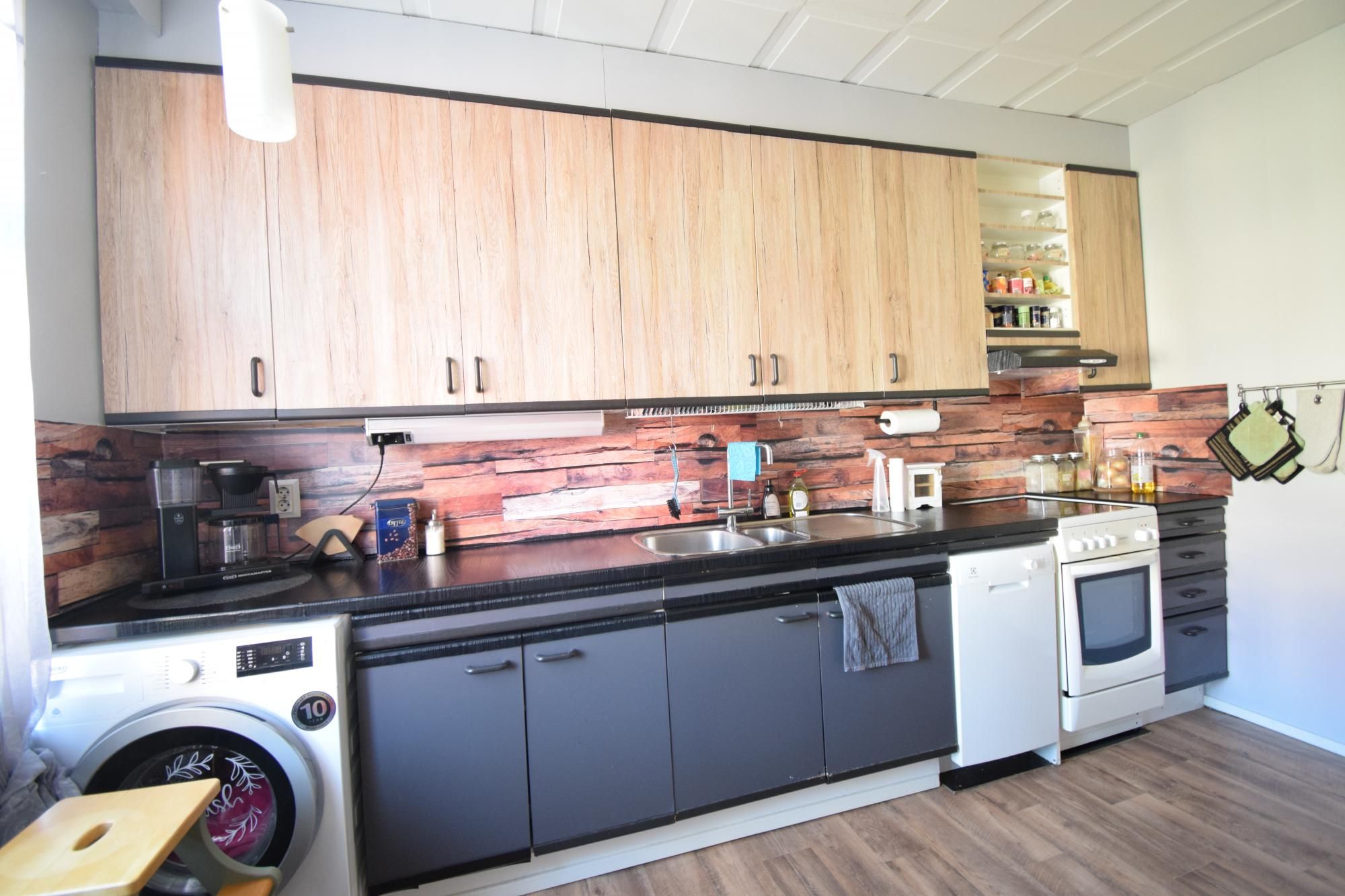 Keittiössä reilusti säilytystilaa, jääkaappipakastin, liesi, liesituuletin ja astianpesukone.