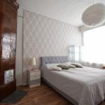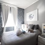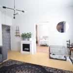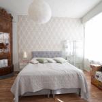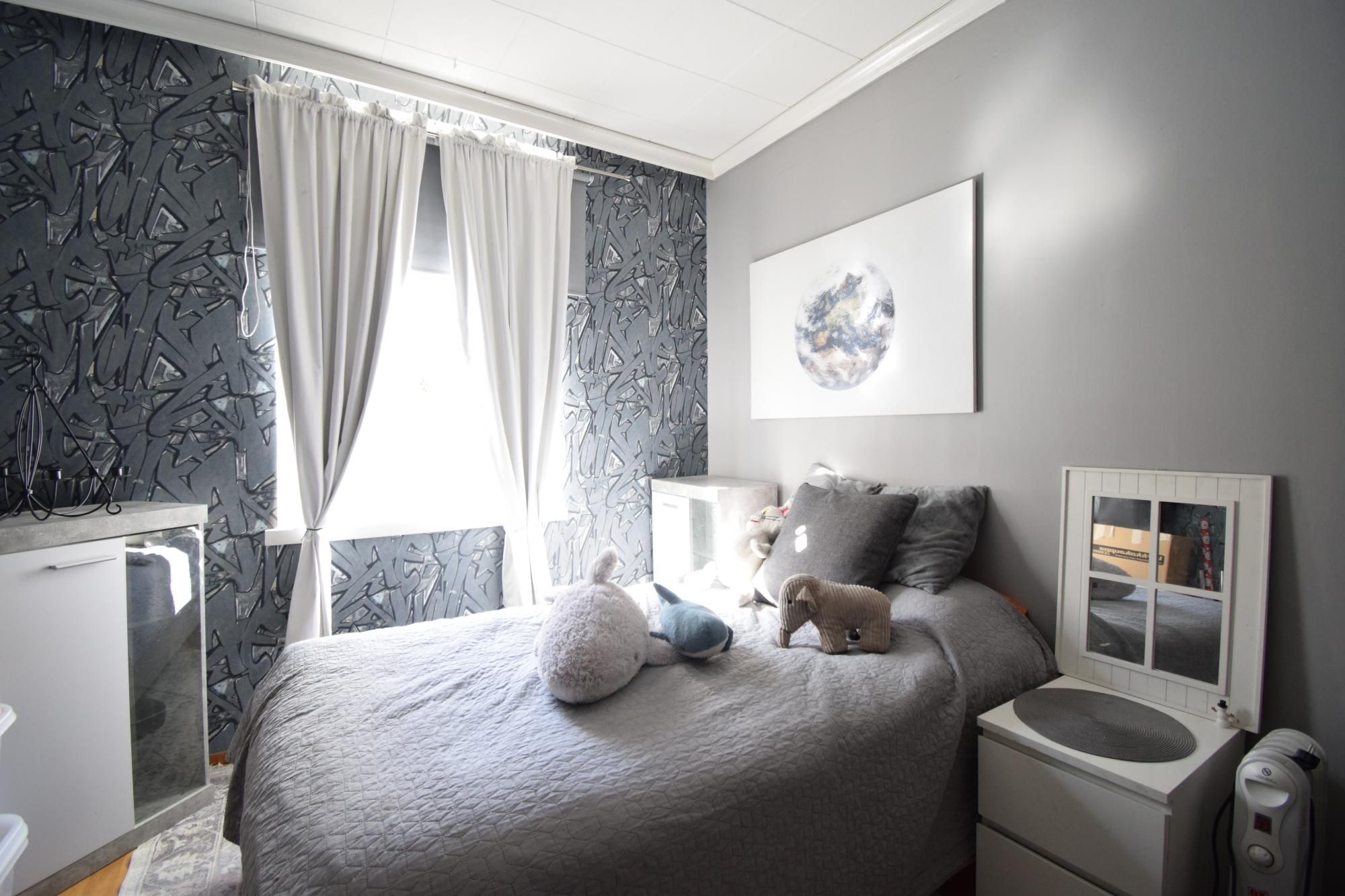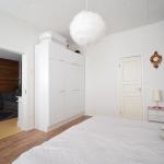 Korkeissa huoneissa kodikas tunnelma ja harmonisia sävyjä. Lattiassa muovimatto.