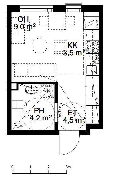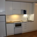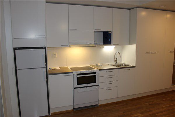 Keittotilassa jää/pakastinkaappi(jenkkikaappi), liesi/uuni/astianpesukoneyhdistelmä ja liesituuletin.