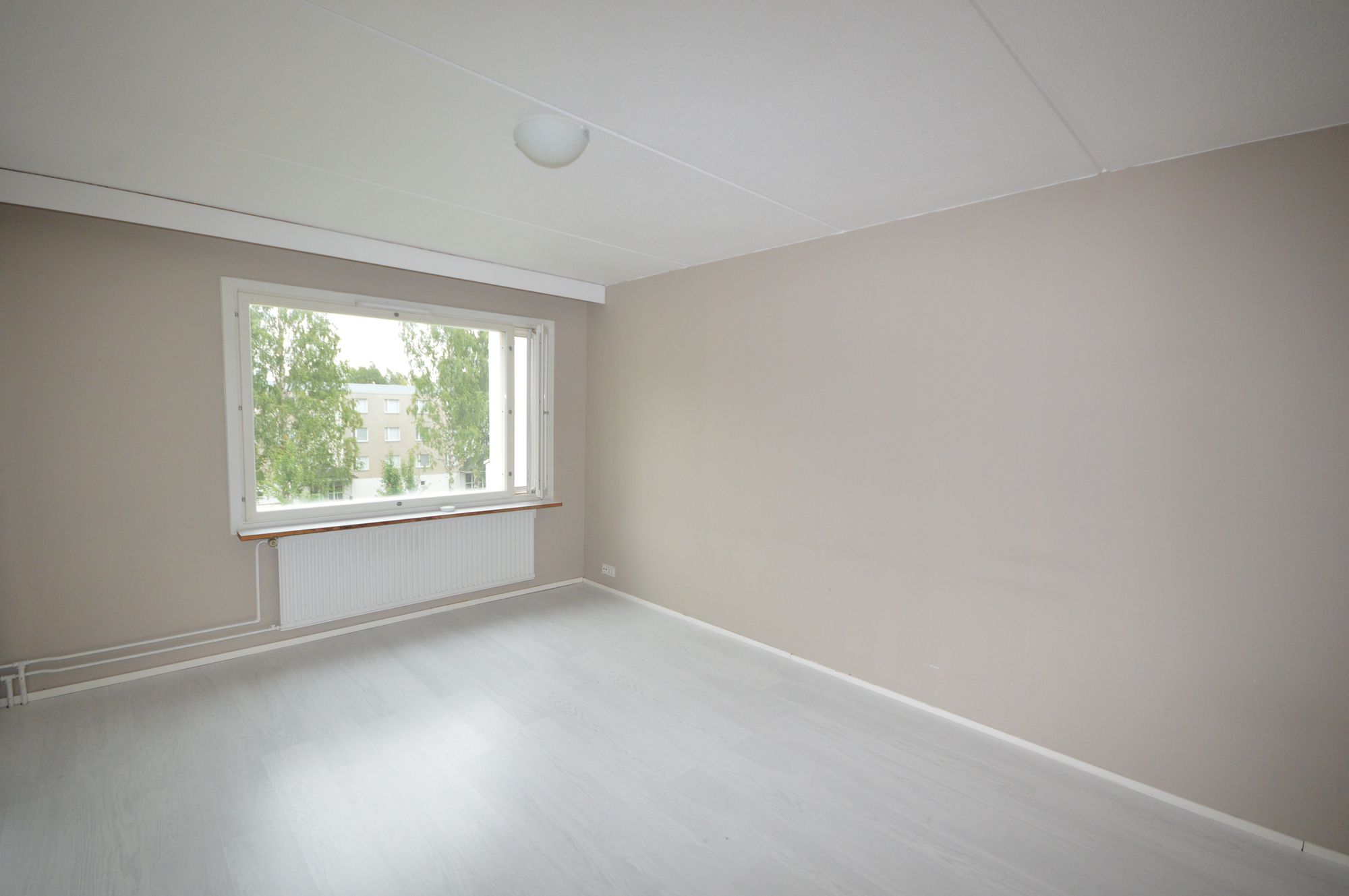 Asunto on osittain pintaremontoitu, lattiassa vaalea laminaatti ja seinissä tehostemaali.