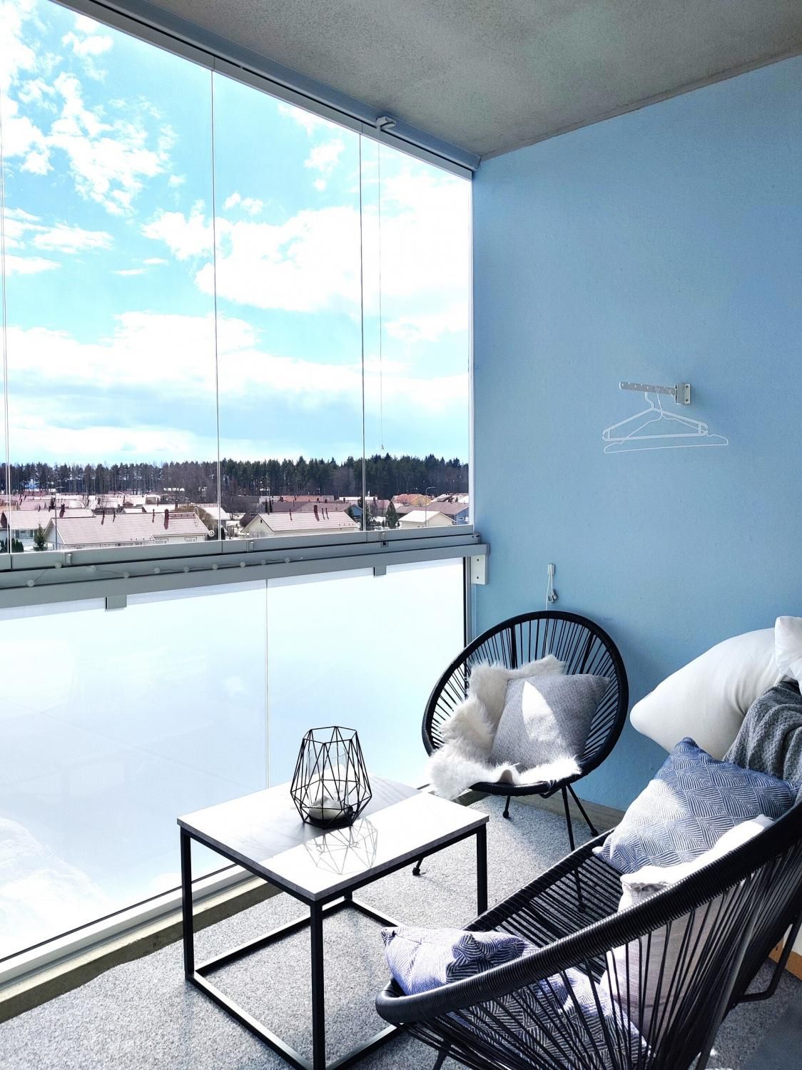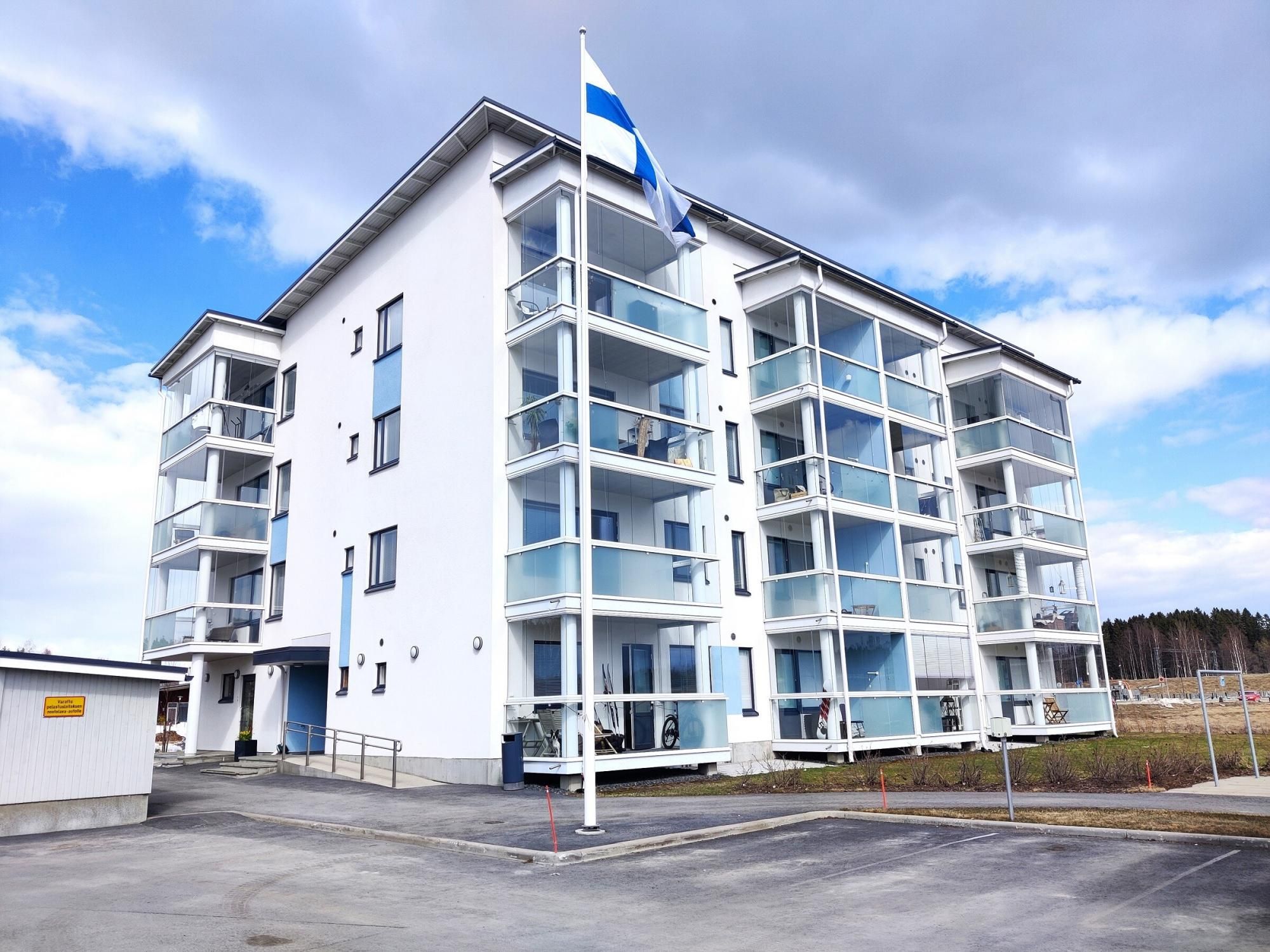 Lasitetulta parvekkeelta on näkymä Pyhäselän rantaan. Asunnon pinnat ovat sävyltään kauniin vaaleat ja kaakeloidusta kylpyhuoneesta löytyy pesukoneliitäntä.