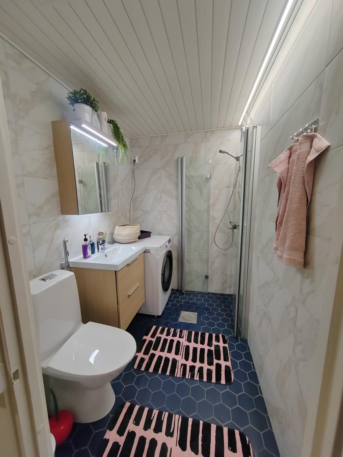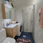 Tyylikkäässä keittiössä on hyvin tilaa ruokapöydälle. Varusteluun kuuluvat (2025 uusittu jääkaappipakastin ), liesi, liesituuletin sekä astianpesukone. Näyttävästi laatoitettu kylpyhuone johon mahtuu jopa pesutorni.