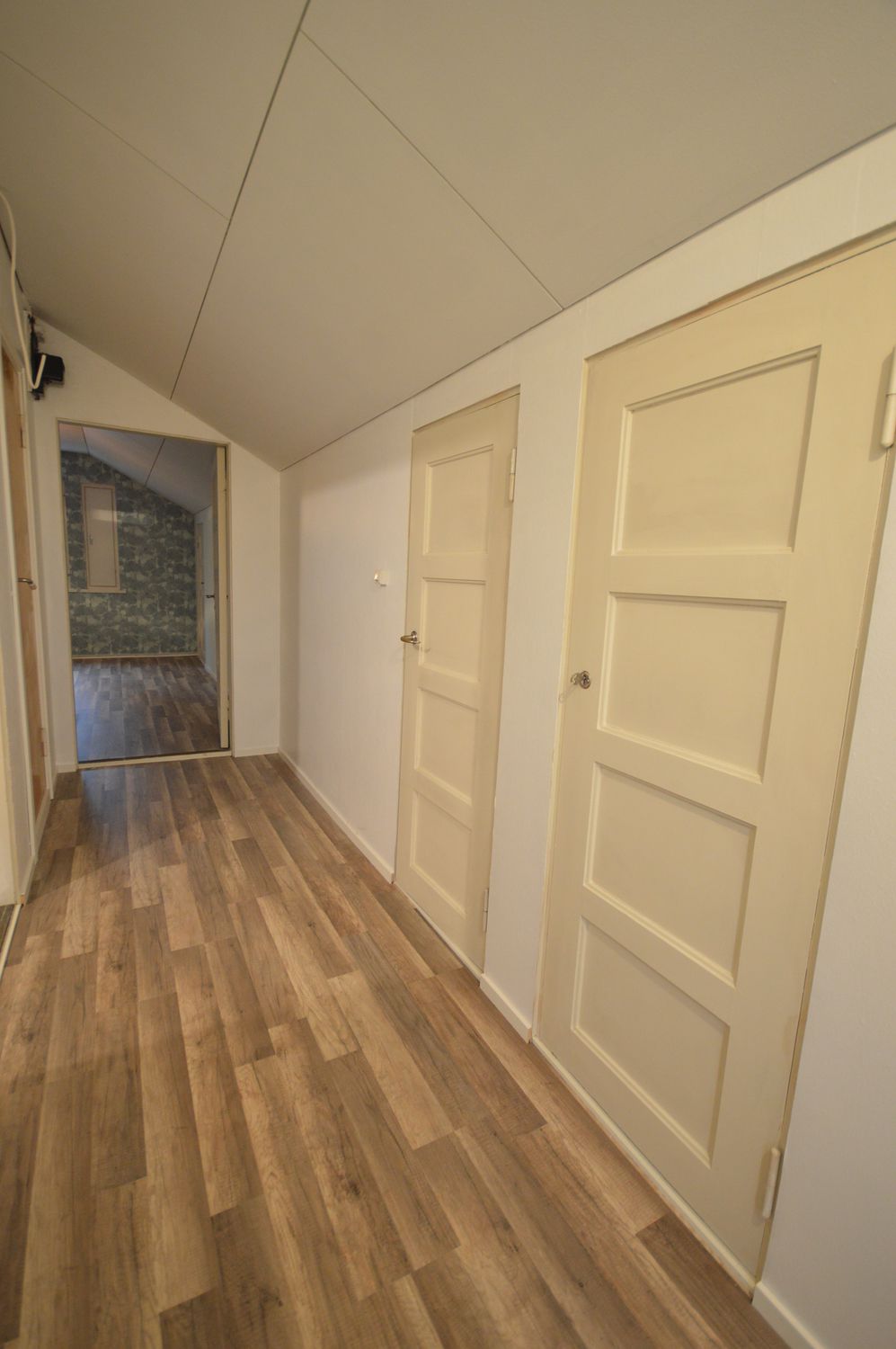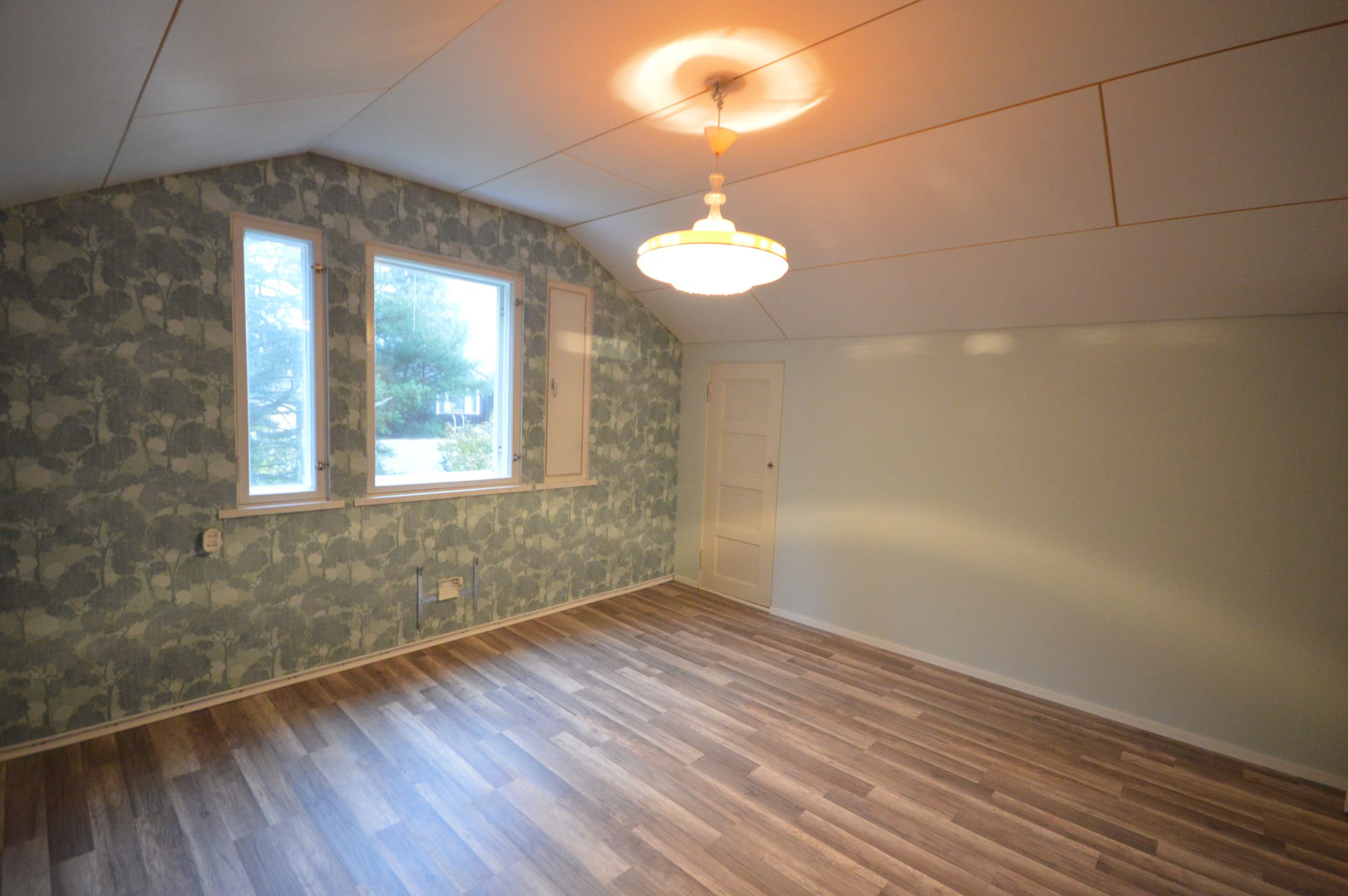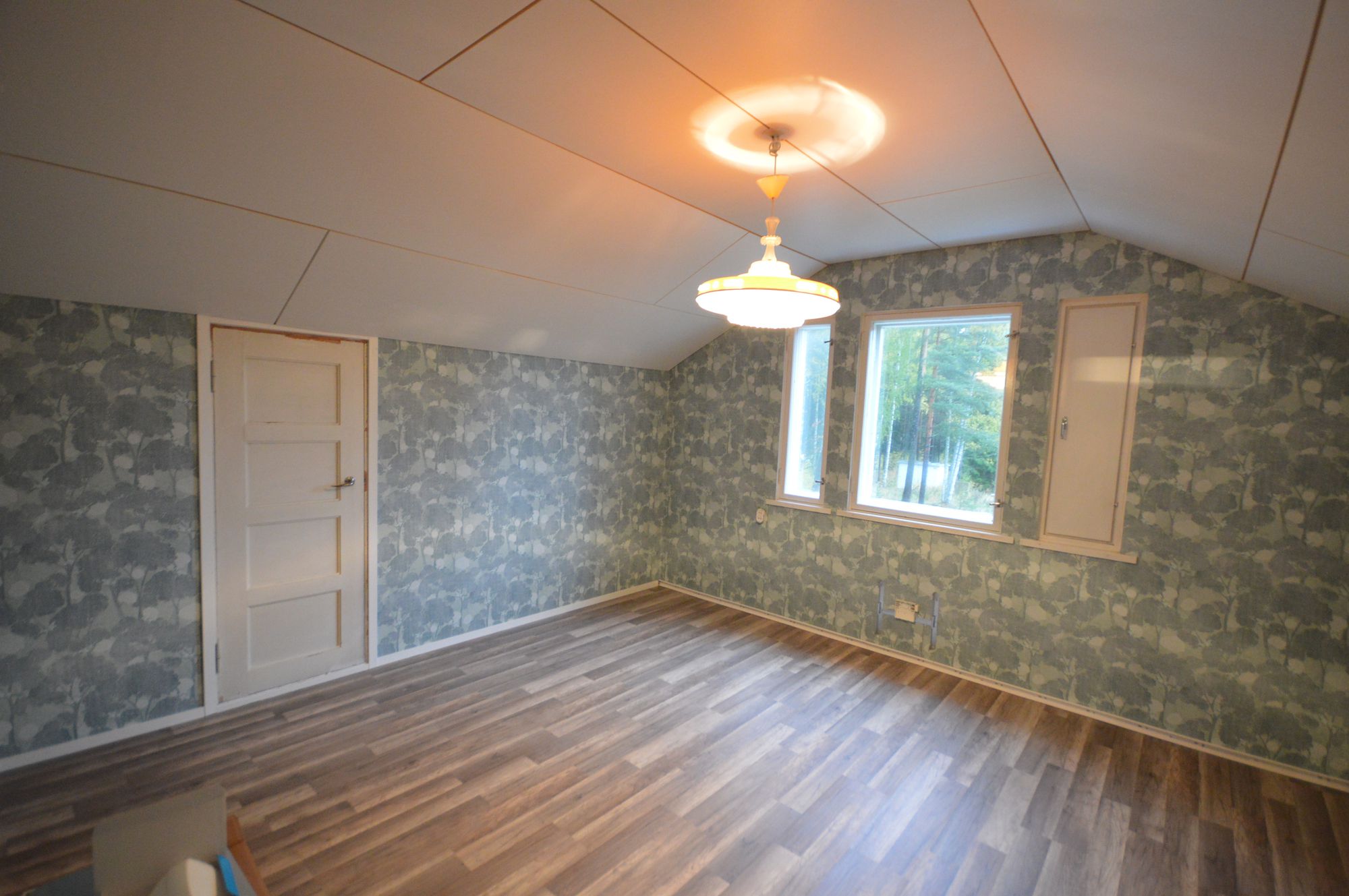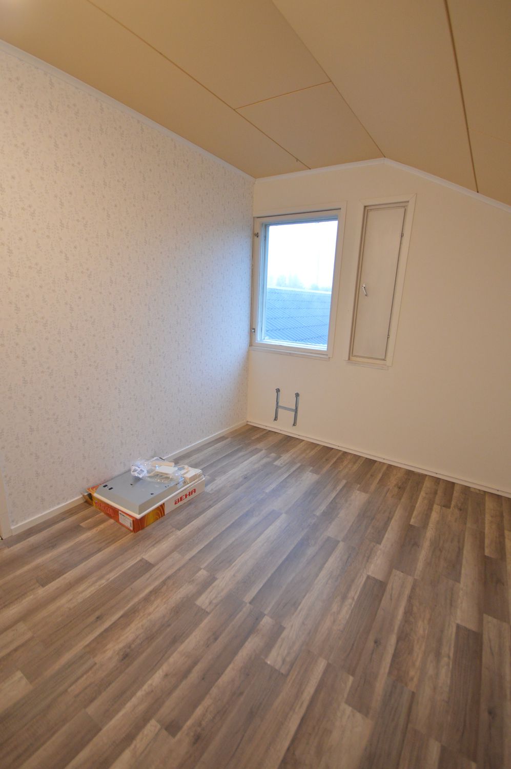 Asunnon yläkerrassa päämakuuhuone, pienempi makuuhuone ja suihku + WC tila, jossa lattialämmitys. Yläkerrassa matalaa tilaa molemmin puolin säilytykseen. Talon alakerrassa mm. sauna ja varasto/työ-tilaa, joita ei ole laskettu neliöihin. Pyykinpesukoneelle paikka alakerrassa. Kuivausrumpu valmiina.