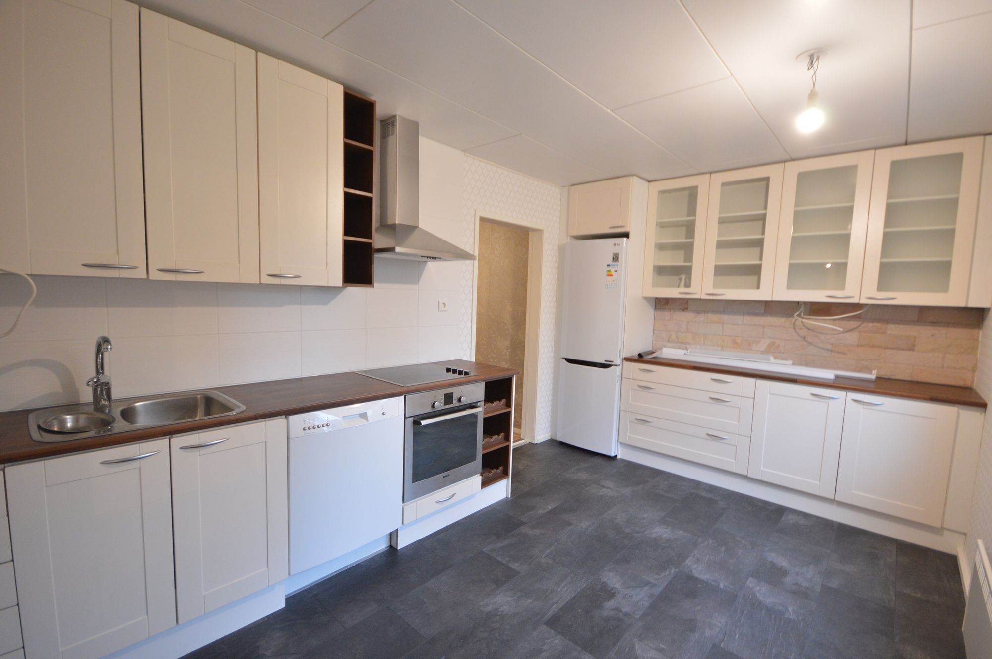 Tilavassa keittiössä valkoiset kaapistot ja puiset tasot. Varusteina mm. induktioliesitaso, liesituuletin, erillisuuni, jääkaappipakastin, astianpesukone.