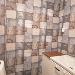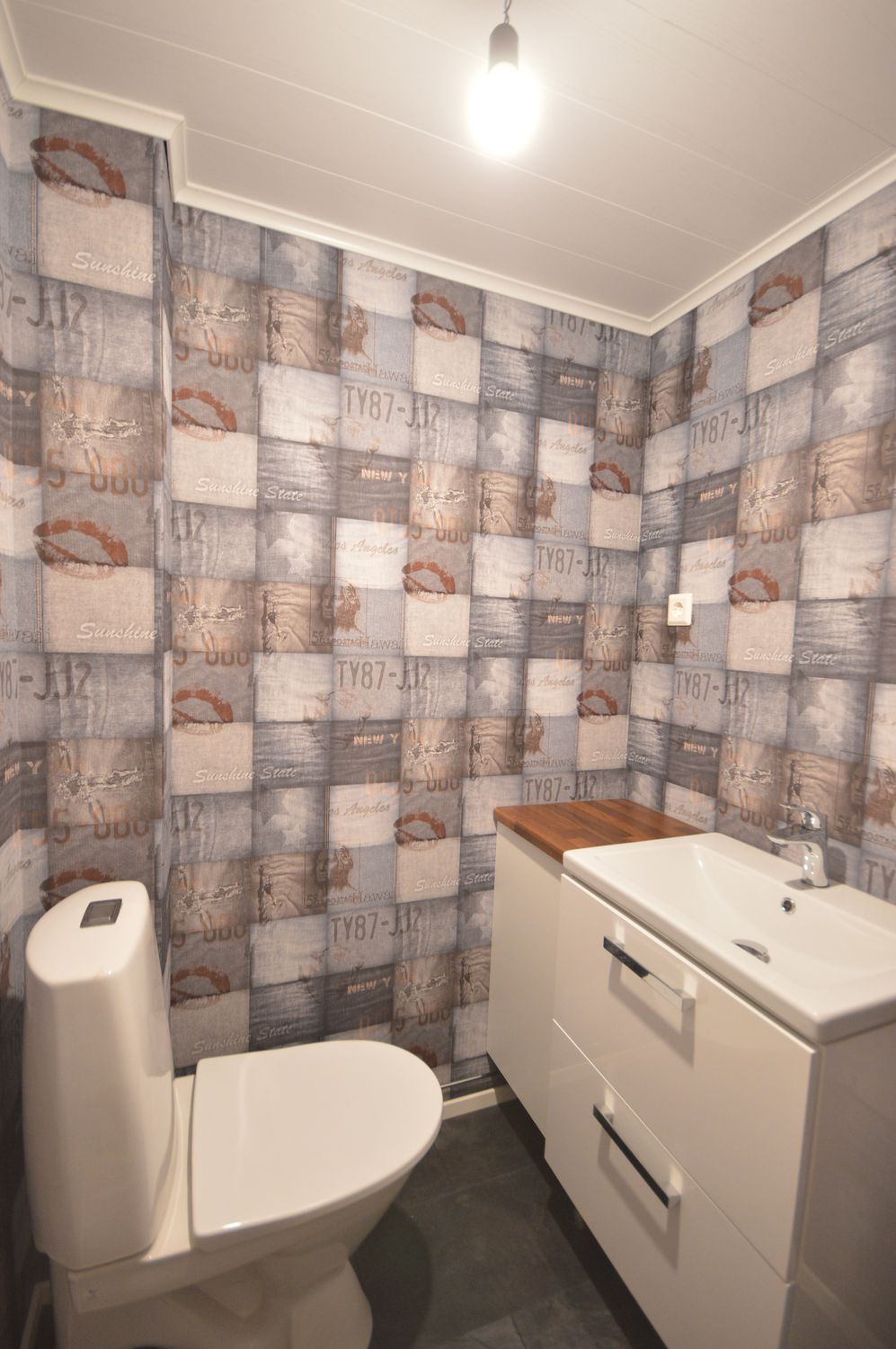 Asunnossa tyylikkäät nykyaikaiset pintamateriaalit. Lattiat laminaattia ja tyylikkäät koristeelliset tapetit.
