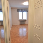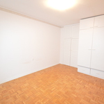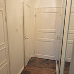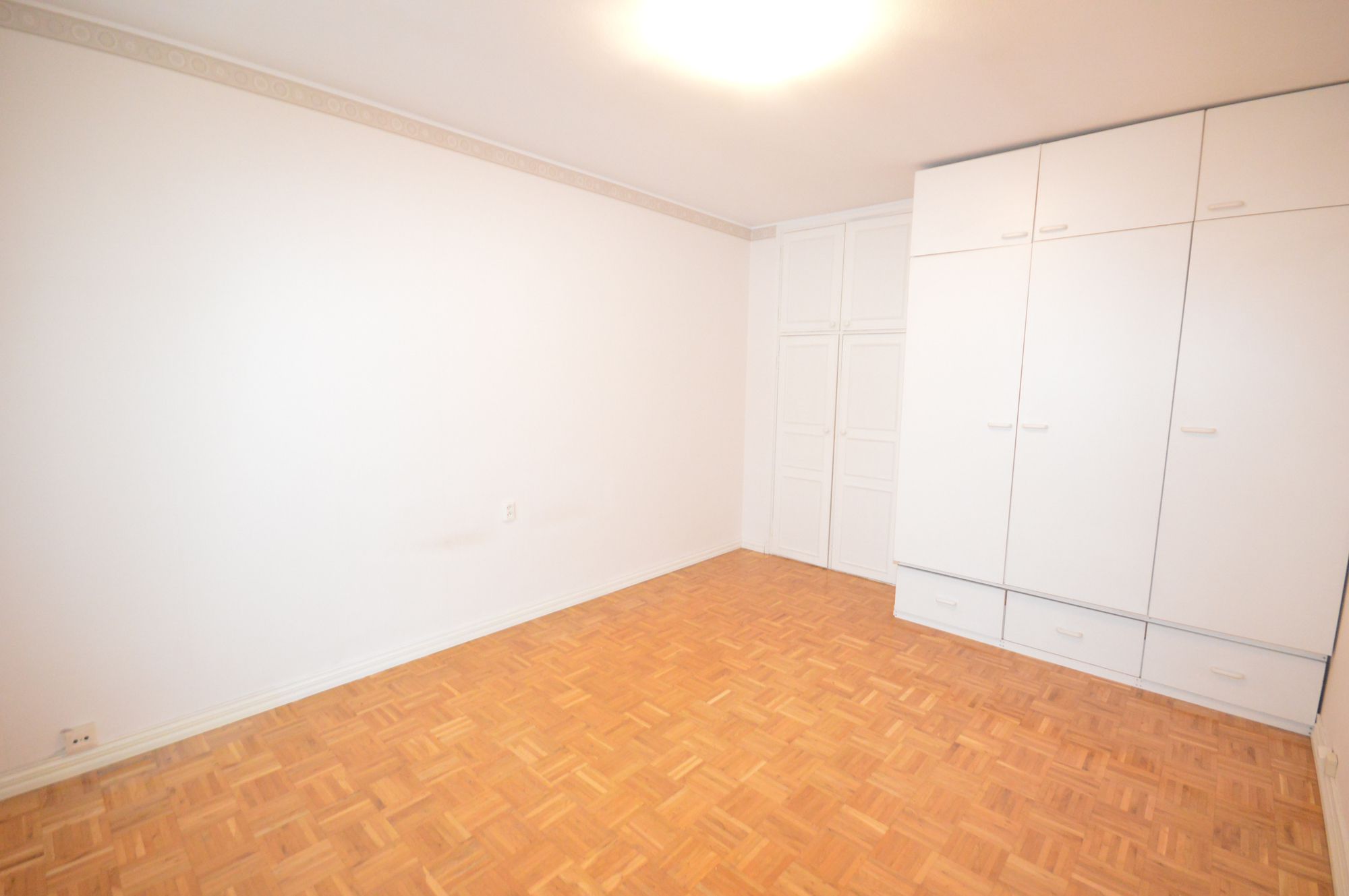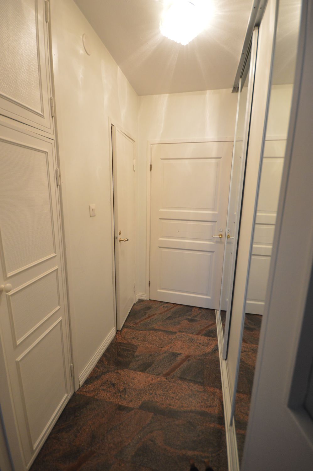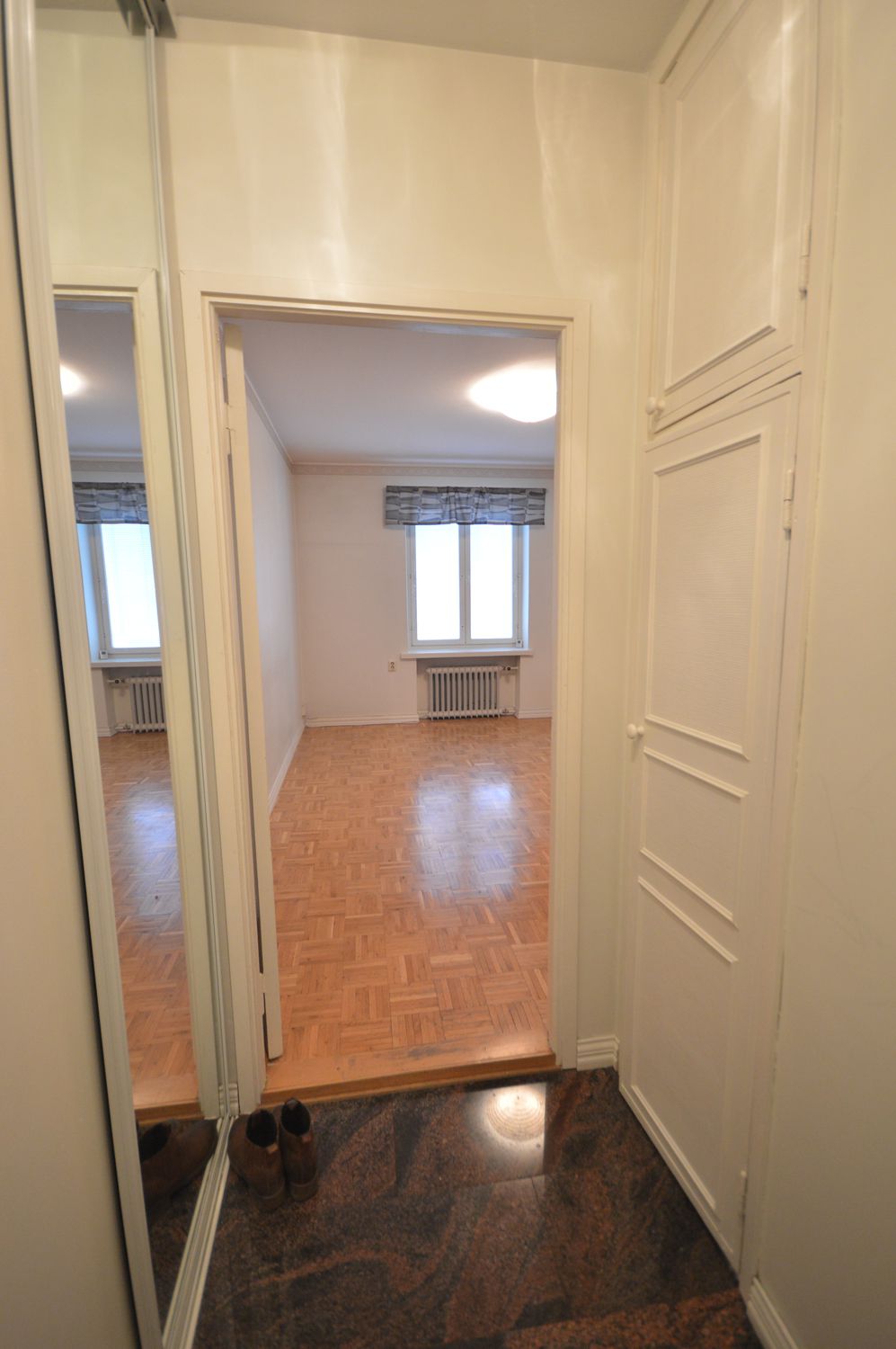 Eteisessä marmorilattiat, säilytystilaa peilikaapeissa. Muilta osin asunnossa parkettilattiat ja vaaleat seinäpinnat.