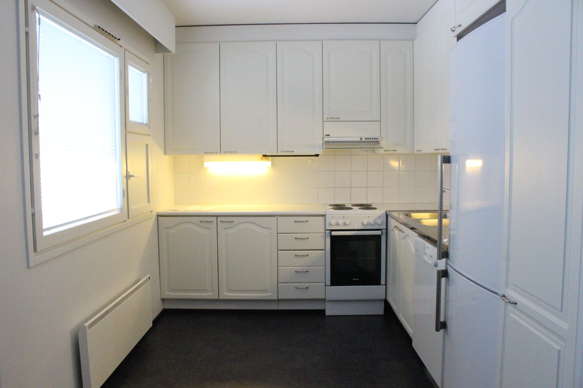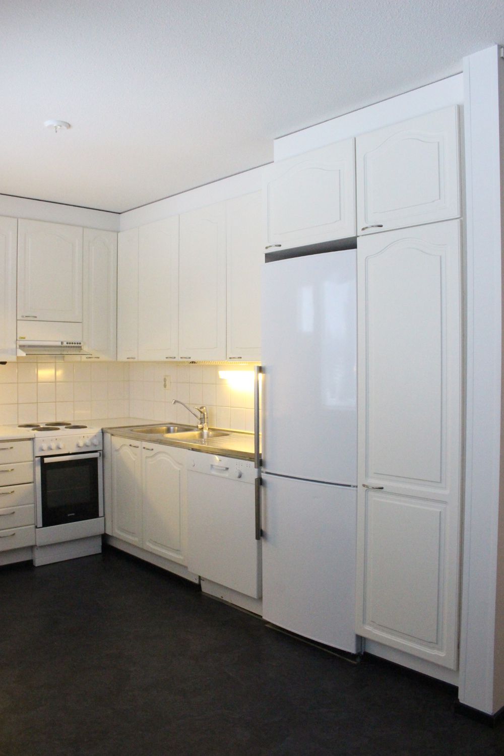 Keittiössä jää/pakastinkaappi, liesi ja astianpesukone.