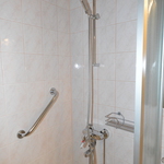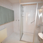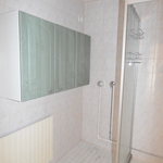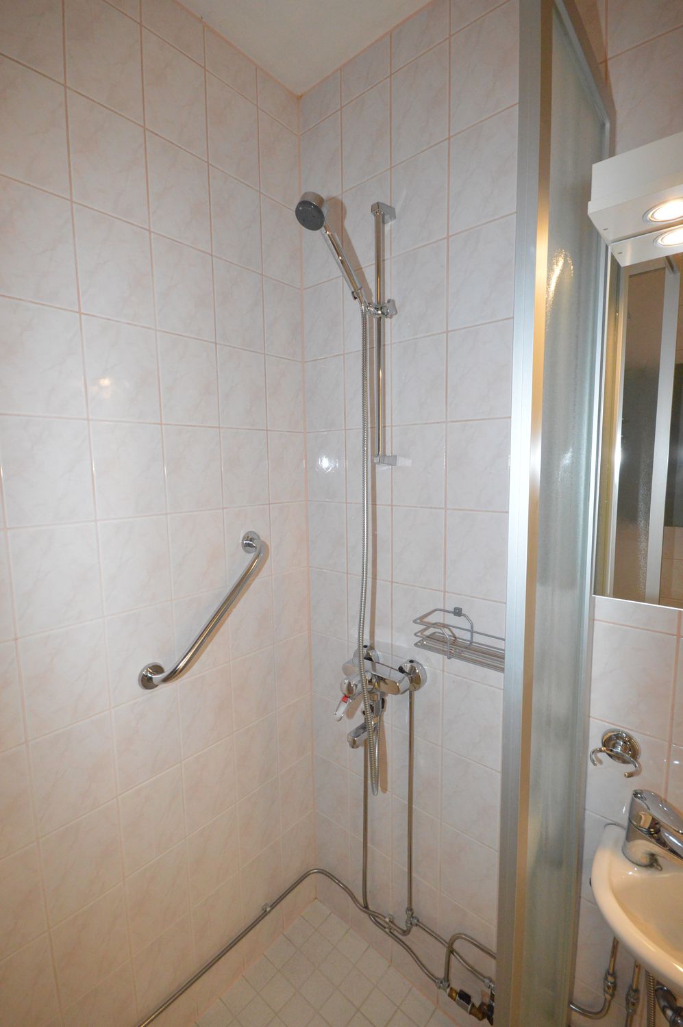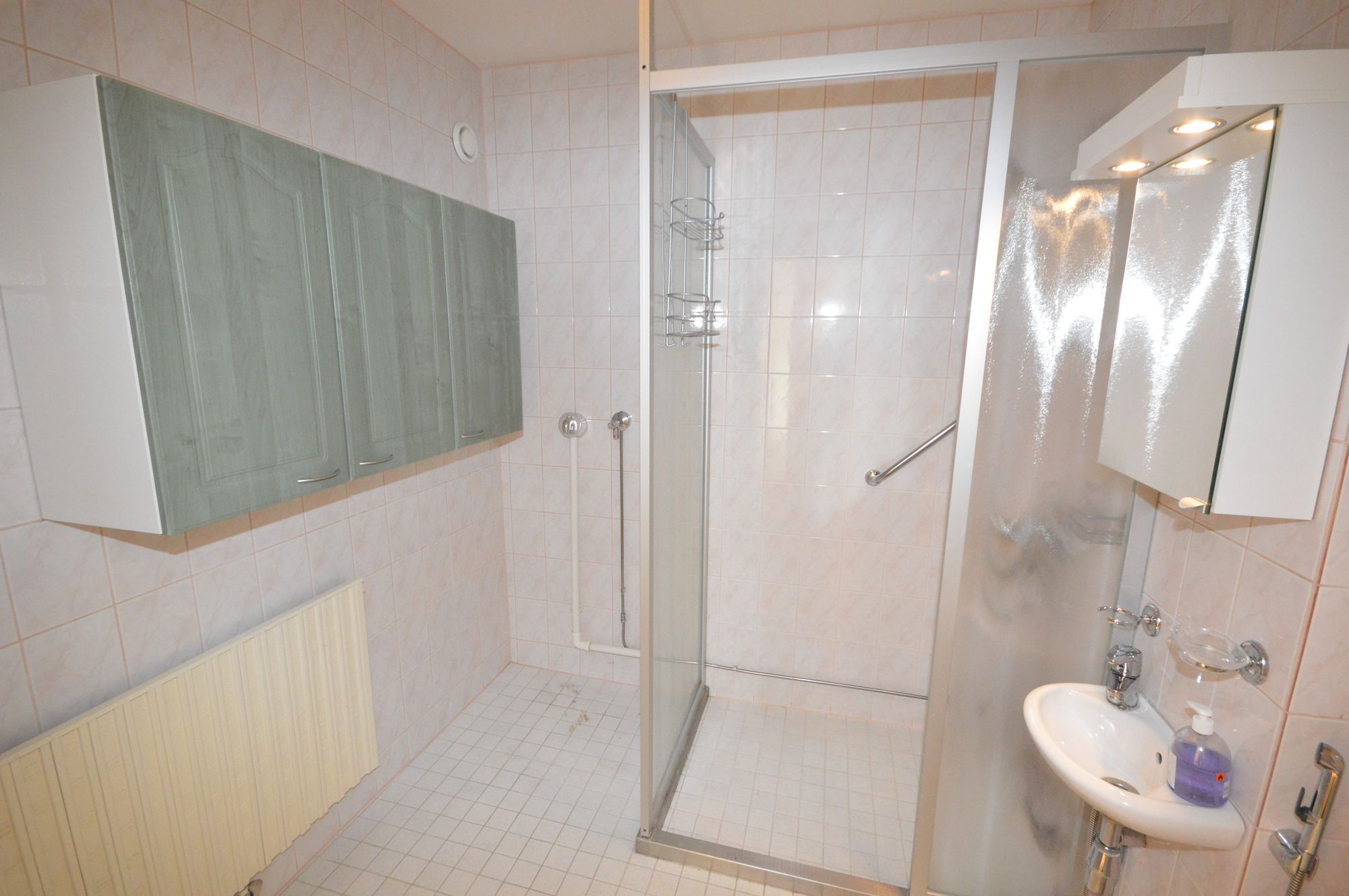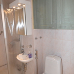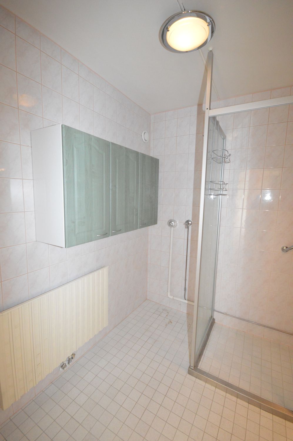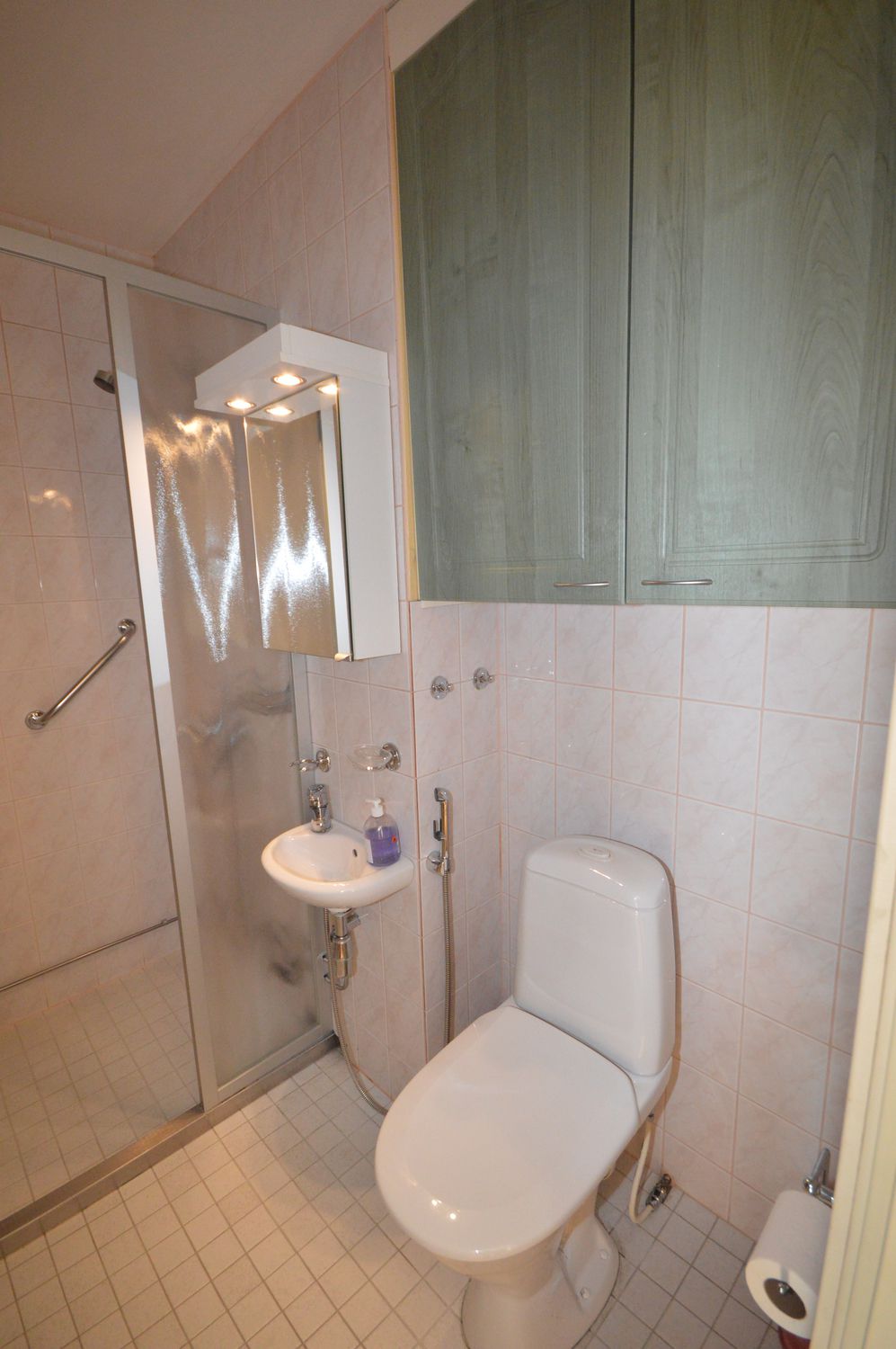 Kaakeloidussa kylpyhuoneessa suihkukaappi, hyvin säilytystilaa ja pesukoneliitäntä löytyy.