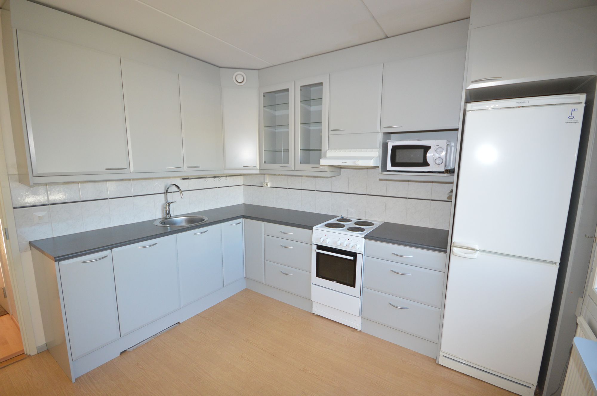 Keittiössä jääkaappi, pakastin, liesi, liesituuletin, integroitu astianpesukone ja mikro valmiina.
