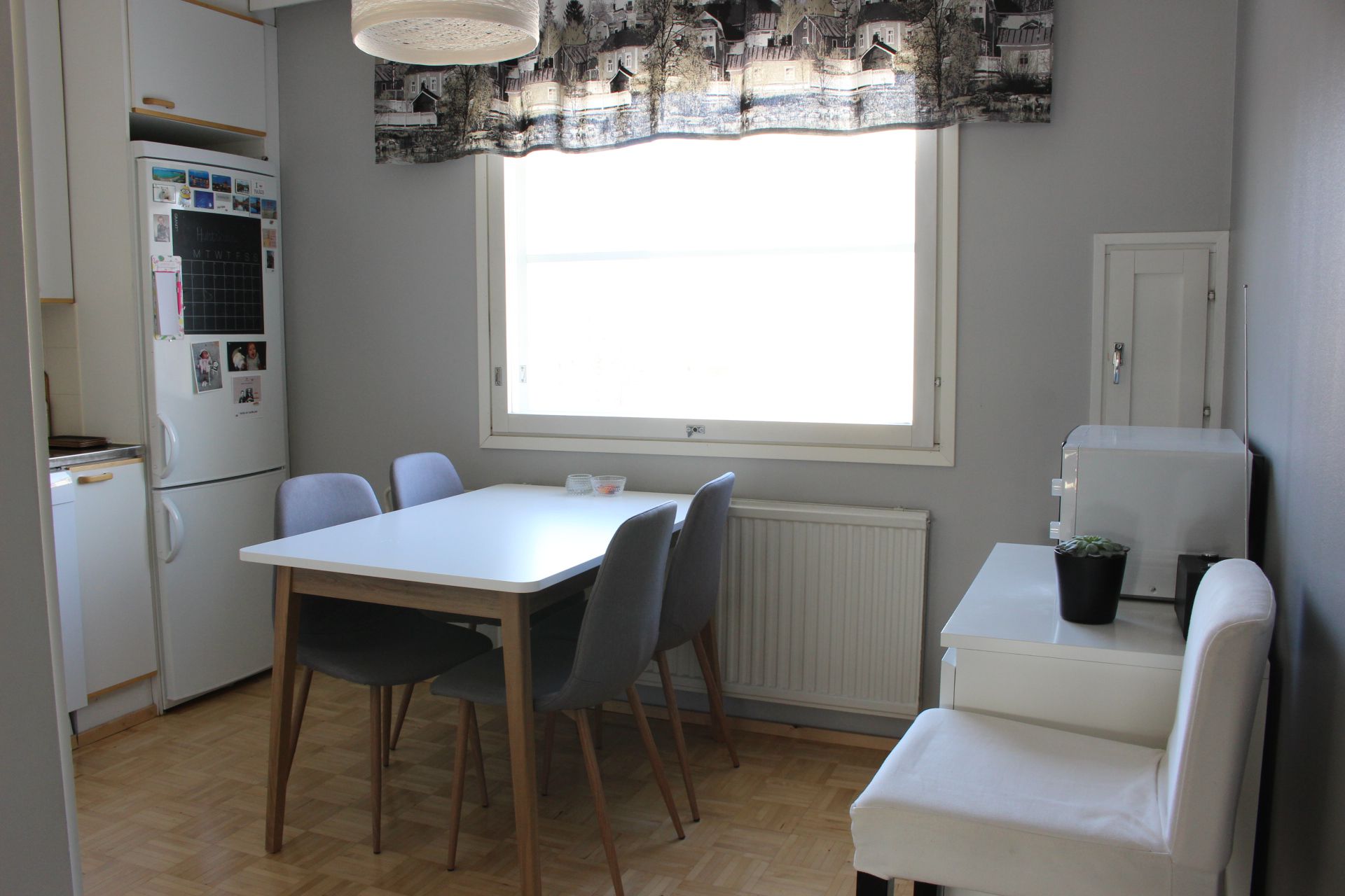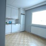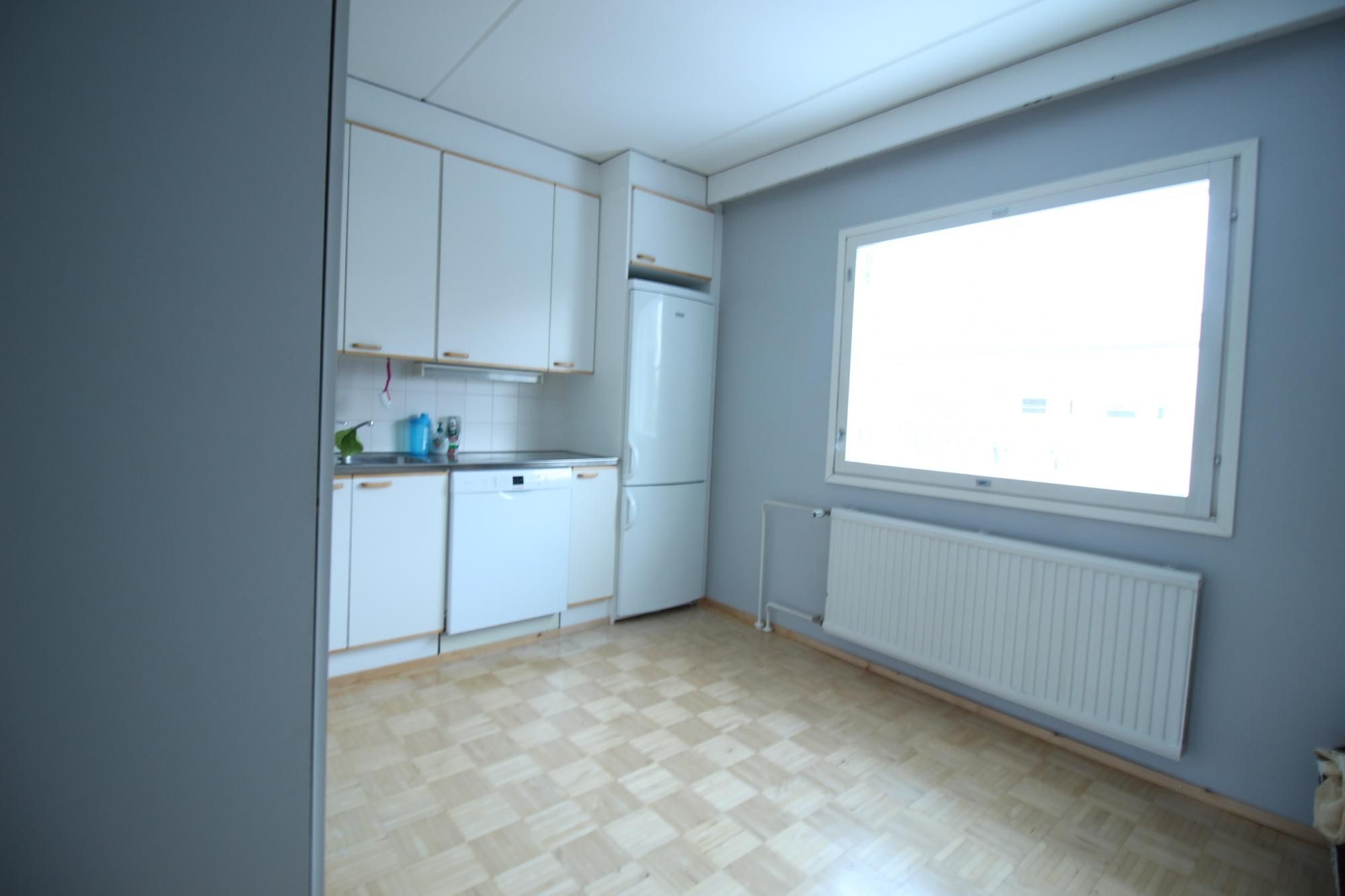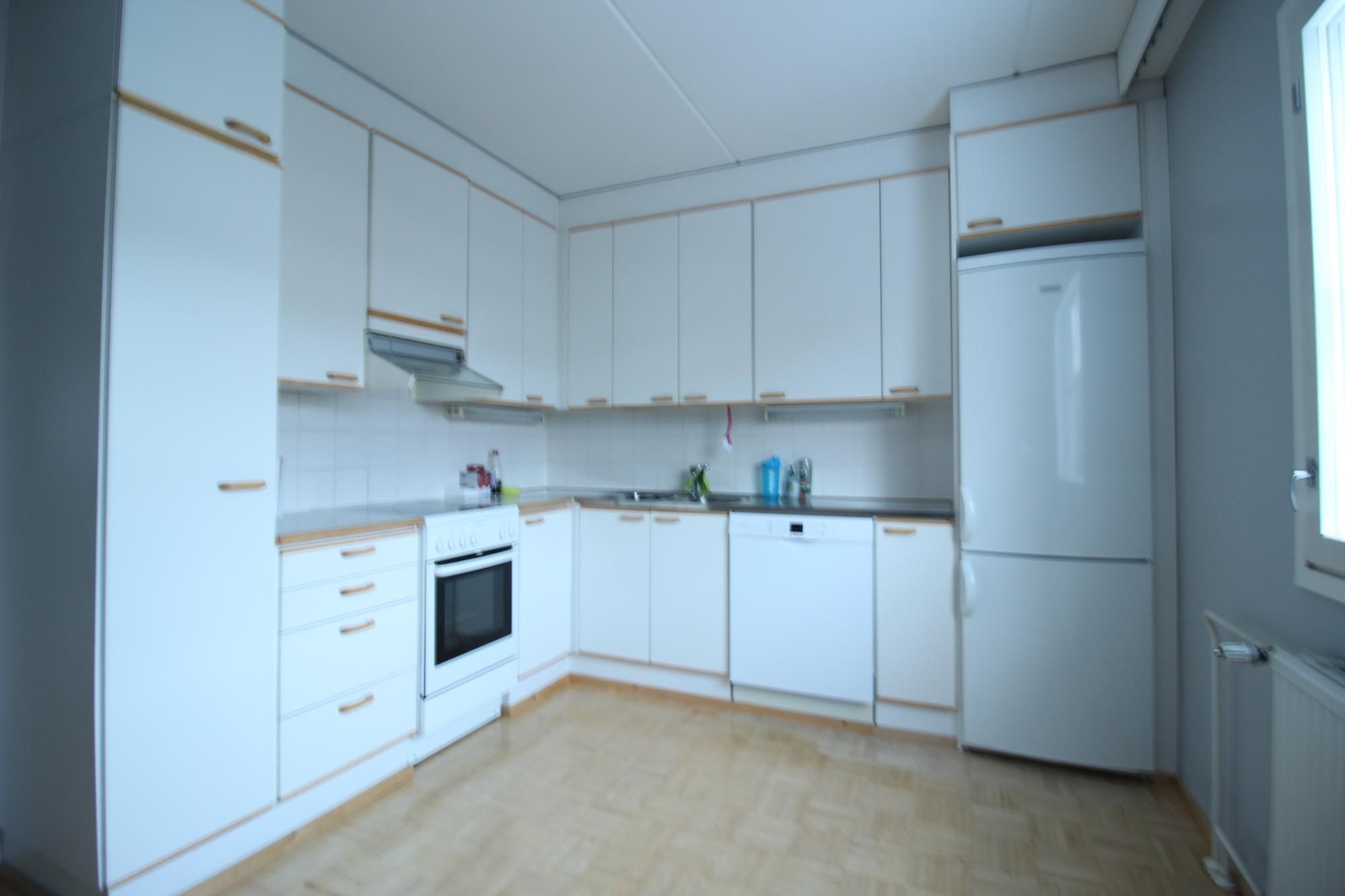 Keittiö on alkueräisessä. kunnossa, varusteina on jää/paskastinkaappi, liesi sekä perinteinen liesituuletin ja astianpesukone.