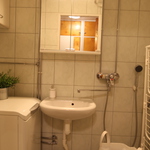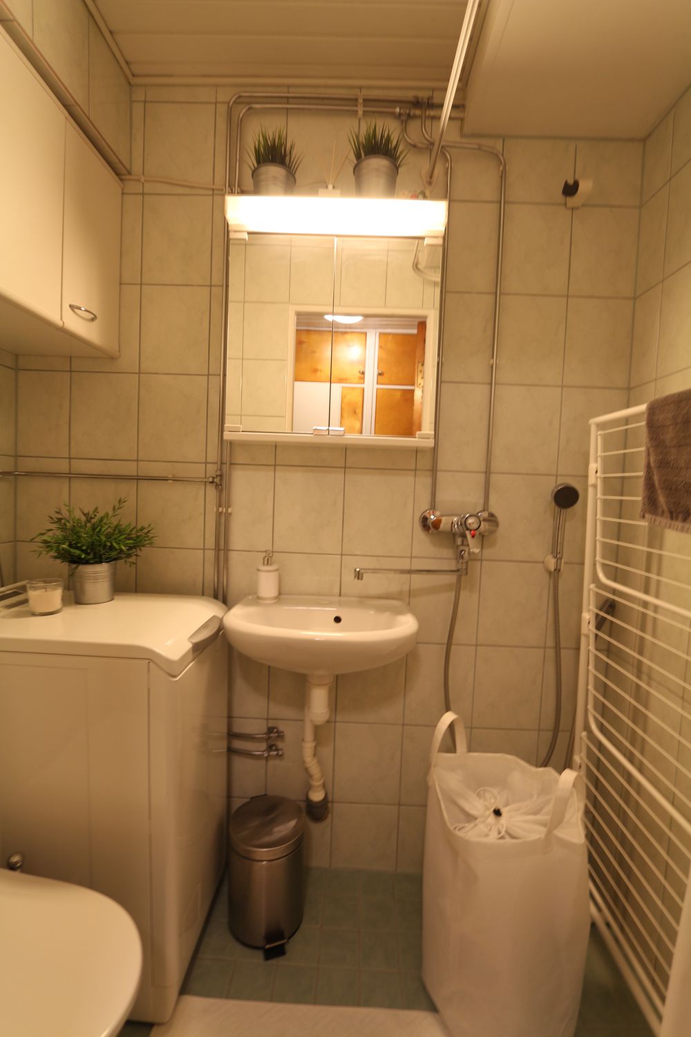 Kylpyhuoneessa tila kapealle pyykinpesukoneelle.
