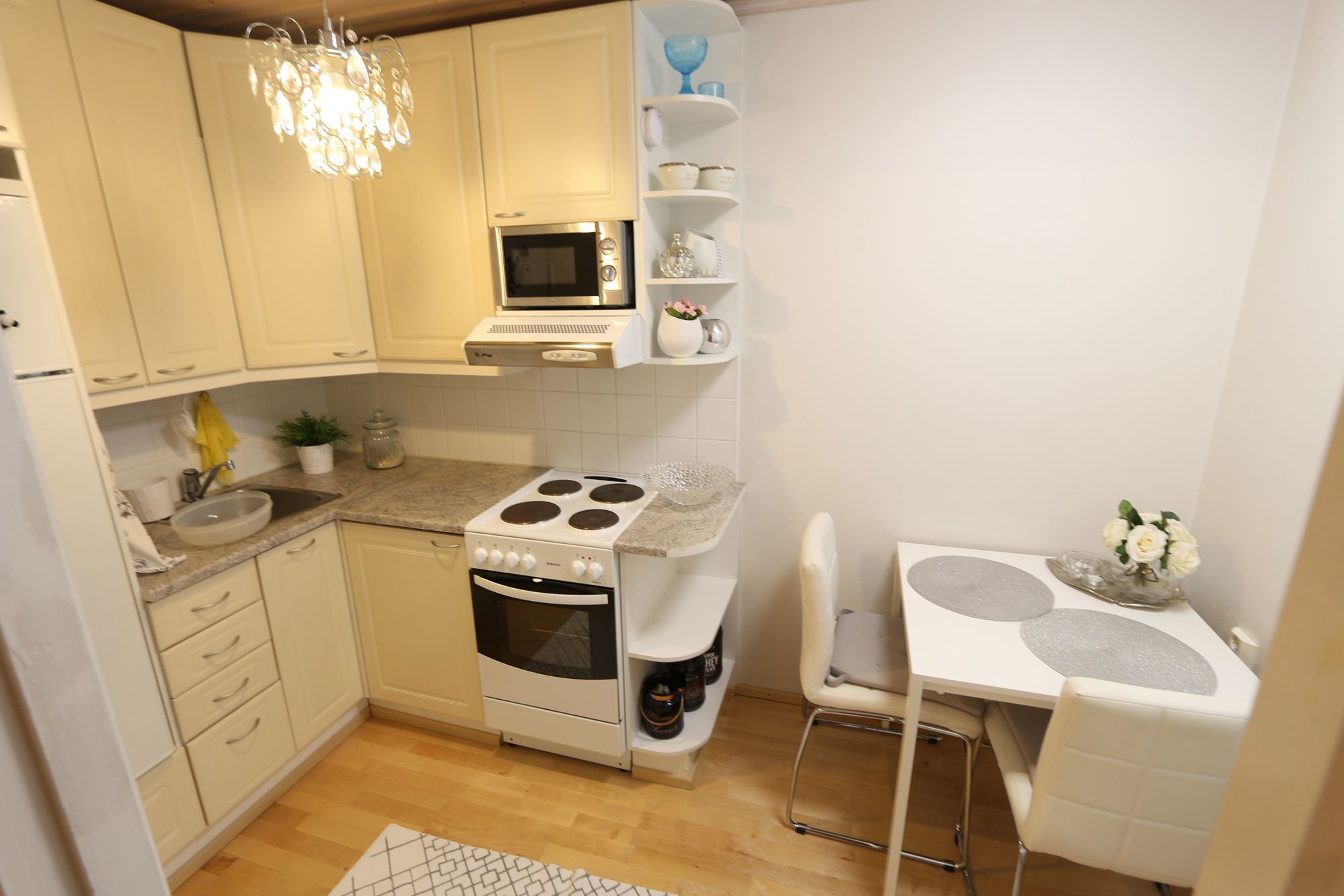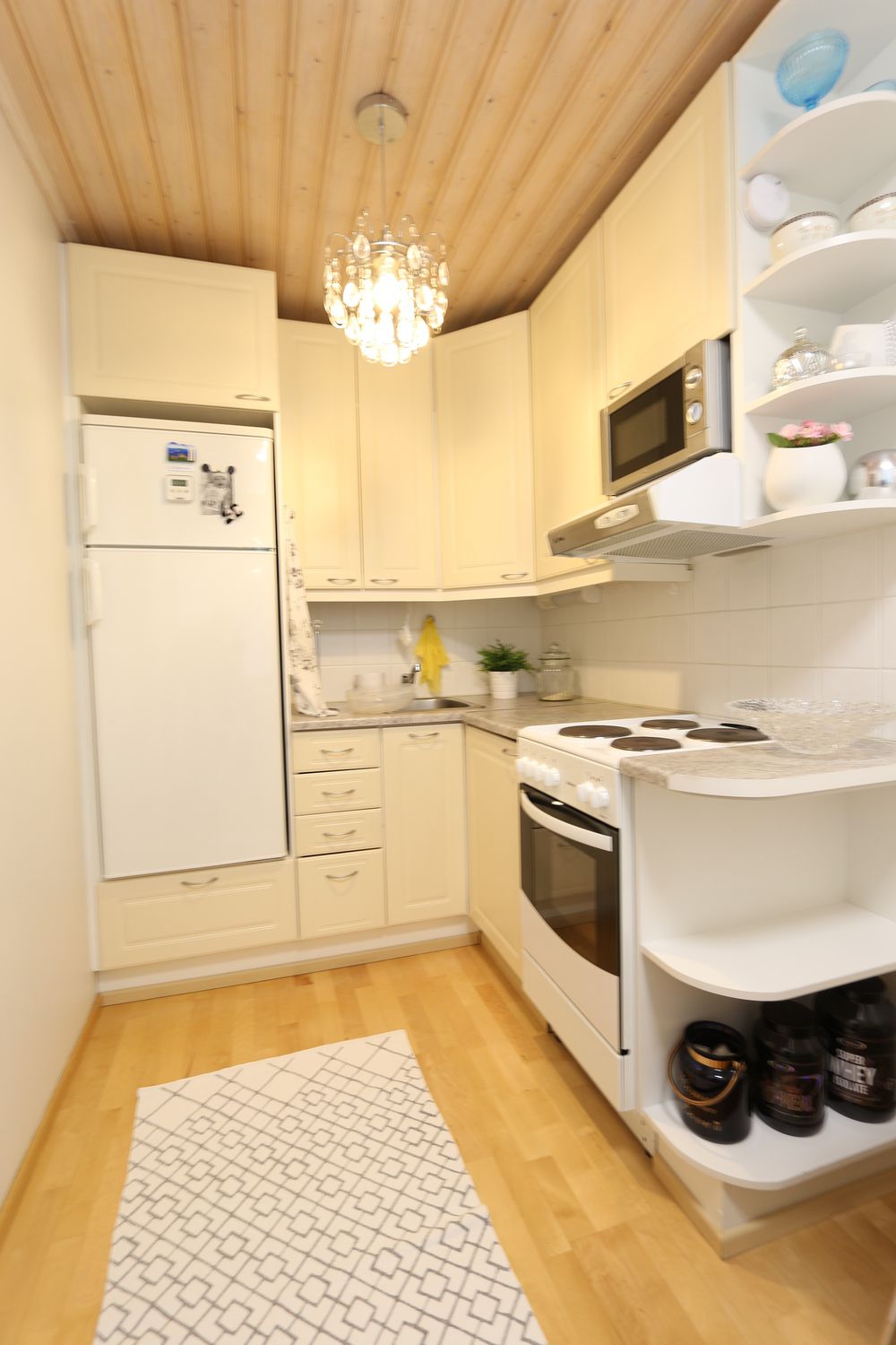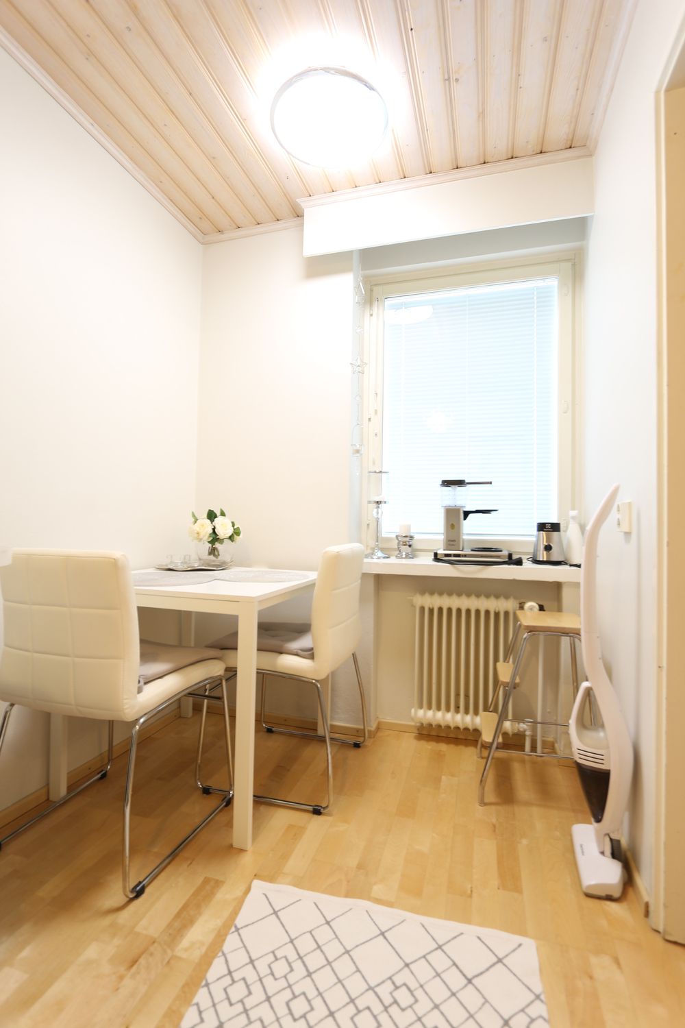 Ikkunat rauhalliselle sisäpihalle. Toimiva pohjaratkaisu, asunnossa pieni keittiö, kylpyhuone, huone alkovilla sekä eteinen. Ikkunoissa sälekaihtimet. Leveät vanhanajan ikkunalaudat.