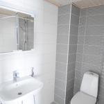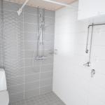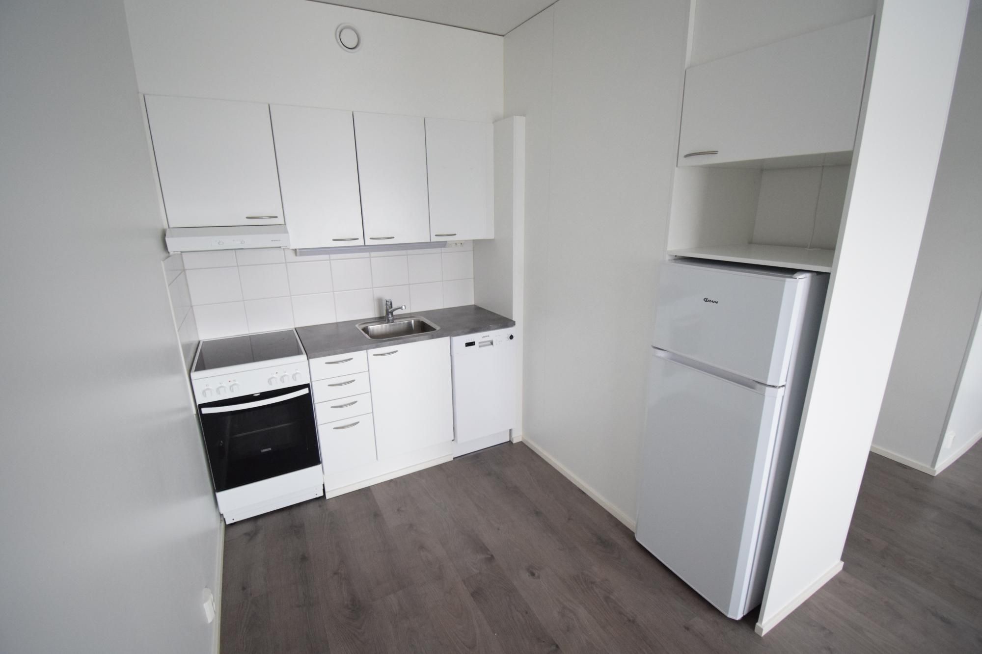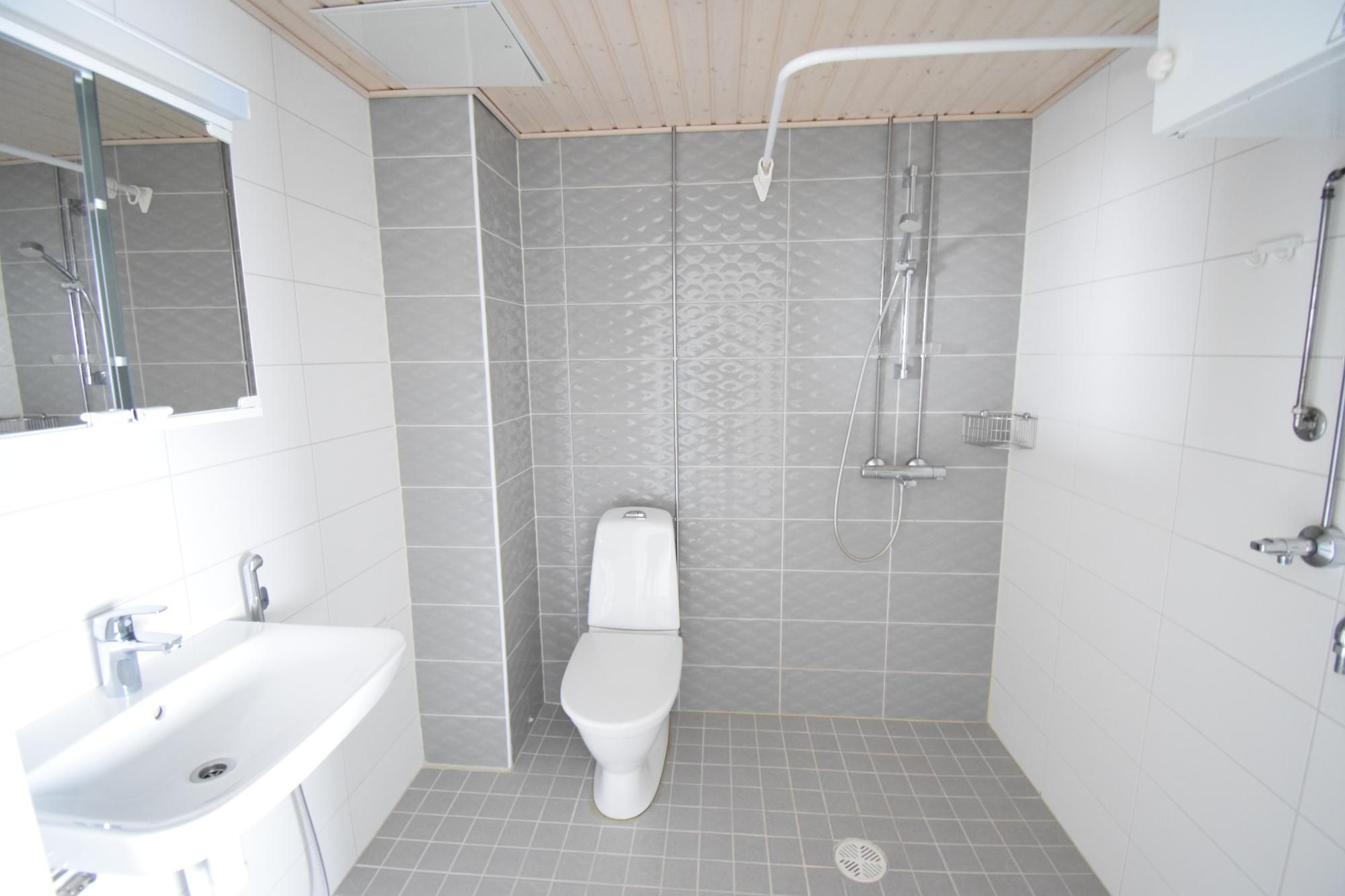 Keittiössä liesi, liesituuletin, jenkkikaappi ja astianpesukone. Valkoharmaassa kaakeloidussa kylpyhuoneessa pesukoneliitäntä.