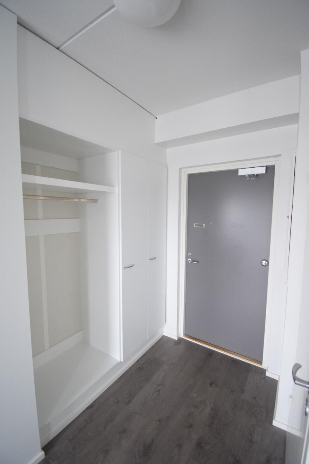 Asunnossa vaaleat seinäpinnat ja laminaatti lattiassa. Eteisessä kivasti kaappitilaa.