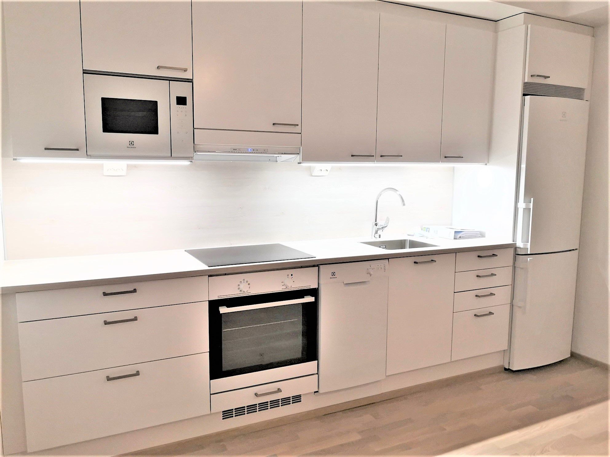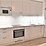 Erittäin tasokkaasti varusteltu asunto; keittiön varusteluun kuuluvat astianpesukone, kalusteisiin integroidut liesitaso, uuni sekä mikroaaltouuni ja jää/pakastinkaappi sekä seinäkaapin alta ulosvedettävä slim-mallinen liesikupu.