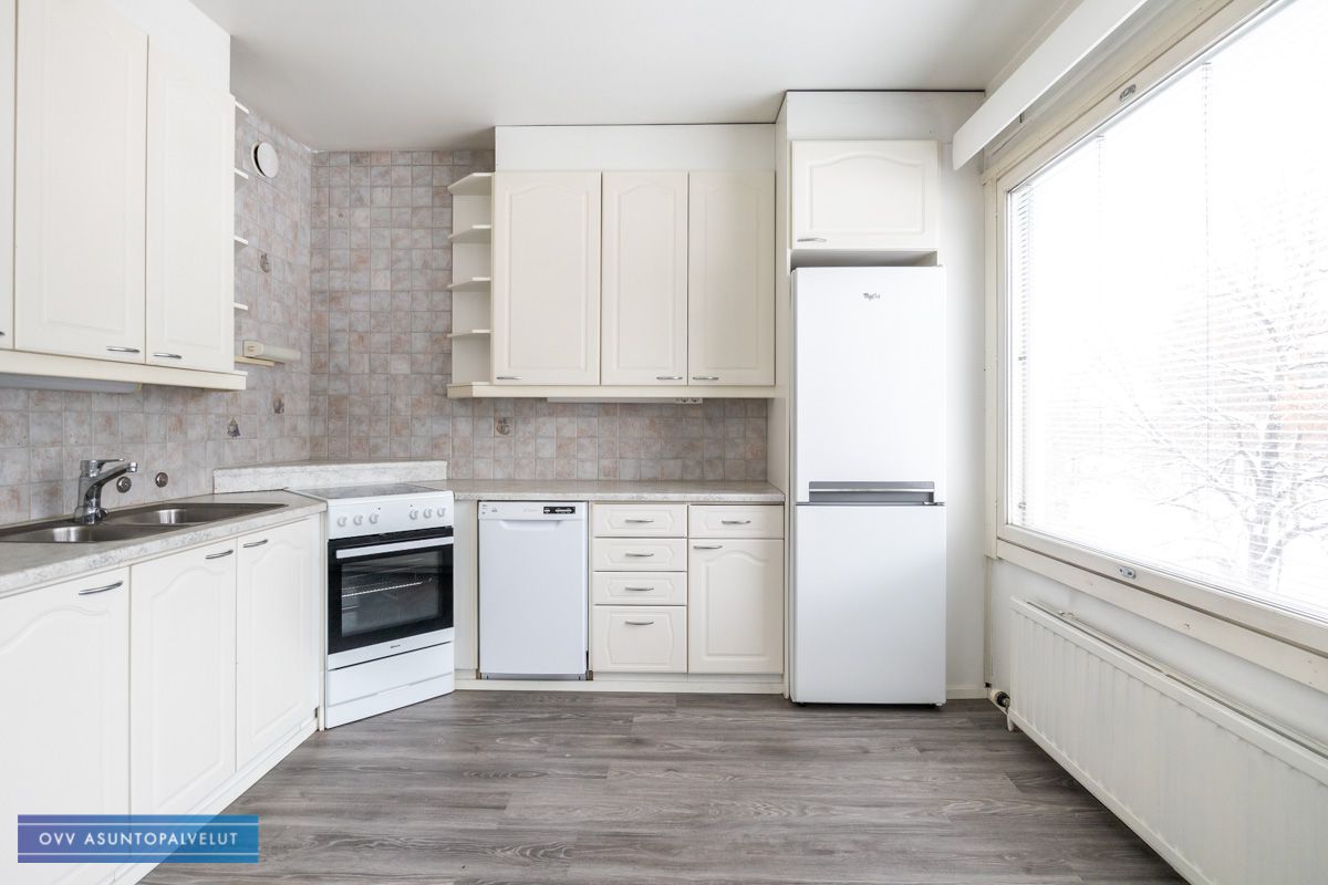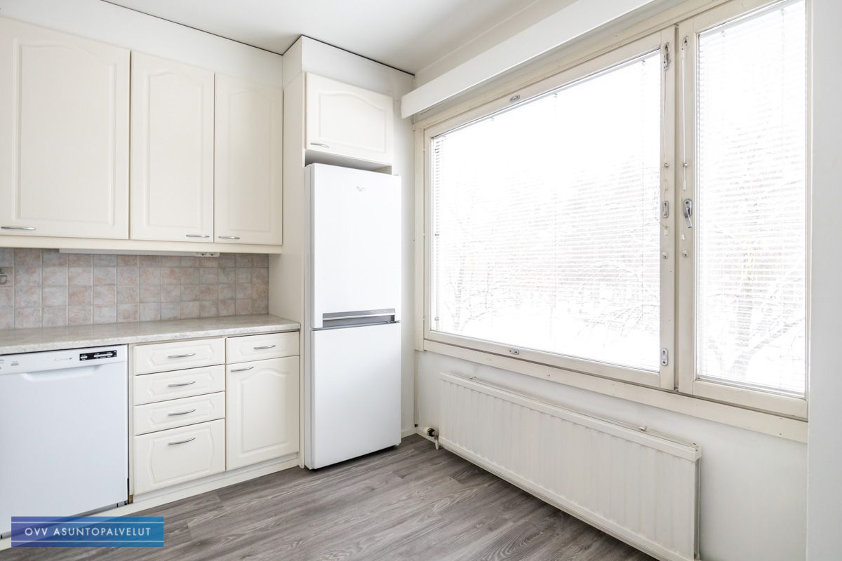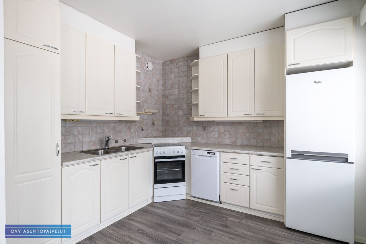 Keittiössä on valtavasti kaappi- ja laskutilaa, lisäksi löytyy myös tiskikone. Keittiöön sopii myös ruokapöytä, joten muut tilat jäävät olohuone- ja makuuhuonekäyttöön. Lemmikit neuvoteltavissa.