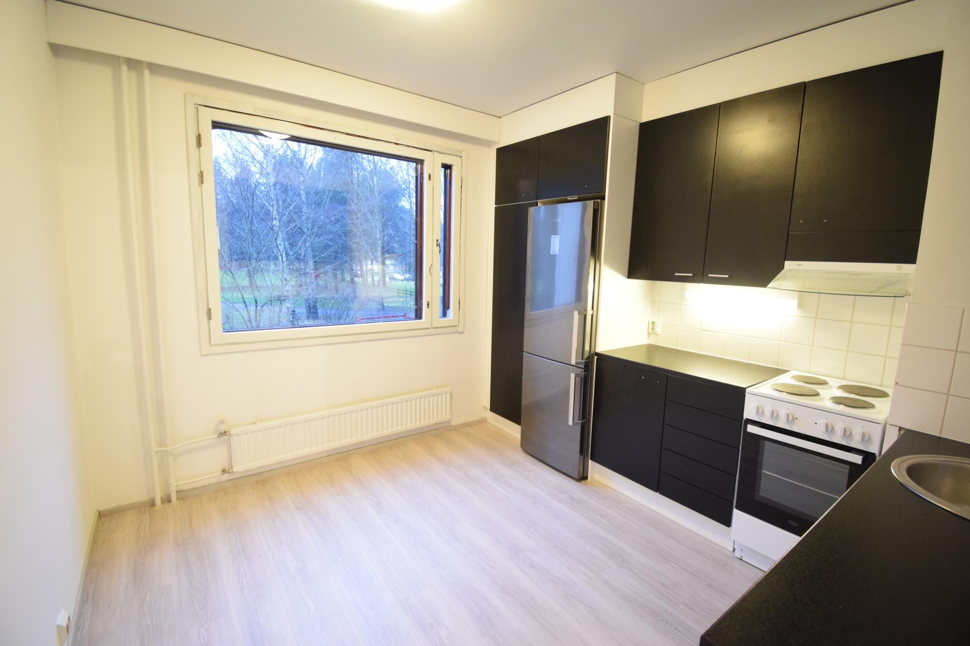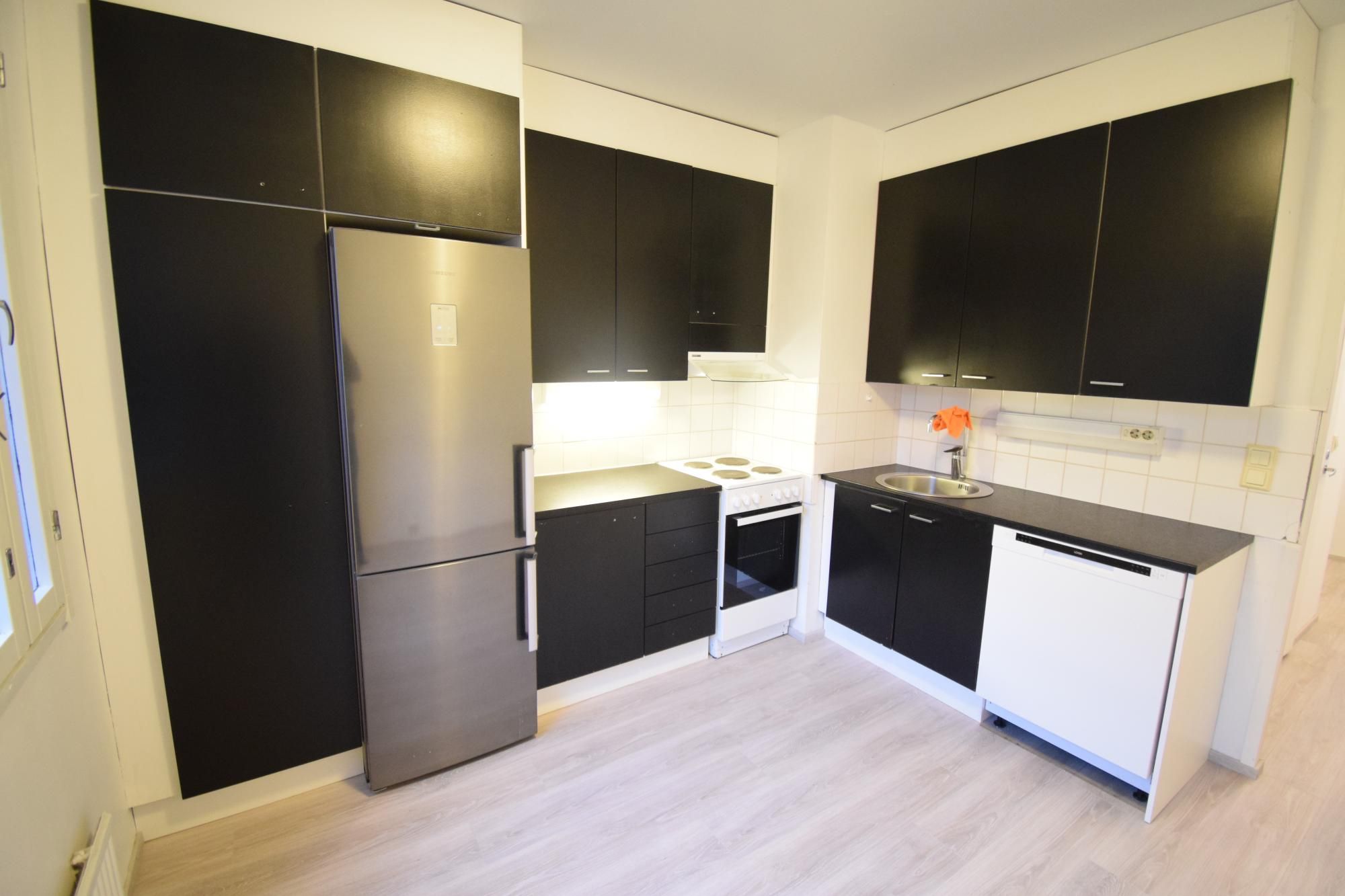 Asunnossa on hieno keittiö kodin- ja astianpesukoineineen. Kylpyhuoneessa on hyvin tilaa pyykinpesukoneelle.