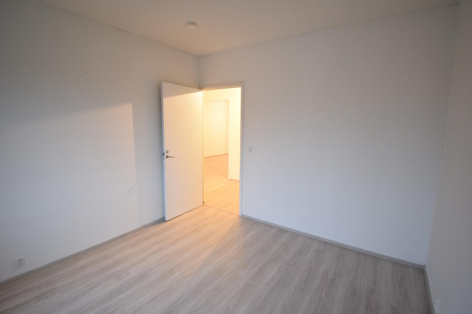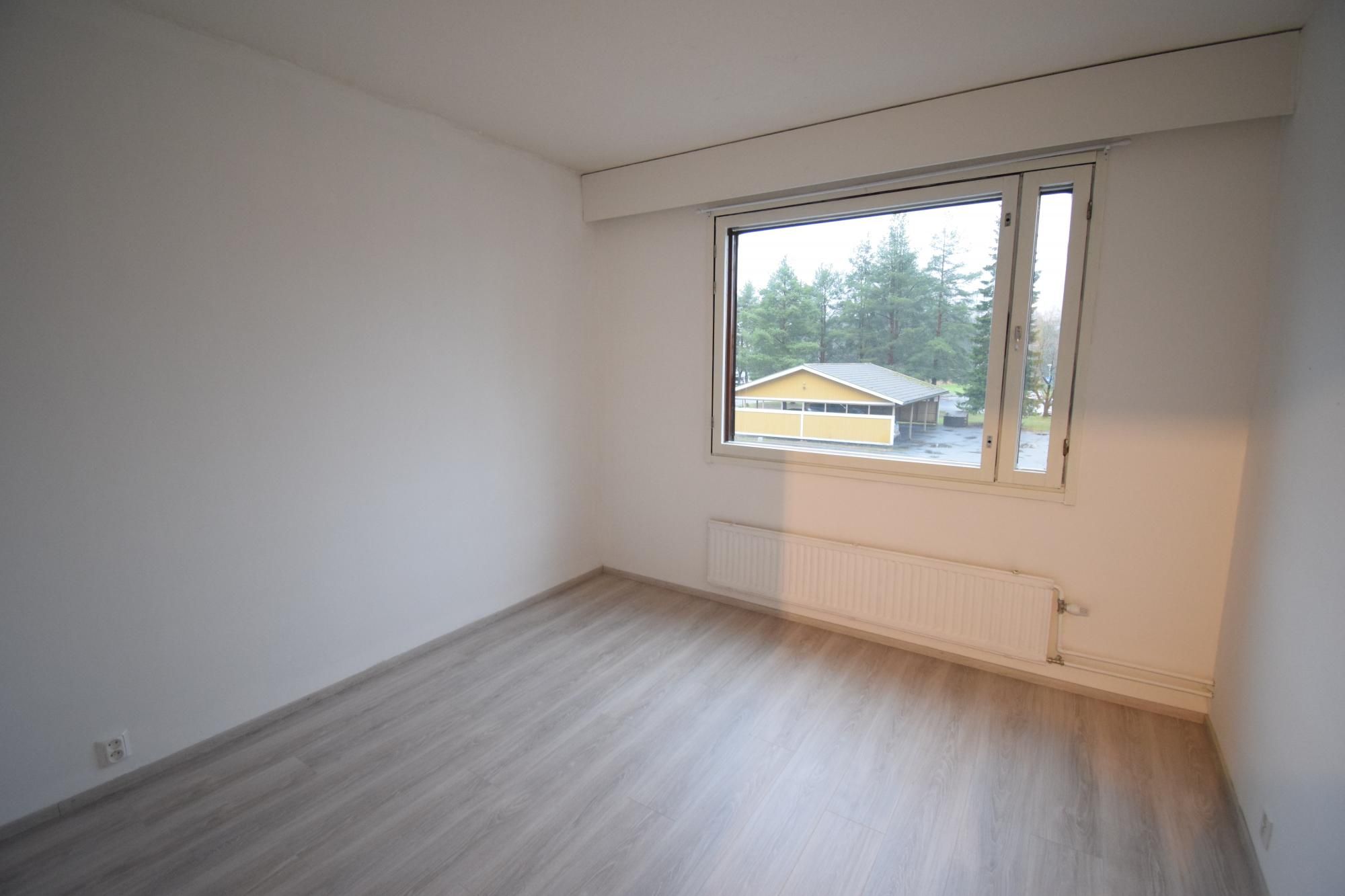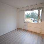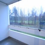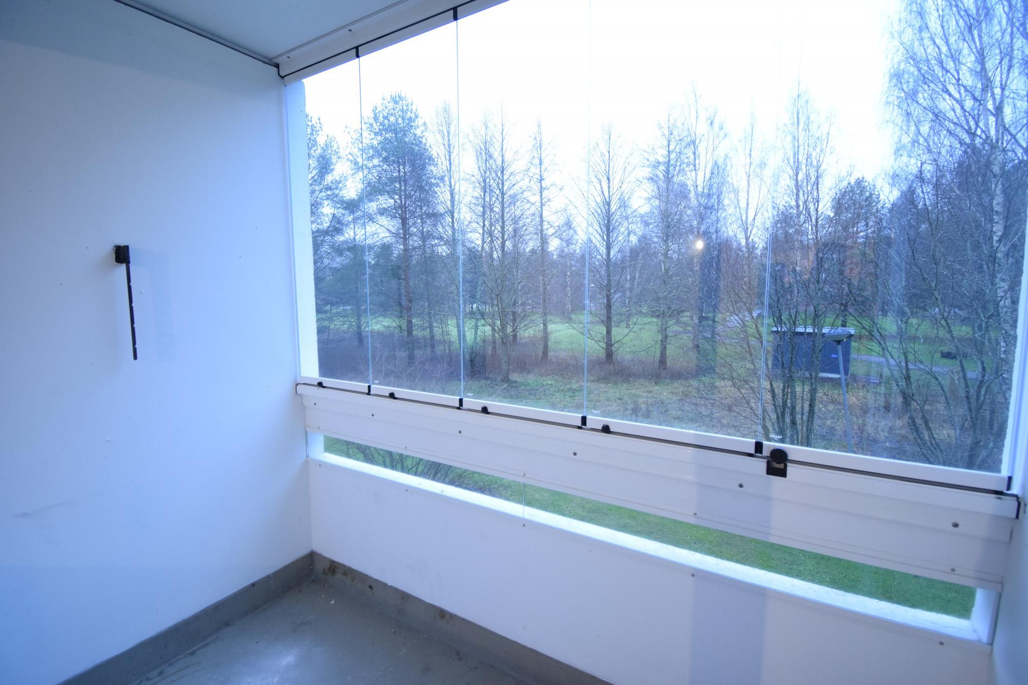 Lasitettu siisti parveke, josta kivat vehreät maisemat. Asunnon seiniä on juuri maalattu uudelleen.