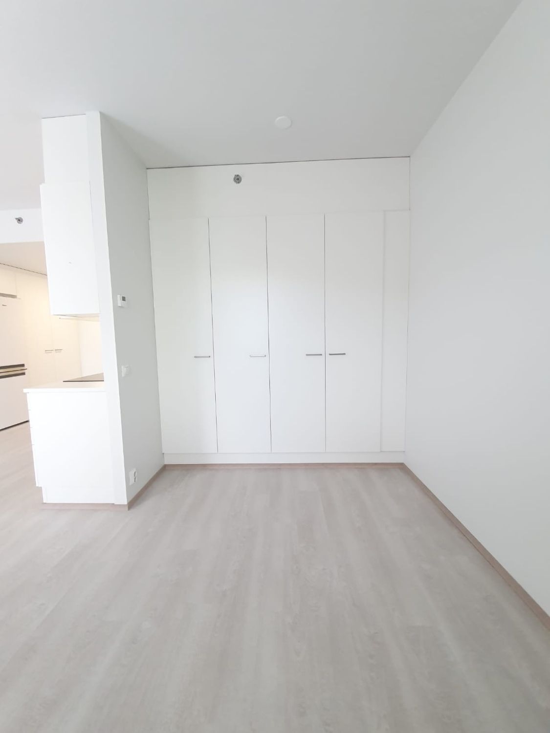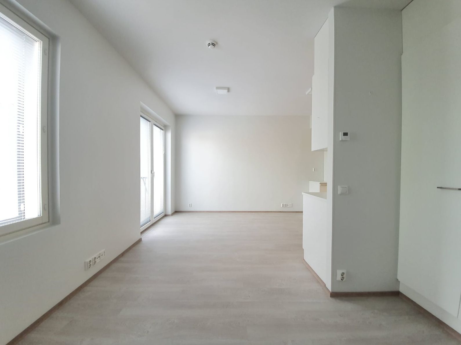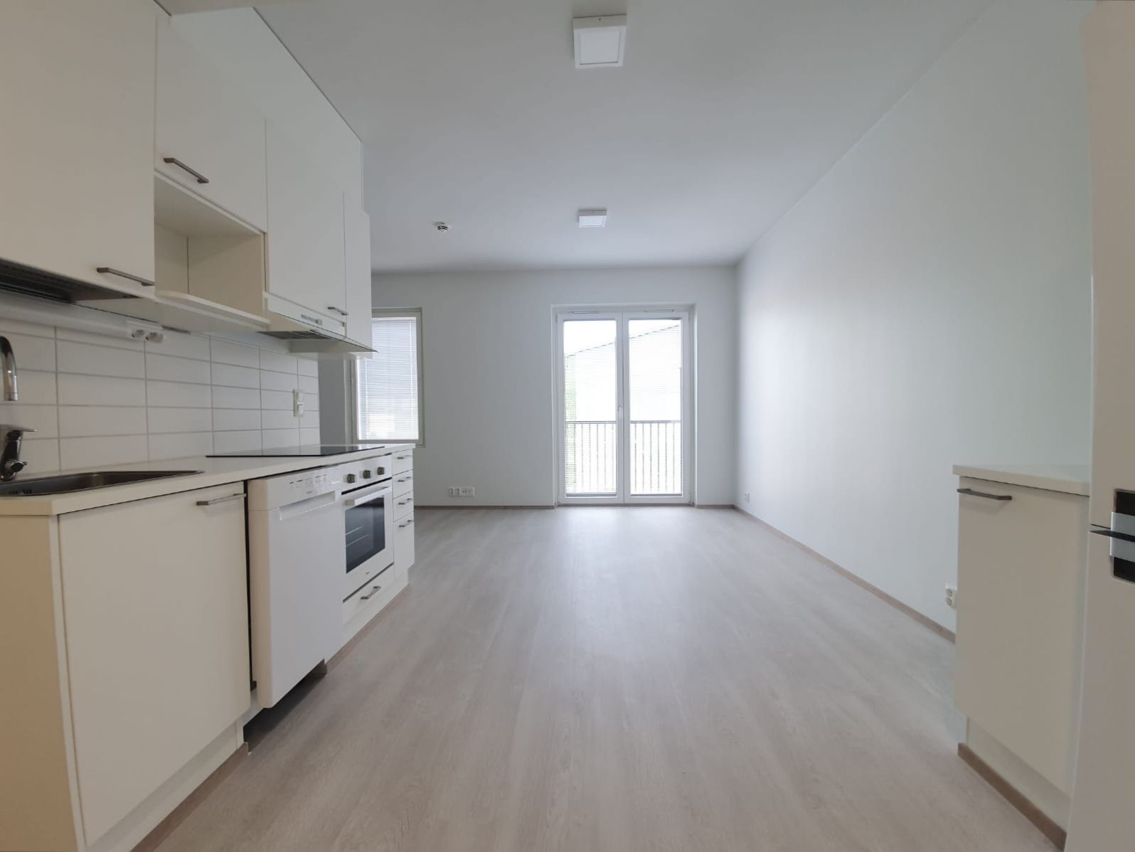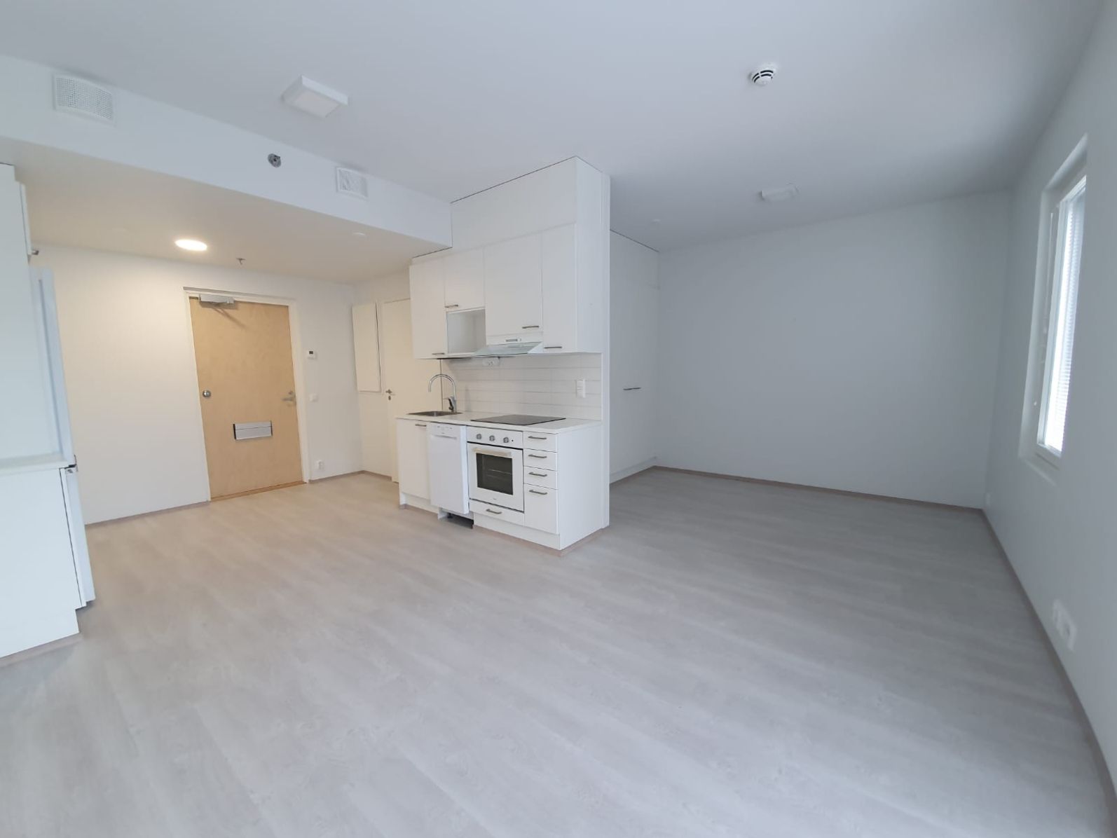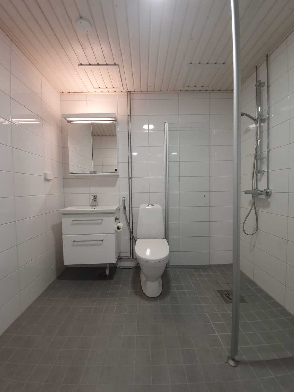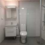 Lattiat ovat vaaleaa laminaattia, seinät maalattu valkoiseksi. Keittotilasta löytyy valkoiset modernit kodinkoneet, astianpesukone, jääkaappipakastin sekä keraaminen liesi. Laatoitetussa kylpyhuoneessa lattialämmitys, tila ja liitäntä pesukoneelle.
