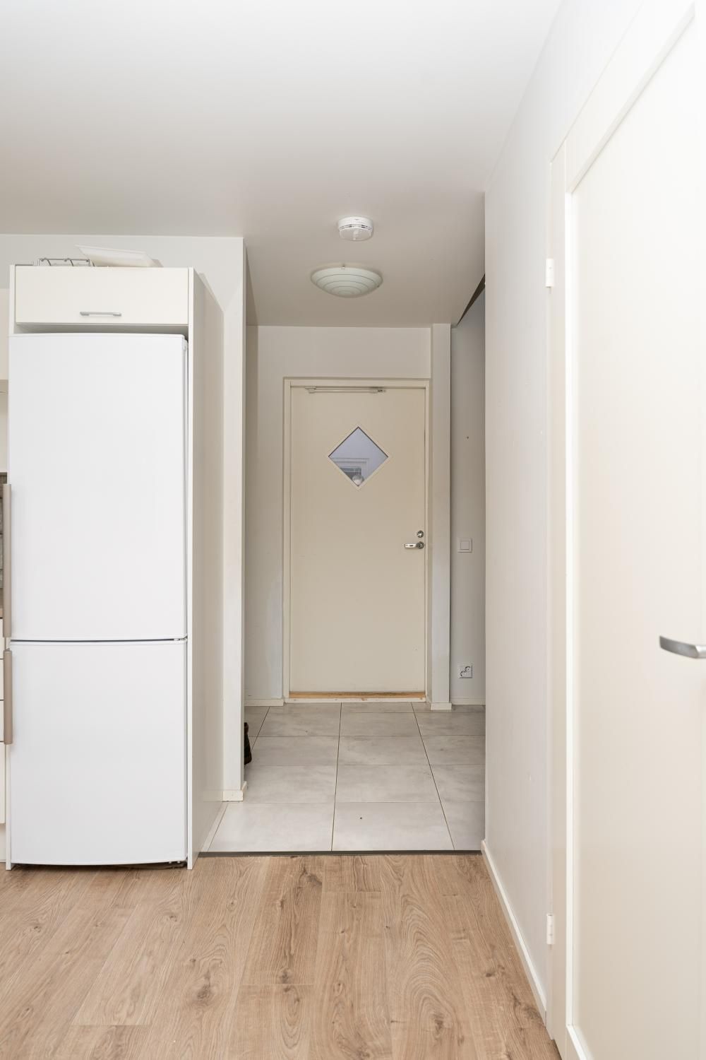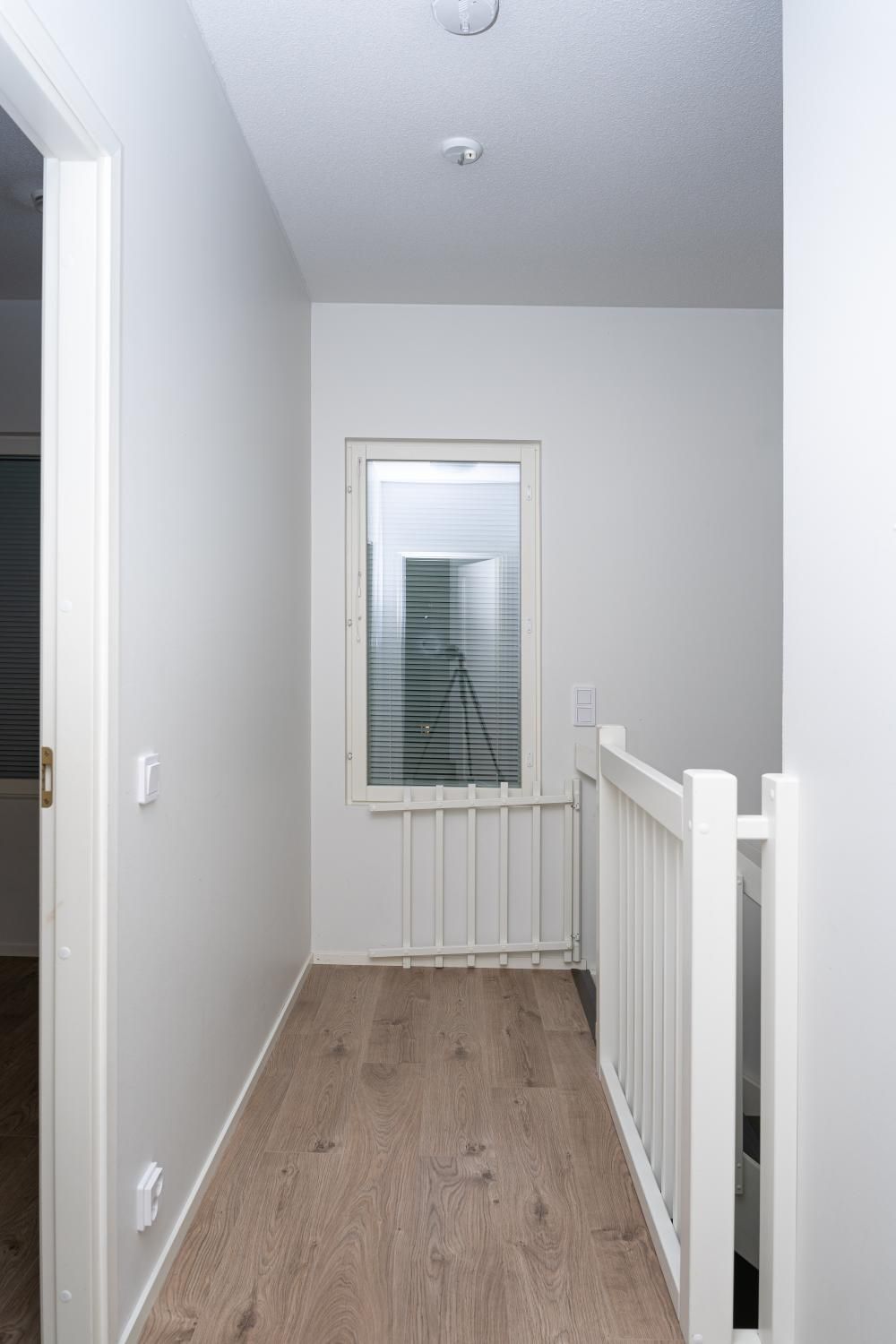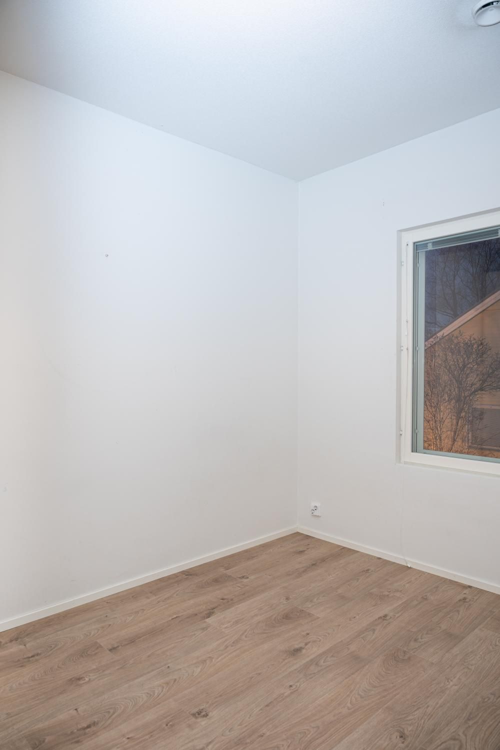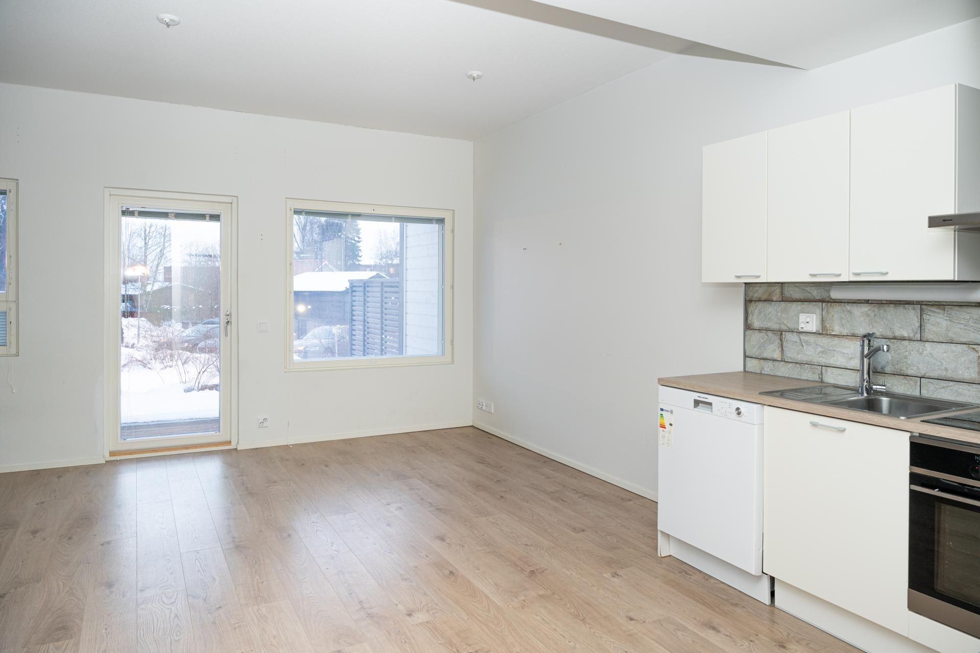 Alakerrassa keittiö ja olohuone, yläkerrassa makuuhuoneet. Lattiat laminaattia, seinät maalattu. Keittiössä jääkaappipakastin, keraaminen liesi ja astianpesukone.