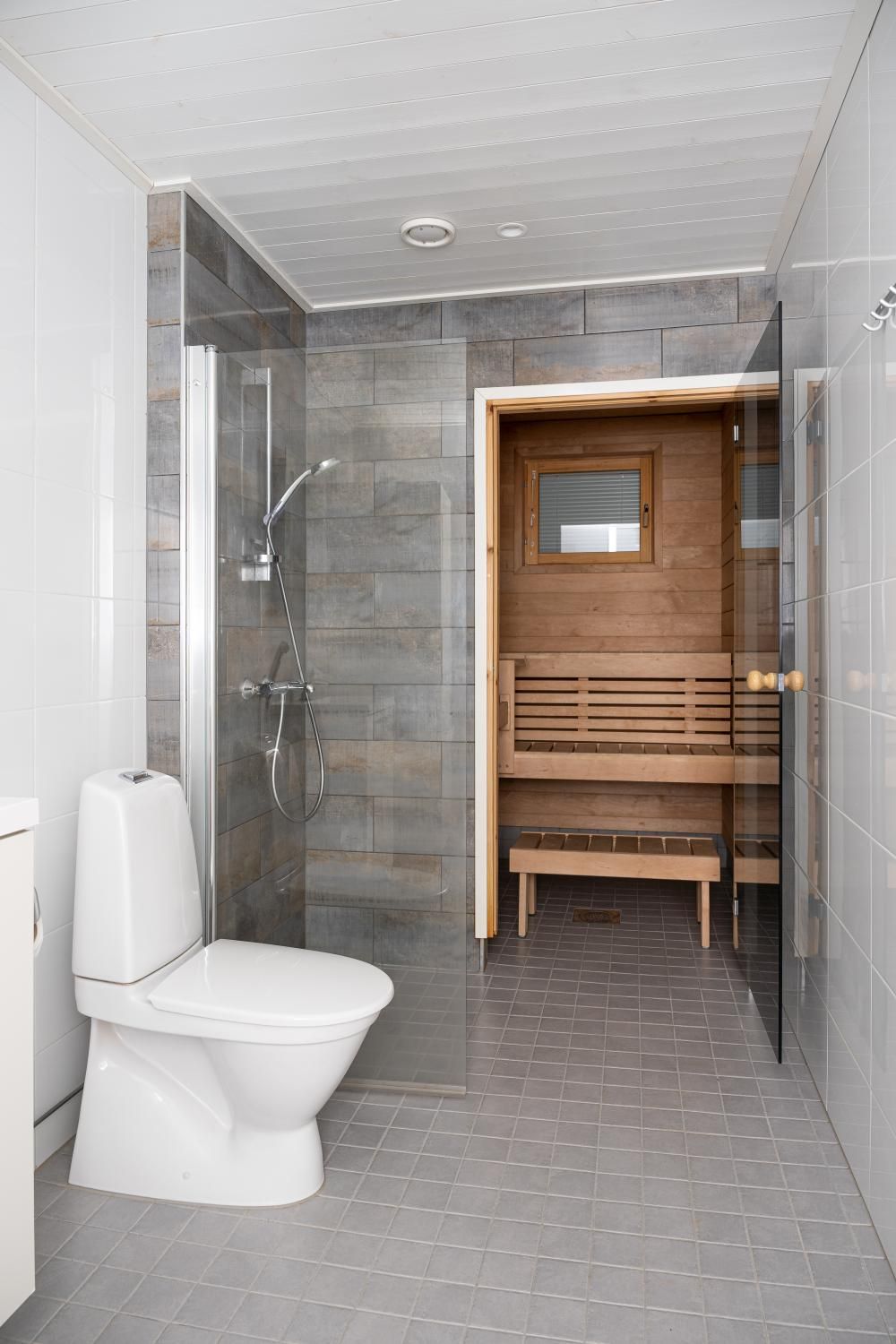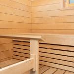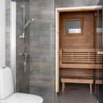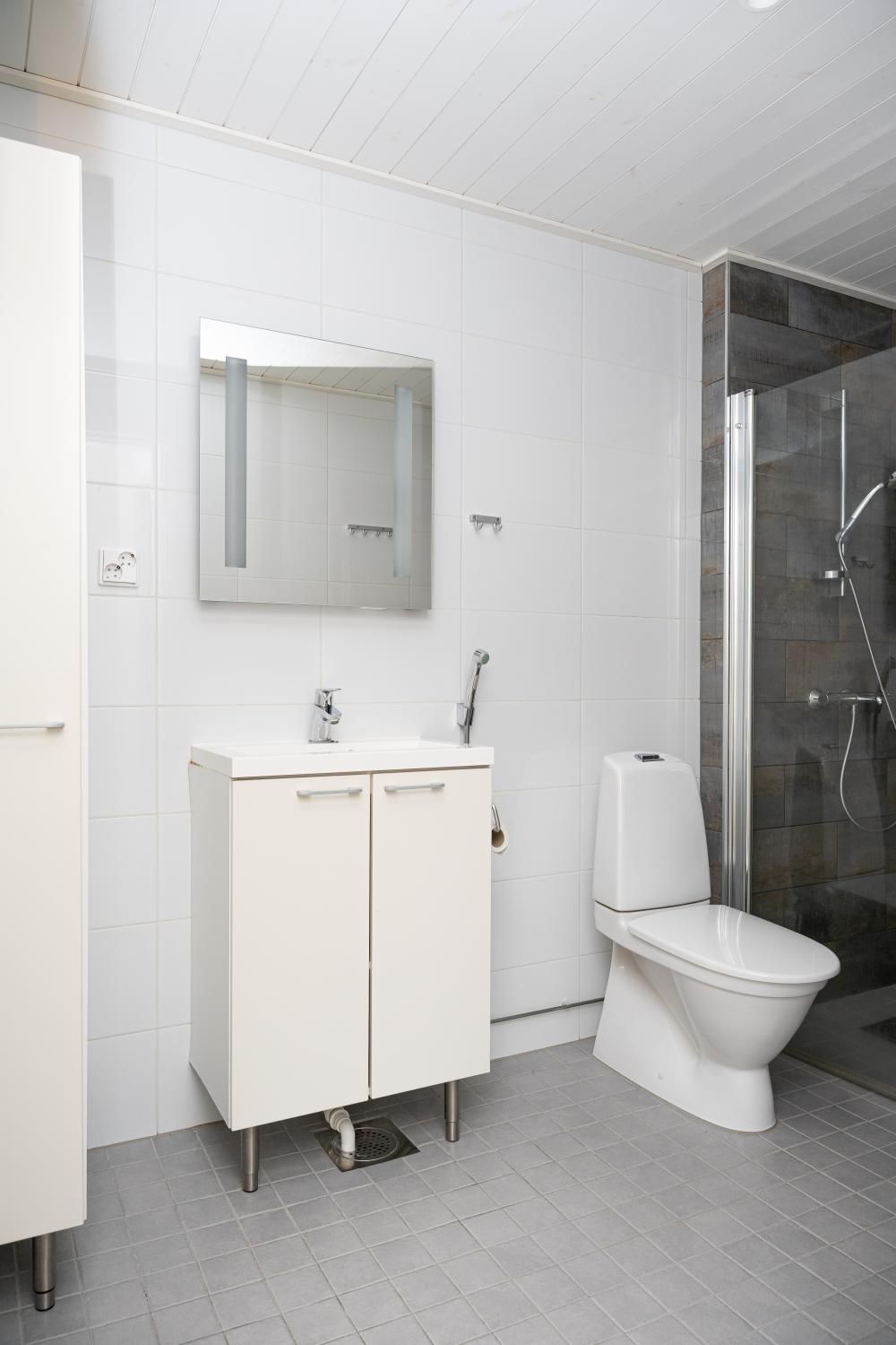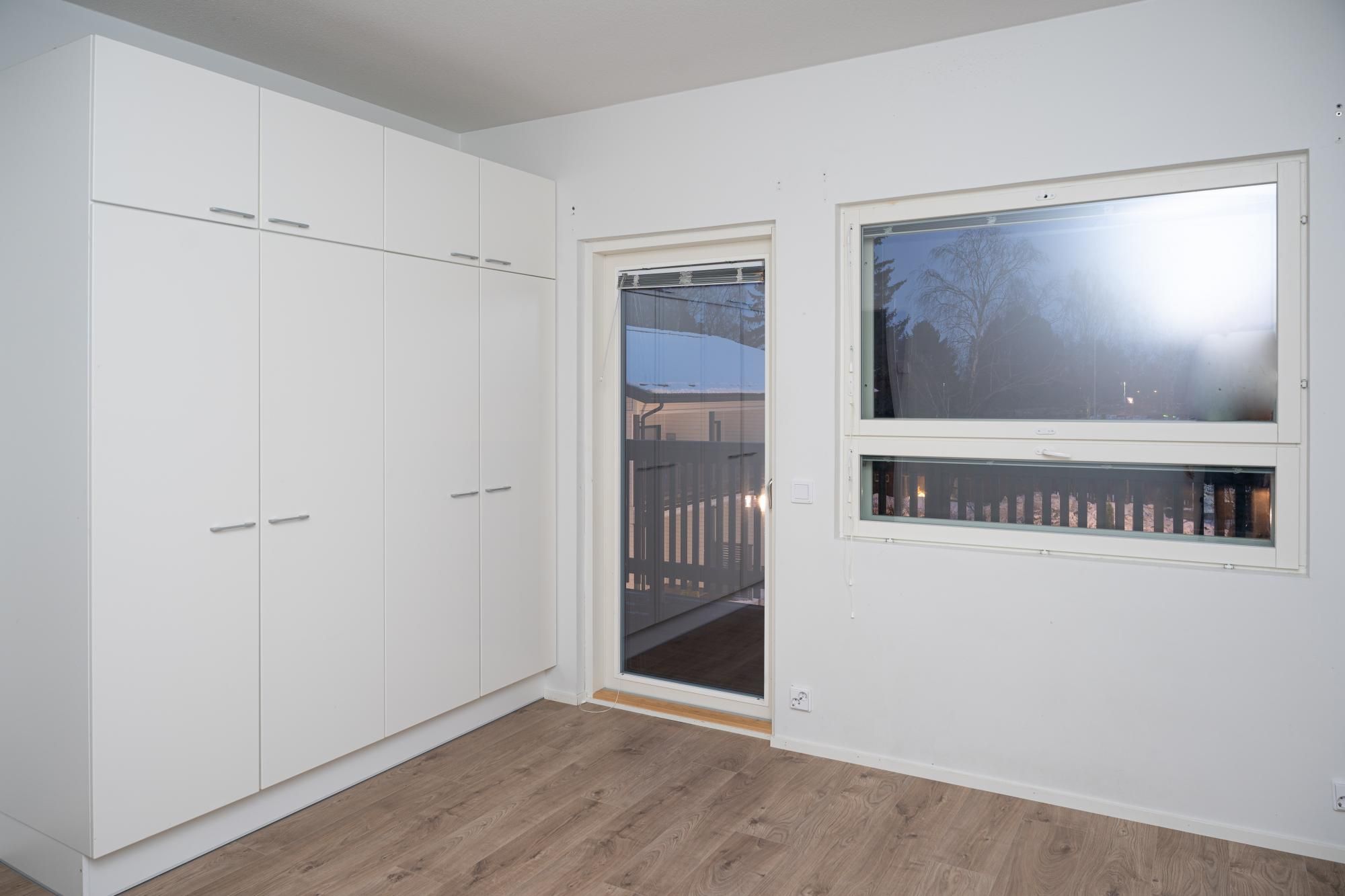 Makuuhuoneessa vaatekaapit. Kaapistot lisäksi eteisessä. Tilava kylpyhuone ja sauna, tila ja liitäntä pesukoneelle.