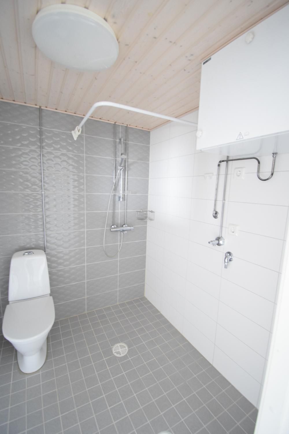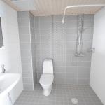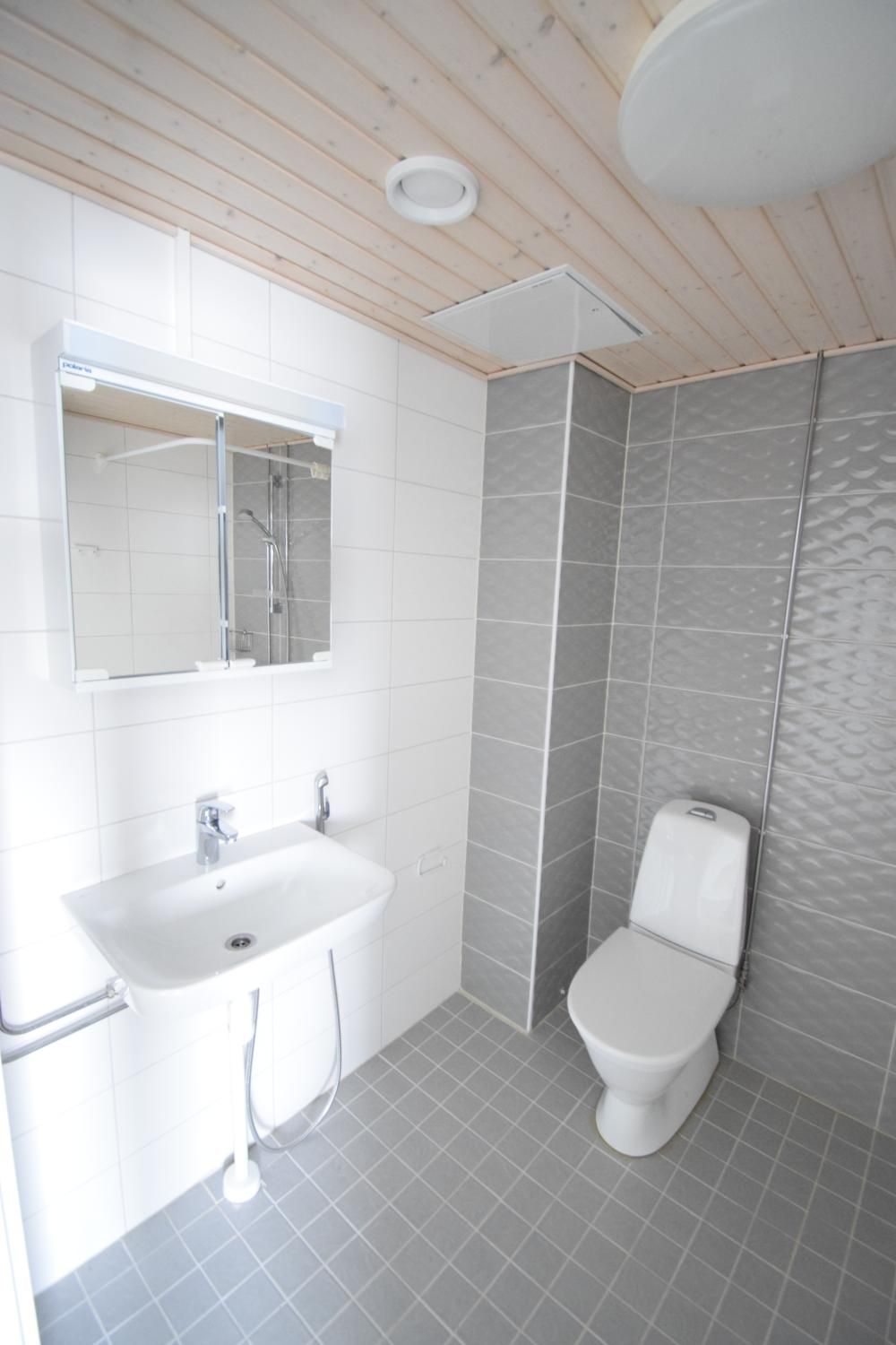 Keittiössä liesi, liesituuletin, jenkkikaappi ja astianpesukone. Valkoharmaassa kaakeloidussa kylpyhuoneessa pesukoneliitäntä.