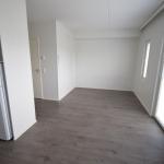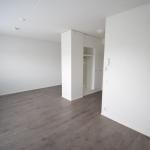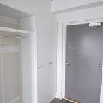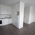 Asunnossa vaaleat seinäpinnat ja laminaatti lattiassa. Eteisessä kivasti kaappitilaa.