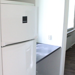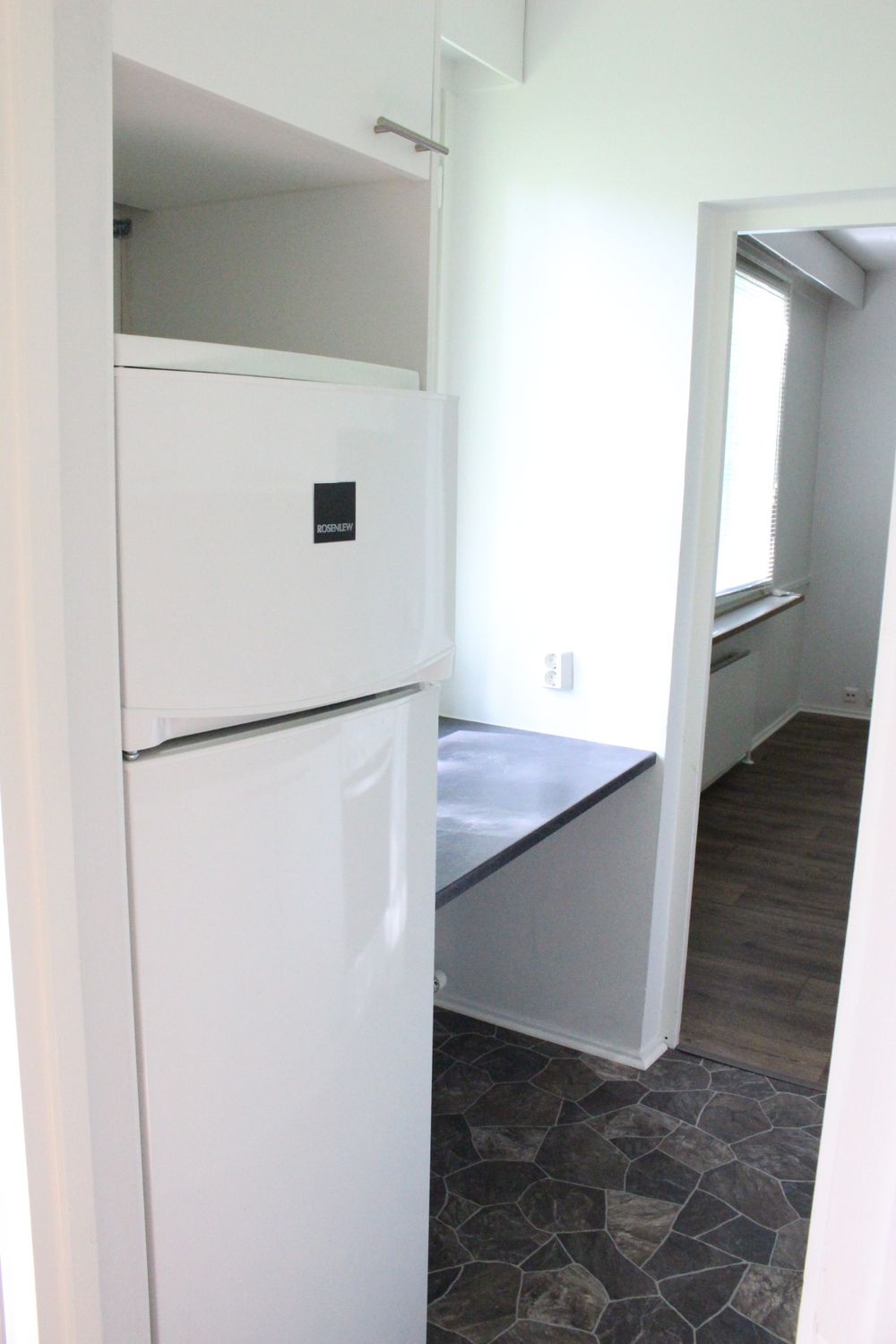 Keittokomerossa jää/pakastinkaappi(jenkkikaappi) ja liesi.