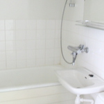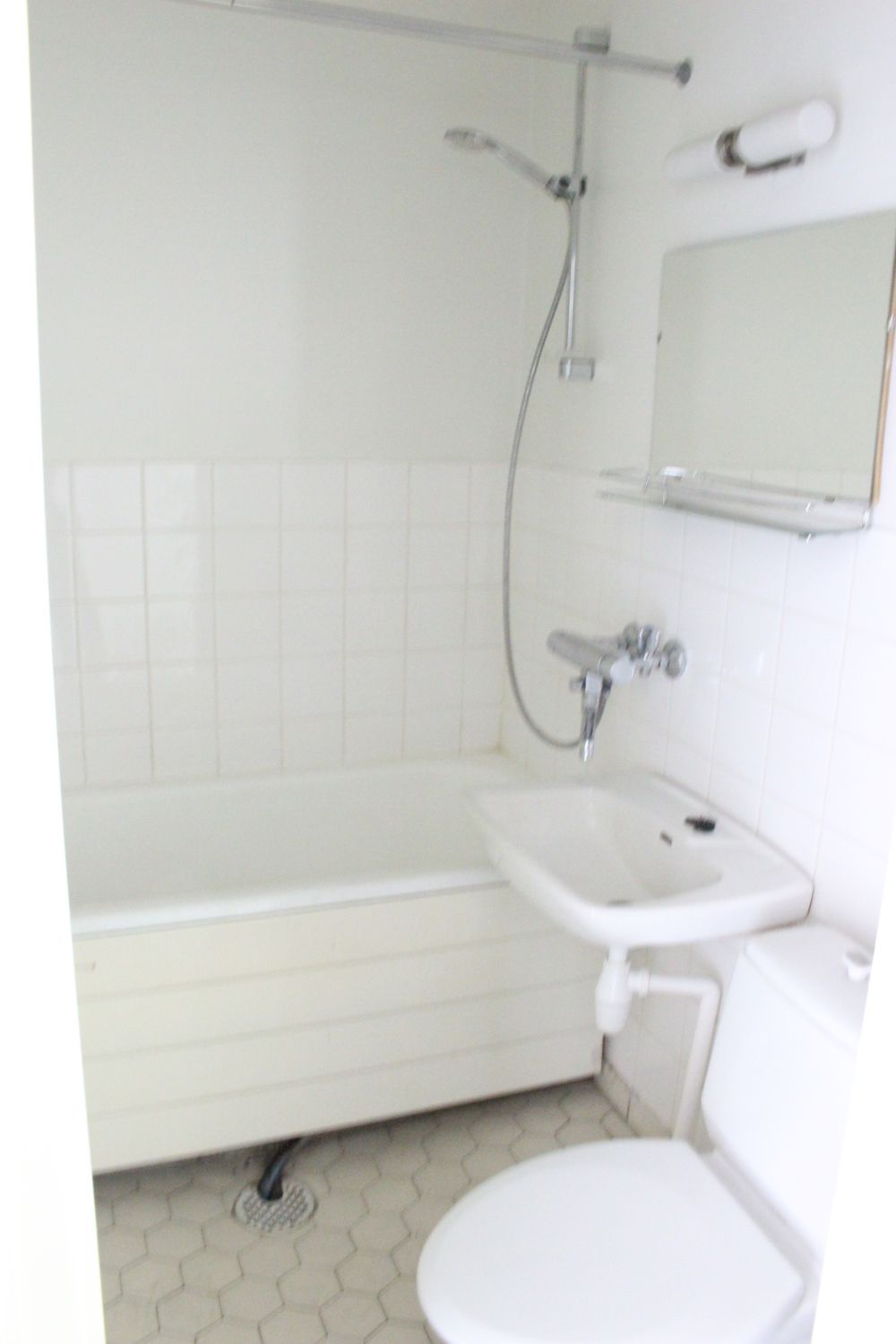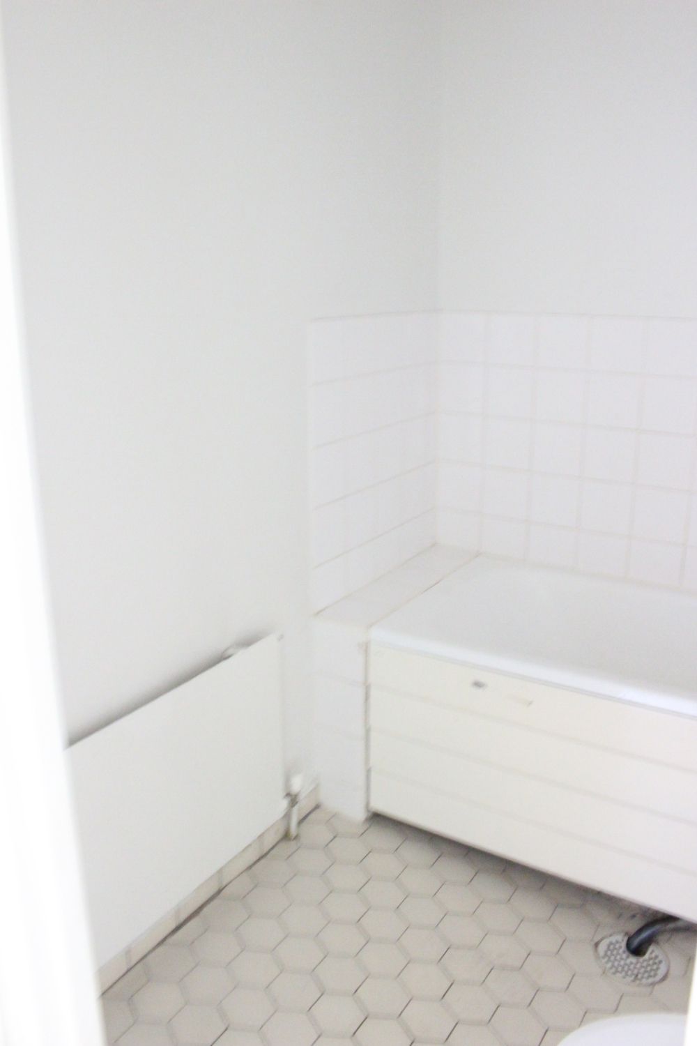 Kylpyhuoneessa amme ja pesukoneliitäntä.