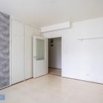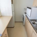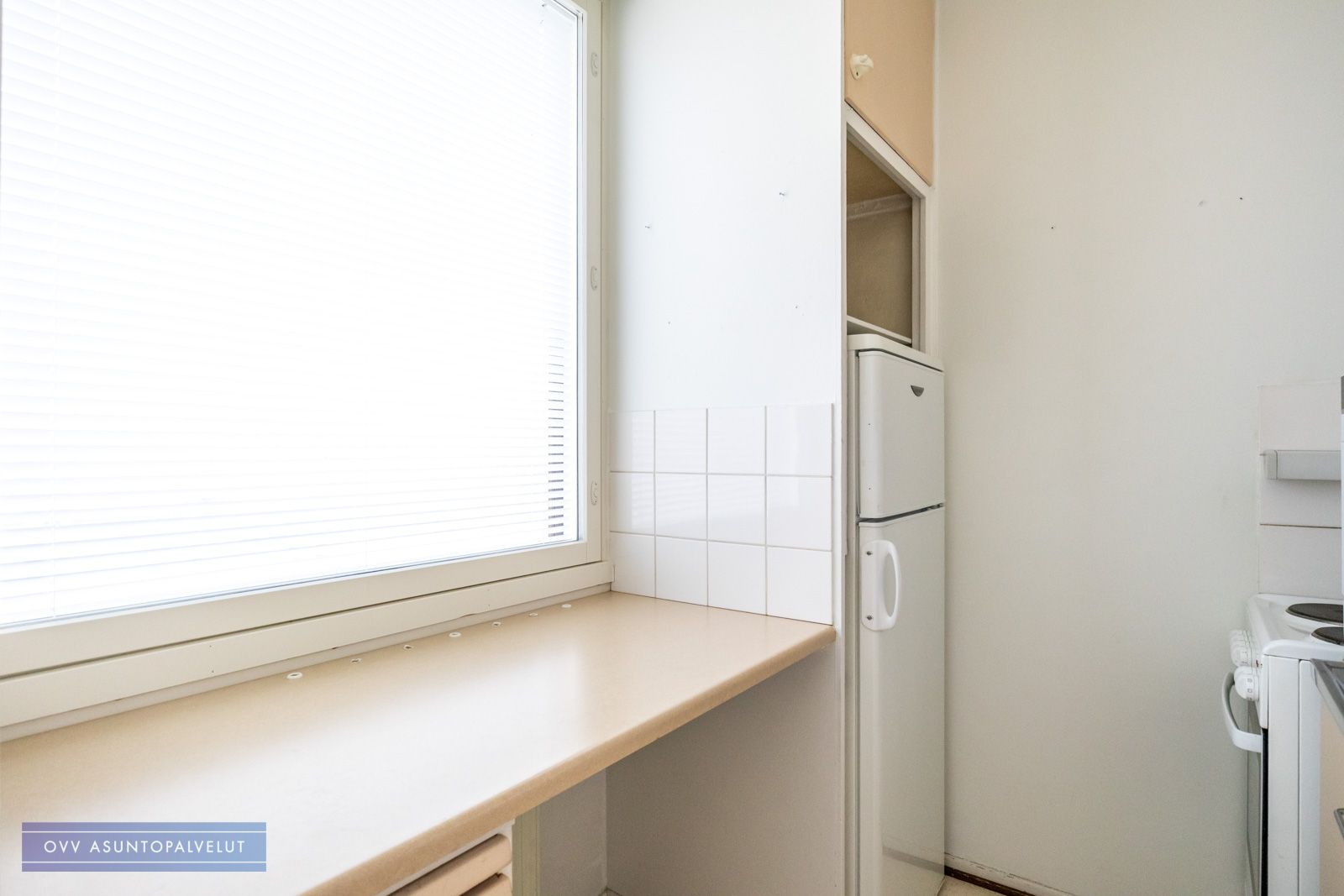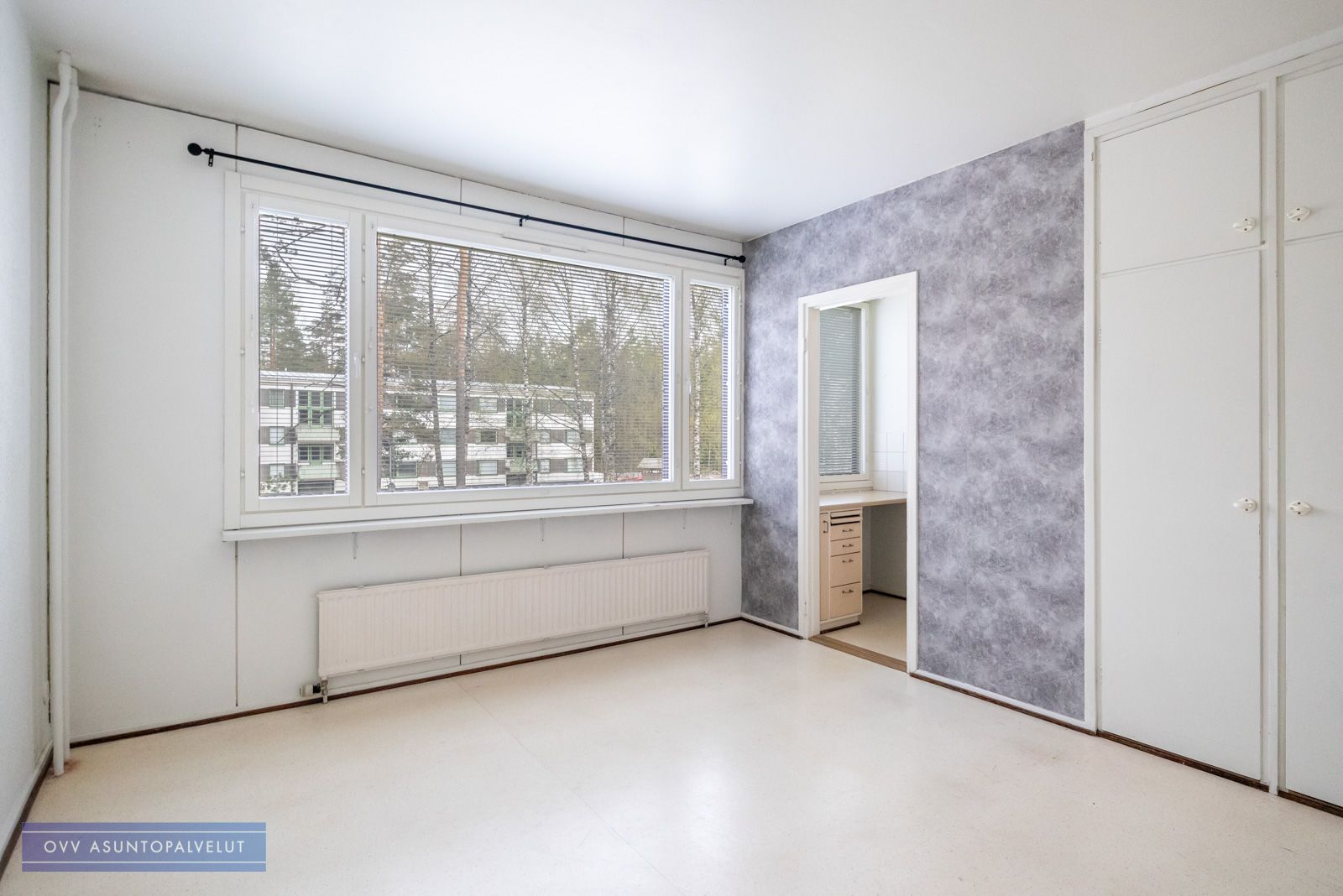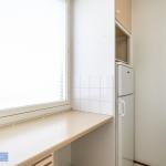 Olohuoneessa kaappitilaa ja käynti erilliseen keittiöön. Ikkunoista näkymä puistomaiselle talon piha-alueelle. Keittiössä hyvin laskutilaa ja kaapistoja.